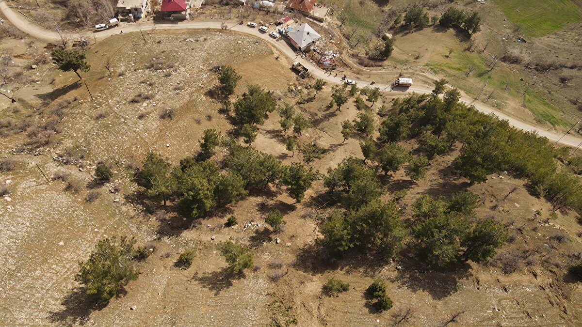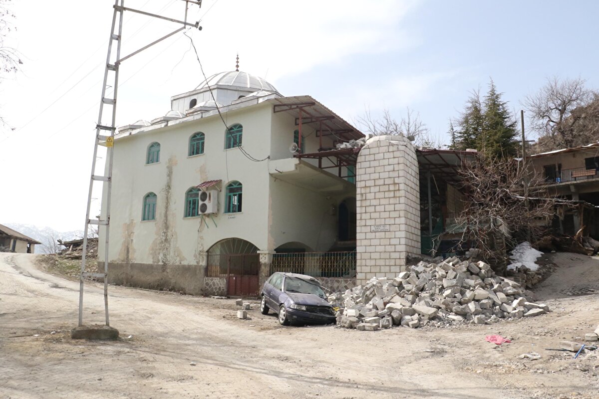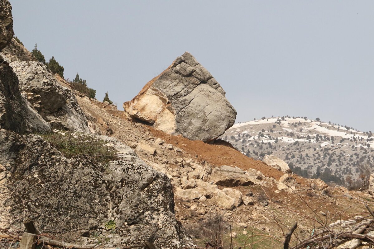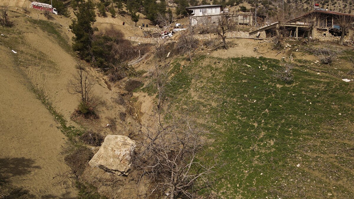 Kahramanmaraş'a yaklaşık 50 kilometre mesafede olan Şahinkayası Mahallesi'nde 6 Şubat'ta meydana gelen ikinci depremde, yüksek tepelerden kopan büyük bir kaya parçası aşağı yuvarlandı.