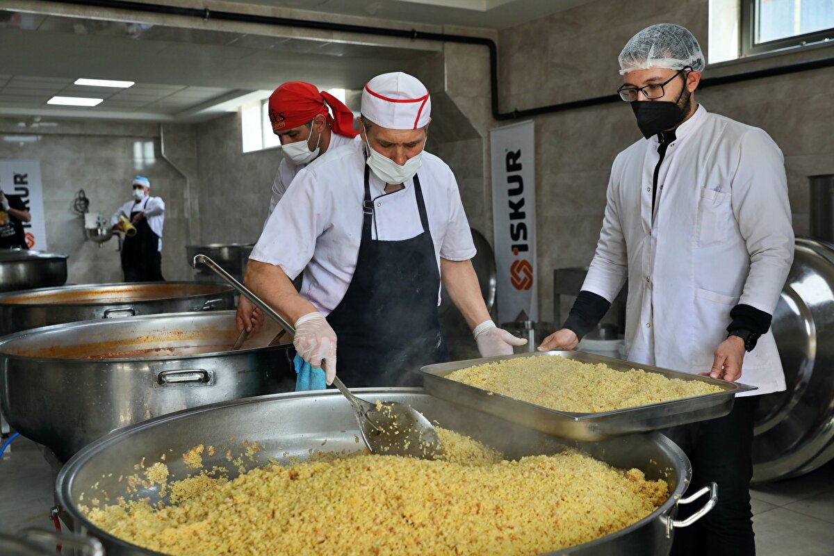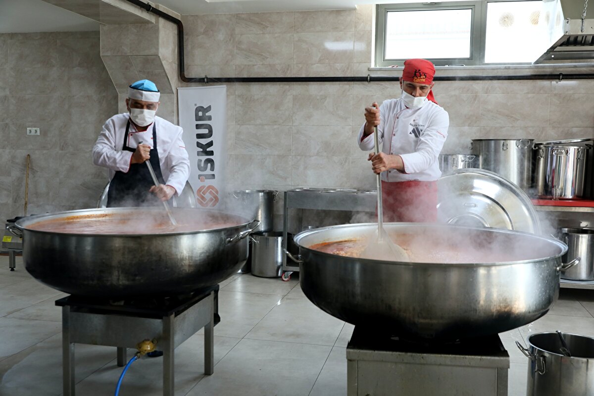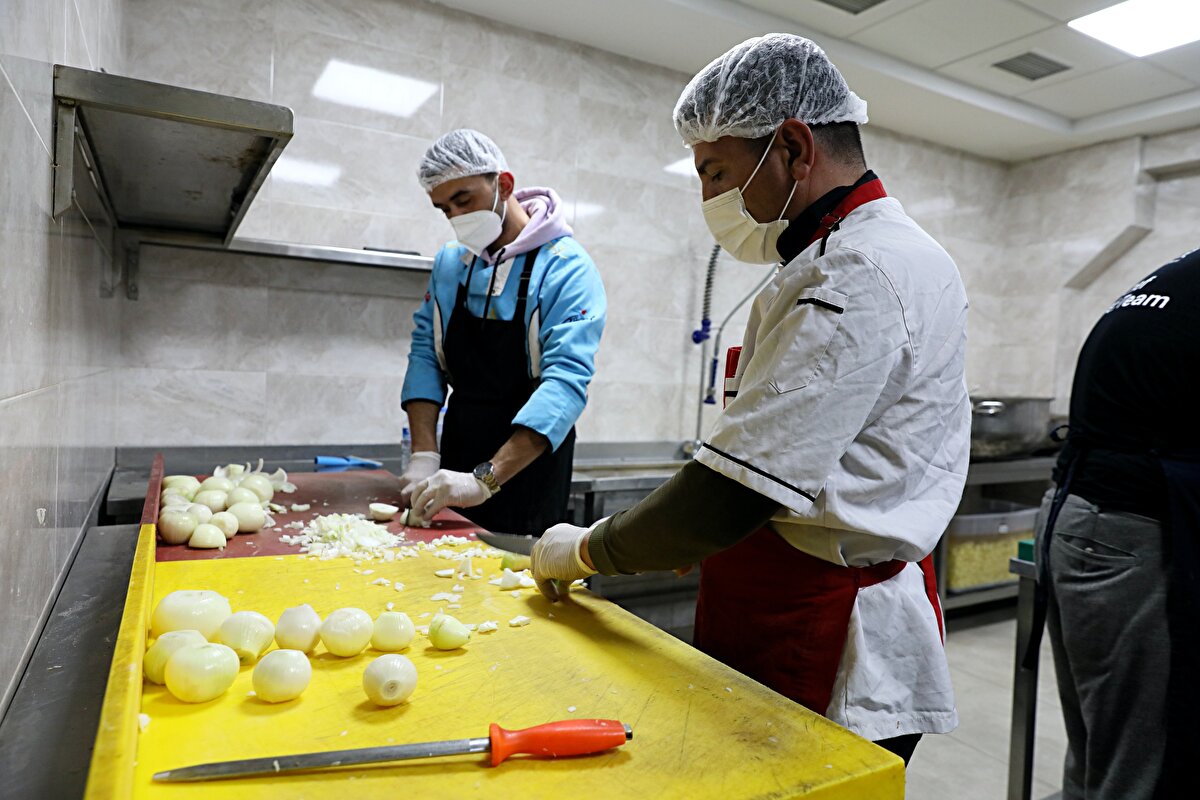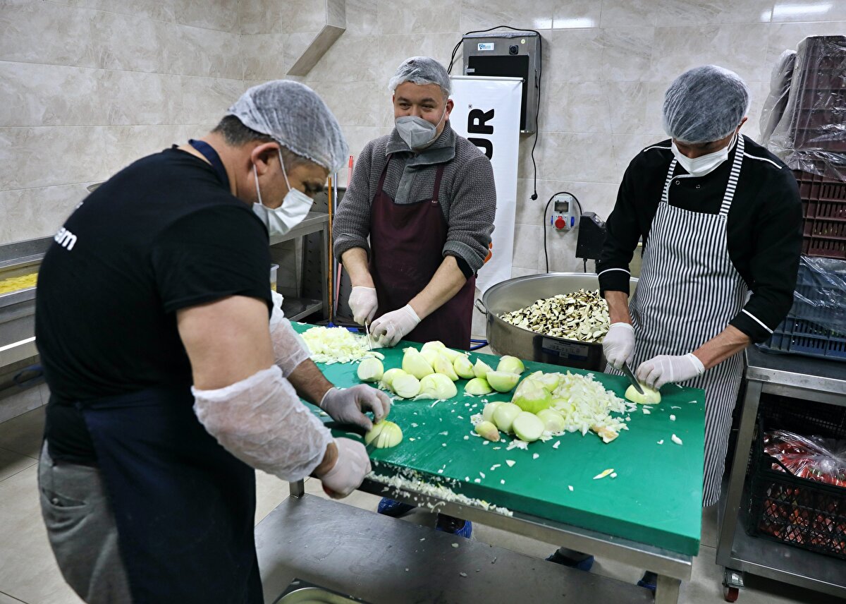Fabrikanın hasar almayan ve işçiler için yemek hizmeti sunulan mutfak bölümünde Türk Kızılay ve Kahramanmaraş Yemek Sanayi desteğiyle depremzedeler için günlük üç öğün yemek hazırlanıyor.