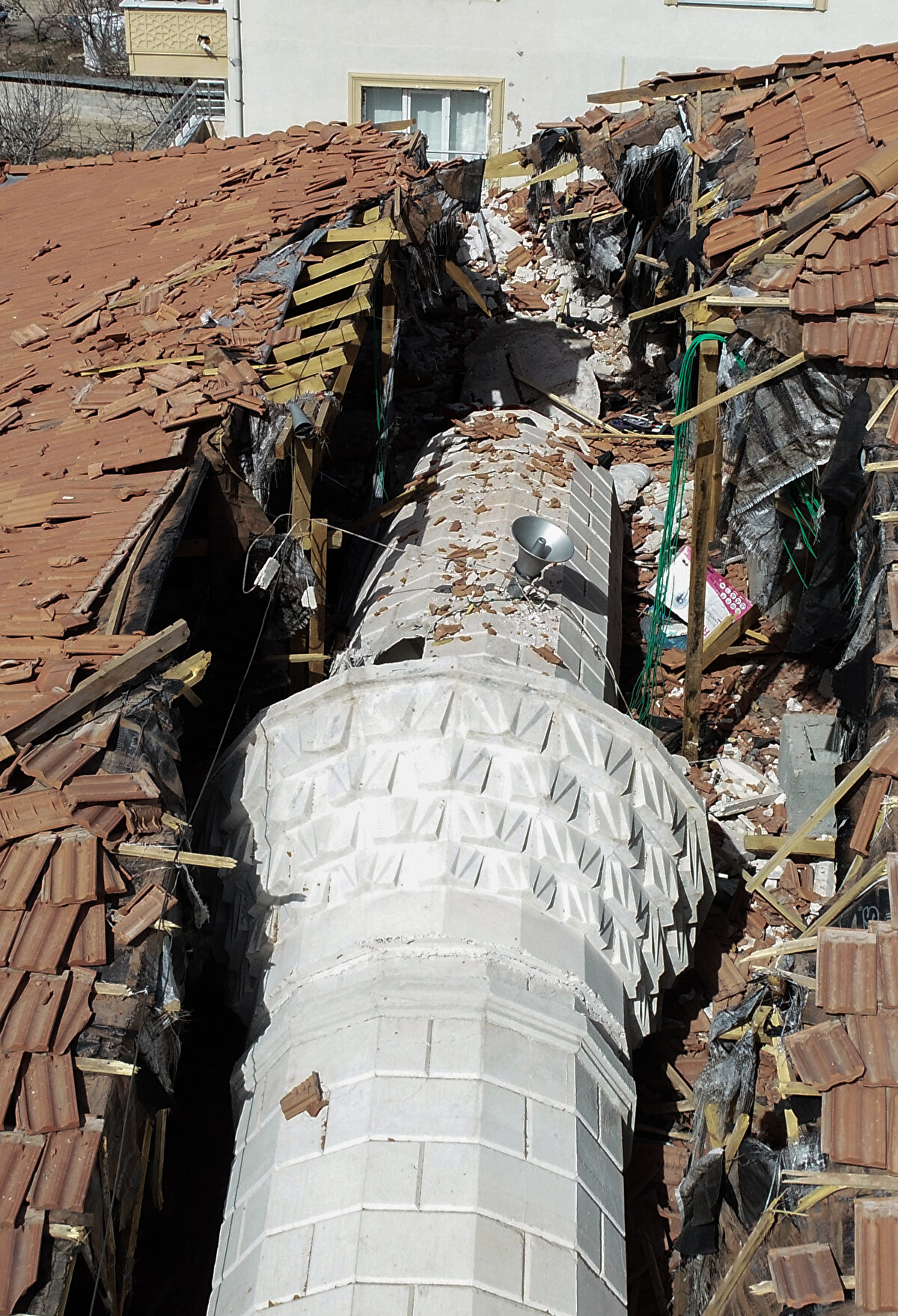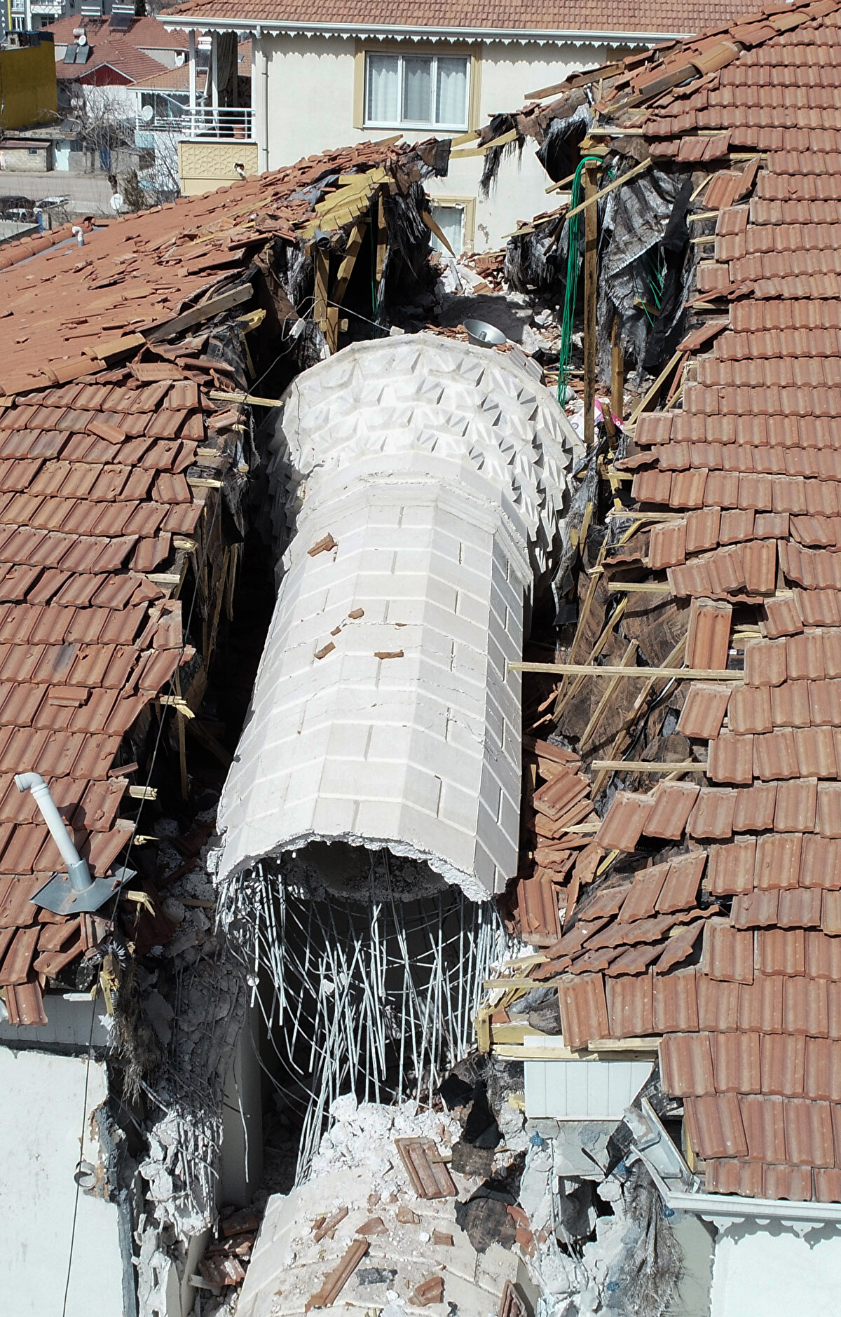 Minarenin apartmanın çatı kısmından alt kata doğru tek parça halinde devrilmesi dikkati çekti.