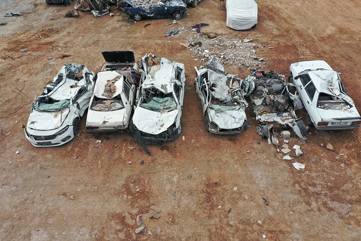 Yürütülen çalışma sonucu çoğunluğu enkaz altından çıkarılan ve boş bir araziye götürülen araçlar, polis ekiplerince korunuyor.