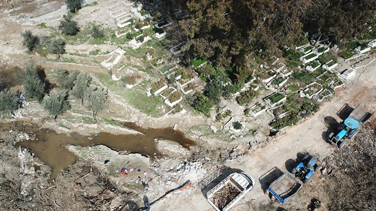 Hatay'da enkaz kaldırma ve hasar tespit çalışmaları devam ederken, depremlerin Demirköprü Asri Mezarlığı'nda da ağır tahribata neden olduğu ortaya çıktı. Hasar nedeniyle mezarlıktaki 50 mezarın nehir sularında kaybolduğu iddia edildi.