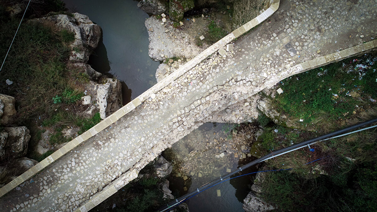 Kahramanmaraş merkezli depremlerin hafif hasar verdiği köprünün bir kısmı, merkez üssü Defne ilçesi olan 6,4 büyüklüğündeki sarsıntıda yamaçtan düşen kayalar nedeniyle yıkıldı.