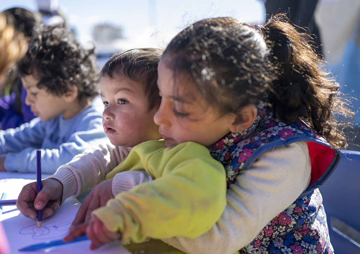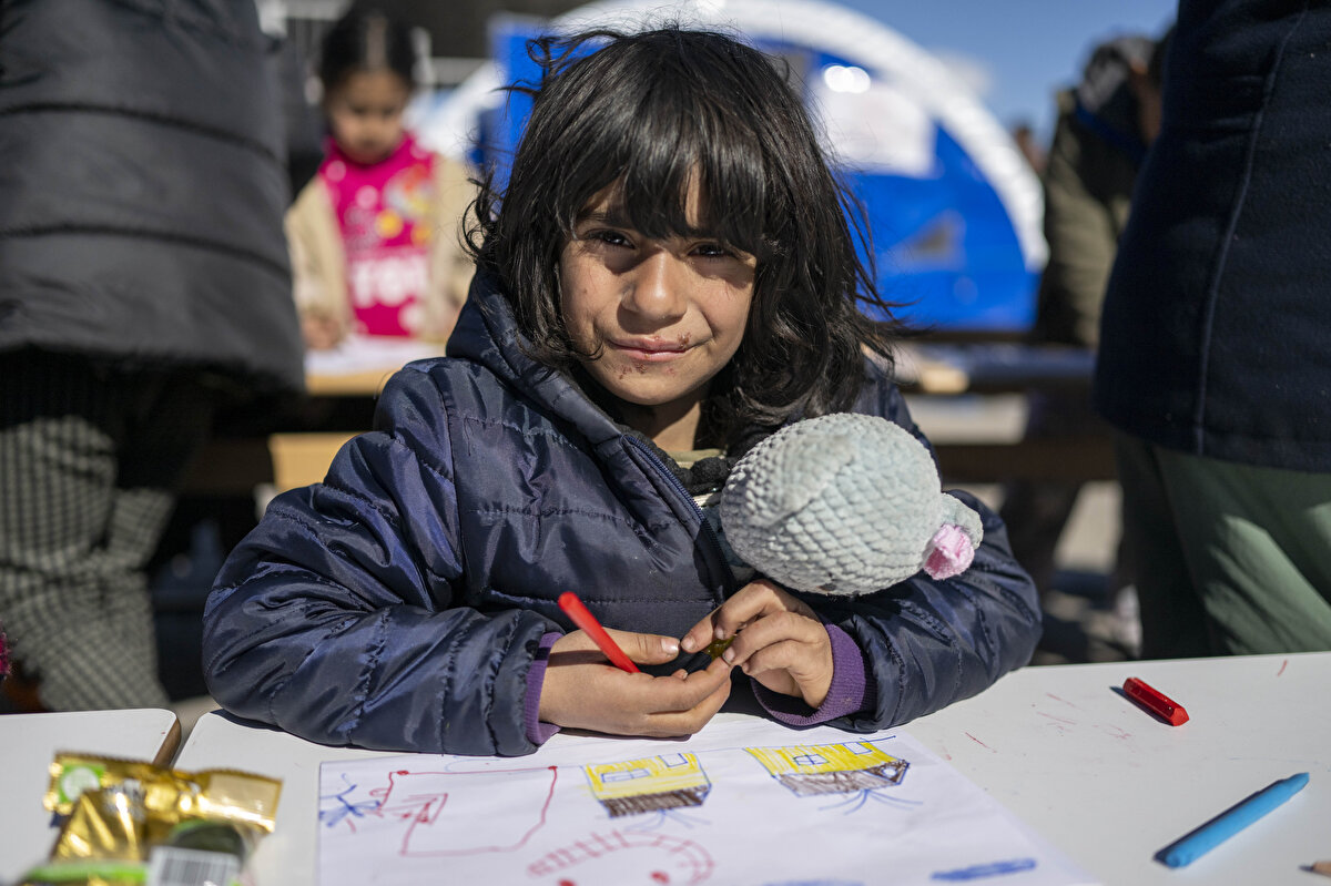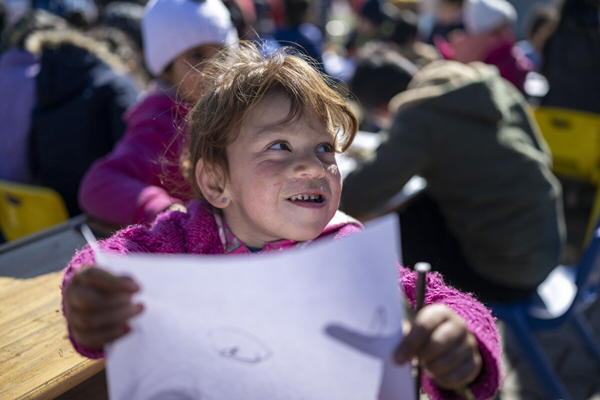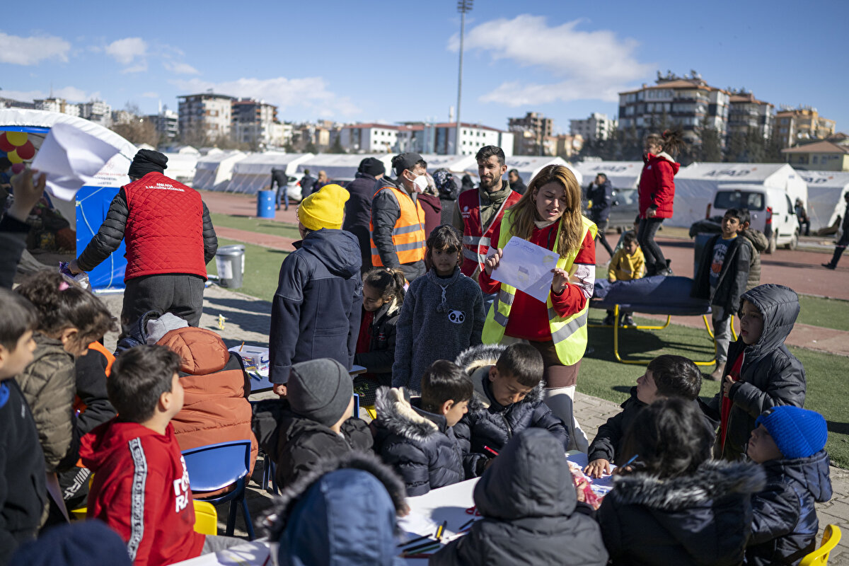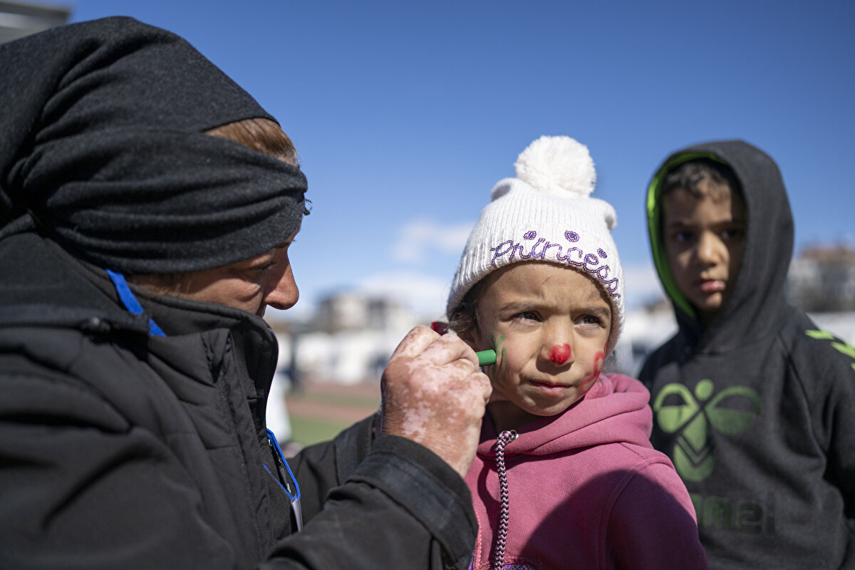 Antalya ve Batman`dan gelen 25 gönüllü öğretmenle resim yapan, oyun oynayan çocuklara psikososyal destek de veriliyor.