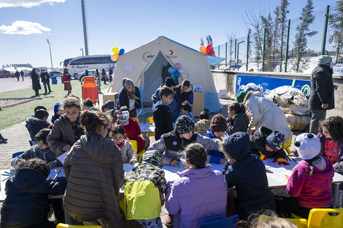 Kahramanmaraş merkezli depremlerin etkilediği Adıyaman'da kurulan çadır kentte oluşturulan oyun alanında çocuklar köy resmi çizdi.