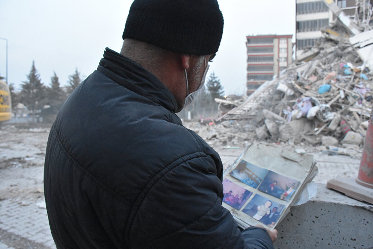 Kahramanmaraş merkezli depremlerden etkilenen Malatya'da, bir bölümü yıkılan apartmanın sakinleri, yıkımını hüzünle izledikleri binanın enkazından hatırası olan bazı eşyalarını kurtarmaya çalışıyor.