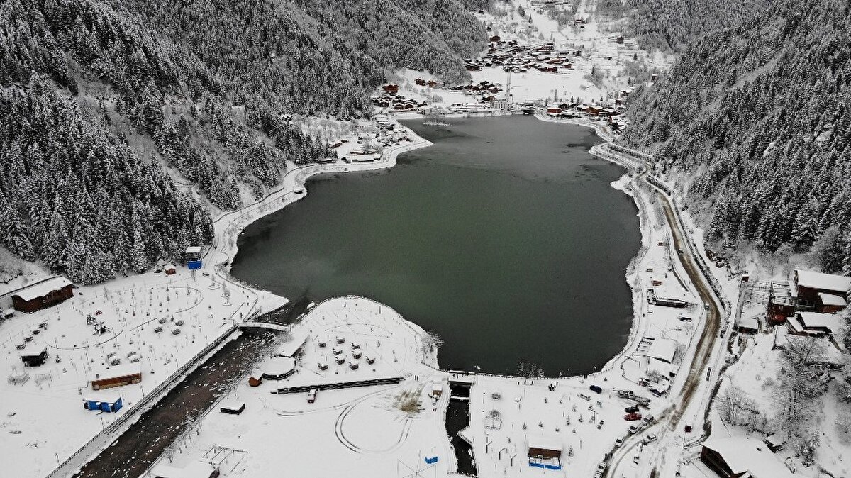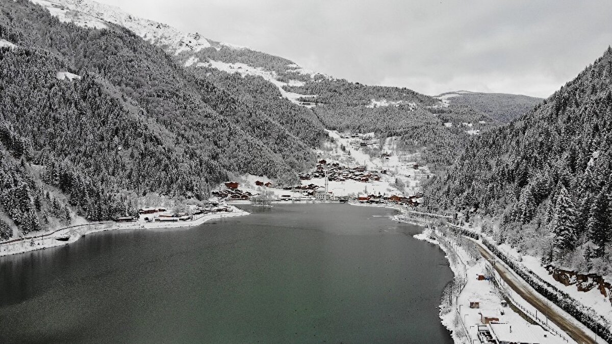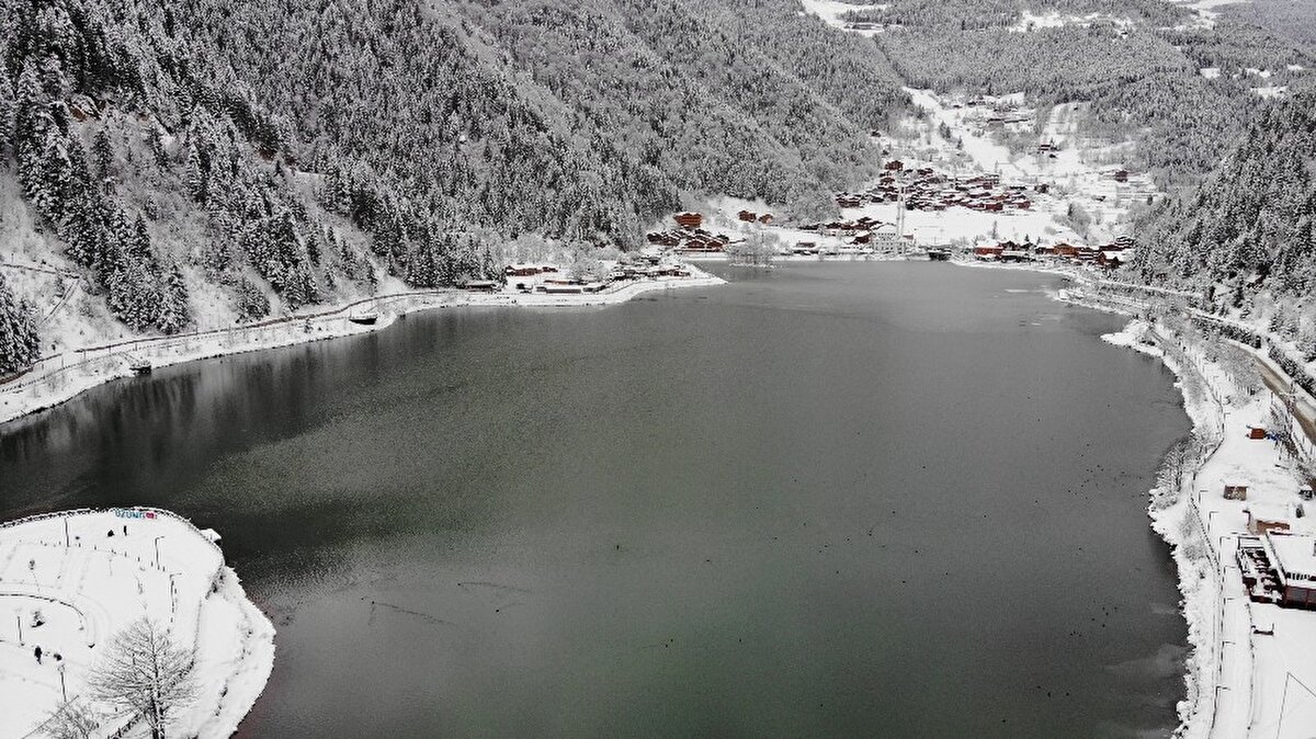 Hava sıcaklığının sıfırın altına düşmesi ile gölde donma gözlenirken, beyaz görüntüsüyle seyrine doyumsuz eşsiz manzaralar oluşturan Uzungöl havadan görüntülendi.