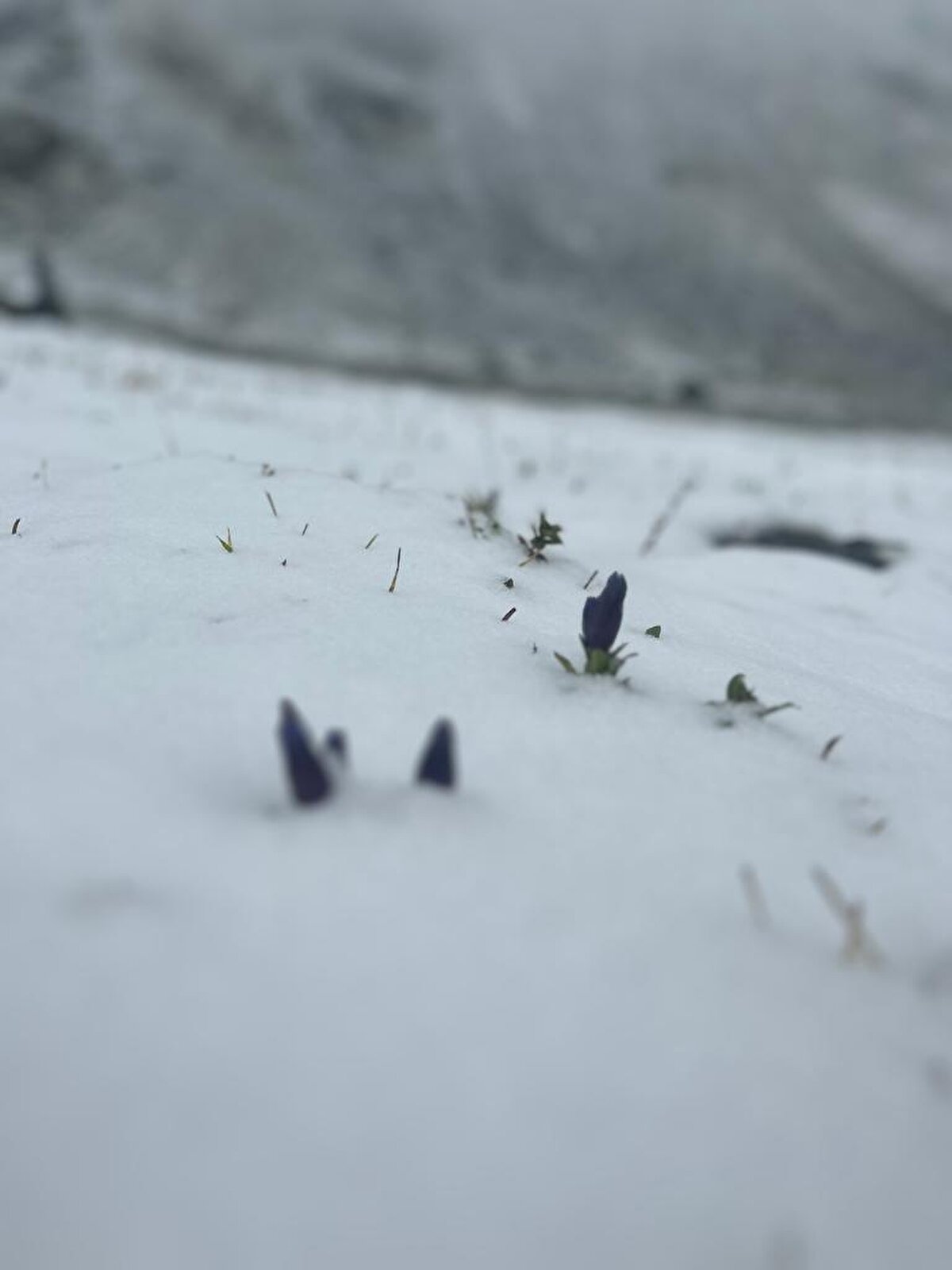 Rize'de Kaçkar Dağı eteklerinde Derebaşı mevkisindeki konaklama tesisinin çevresi, kar yağışının etkisiyle beyaza büründü.