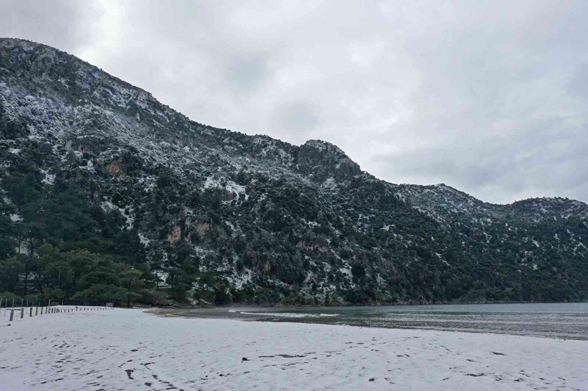 Muğla'nın Ortaca ilçesinde gece saatlerinde etkisini gösteren kar yağışı başladı. Dünyanın en iyi açık alanları arasında yer alan İztuzu Plajı karla kaplandı.