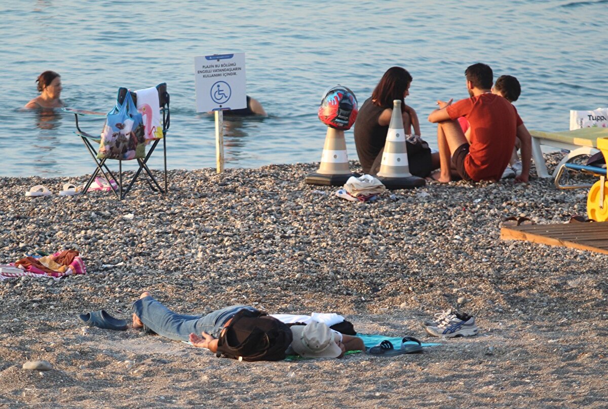 Günün tüm saatlerinde tatilcileri ağırlayan Konyaaltı Sahili’nde, bazı vatandaşların kalabalık arasında uyumaya devam ettiği görüldü.