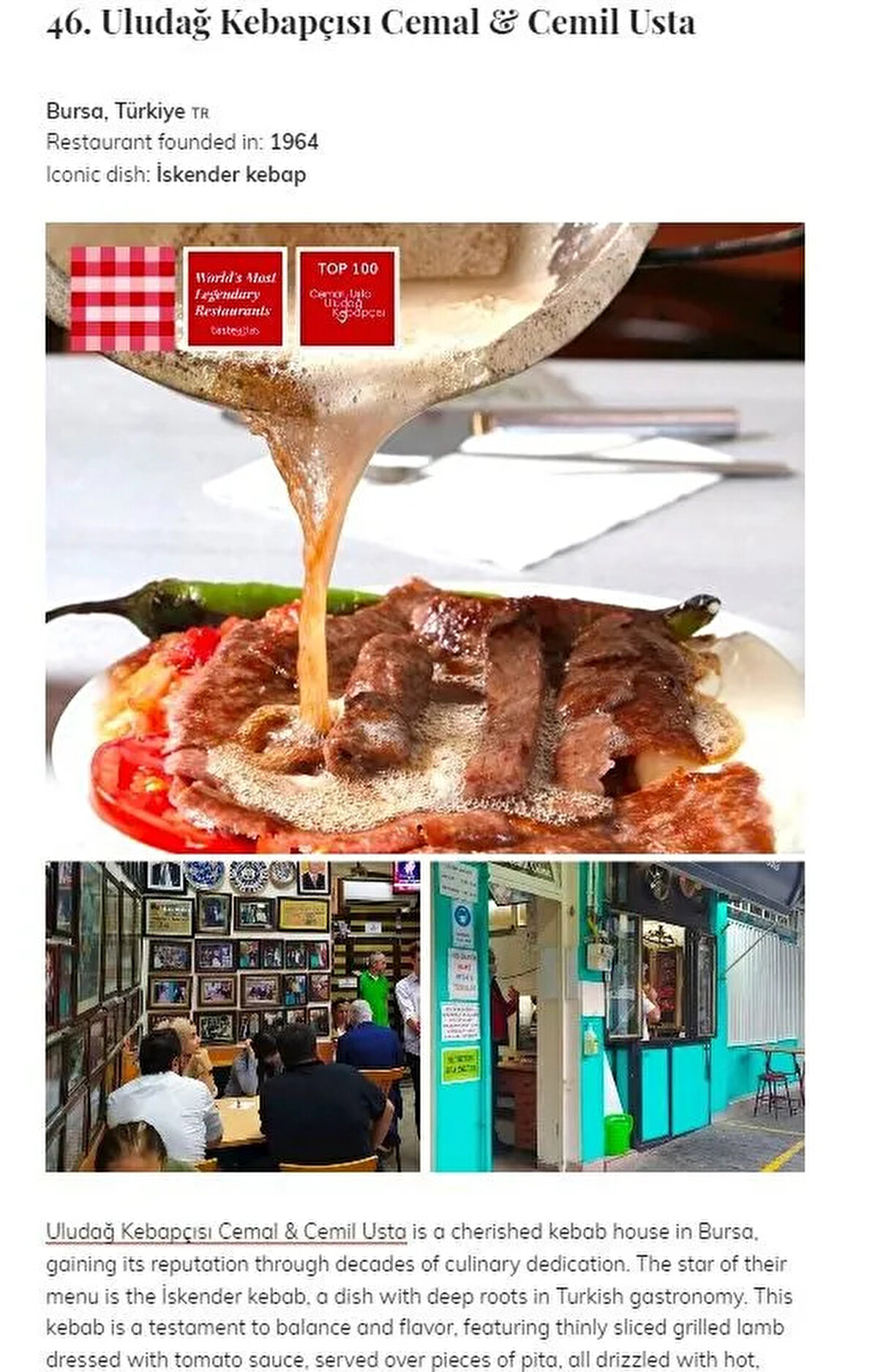 Hırvatistan merkezli Taste Atlas sitesi, 'Dünyanın En Efsanevi 150 Lokantası' listesini yayınlandı. Listeye Türkiye'den 6 lokanta girerken en üst sırayı ise 35. sıradan Gaziantep İmam Çağdaş lokantası aldı. Bursa Uludağ Kebapçısı 46'ncı, Antalya 7 Mehmet lokantası 52'nci, İstanbul'dan sırasıyla Sultanahmet Köftecisi 78'nci, Çiya Sofrası 120'nci ve Hacı Abdullah 121'nci olarak listede yerini aldı.