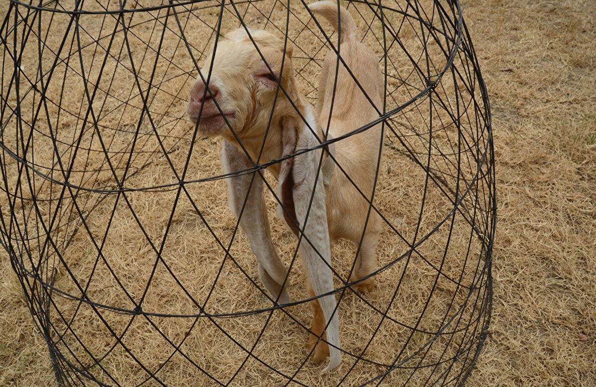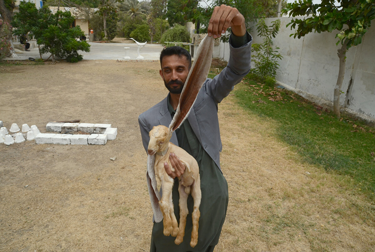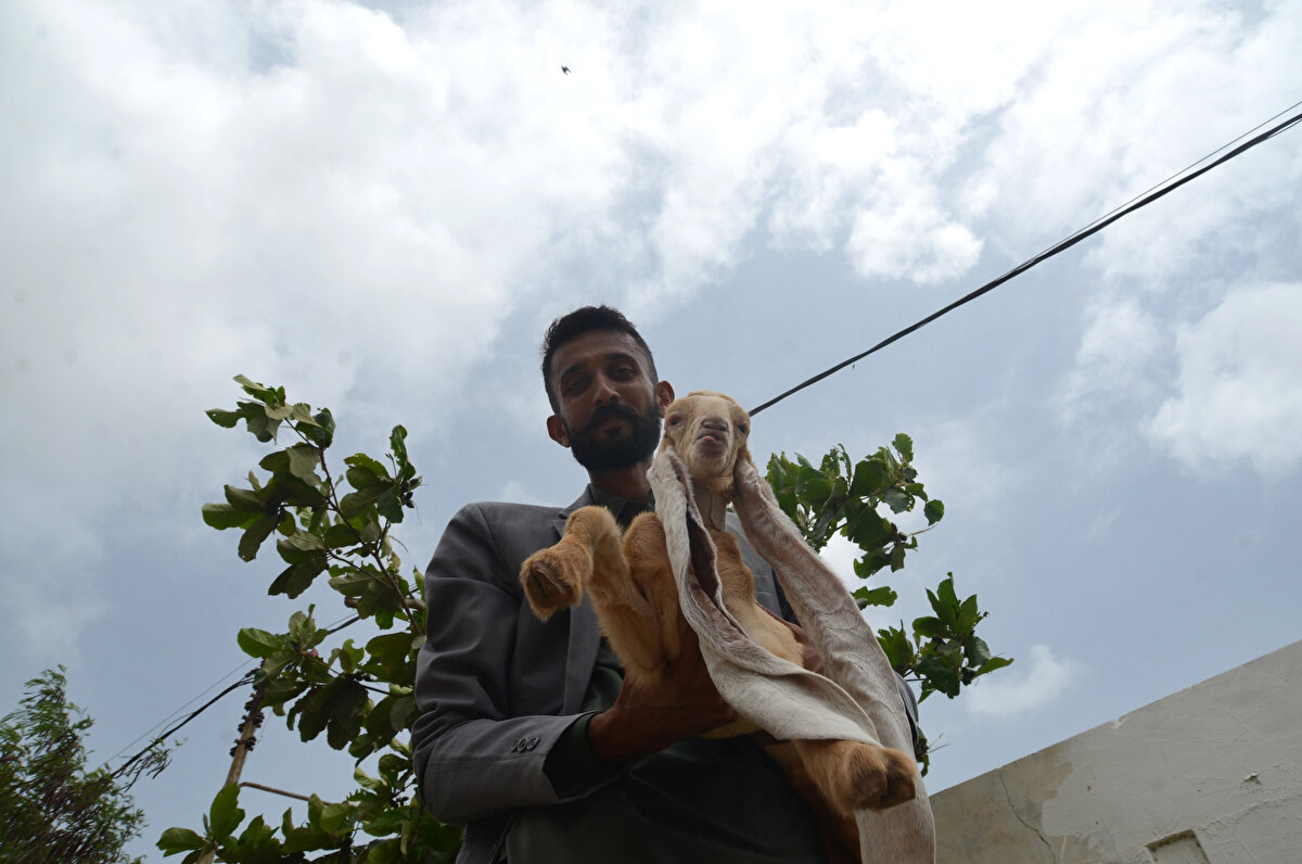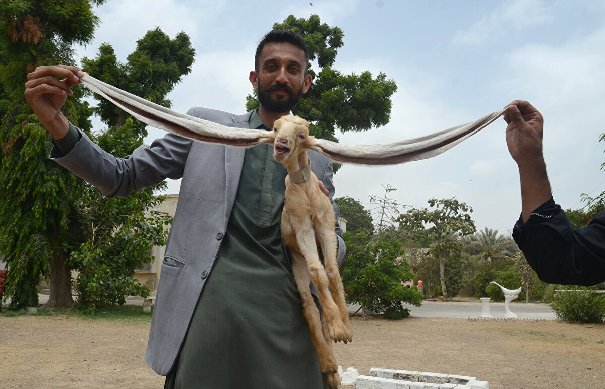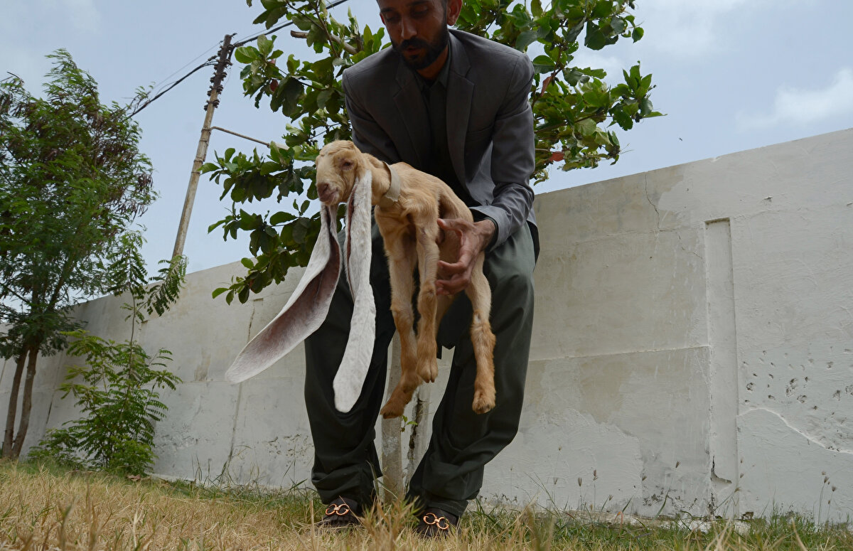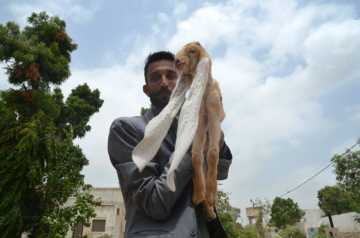 Pakistan'ın Karaçi şehrinde doğan uzunluğu 48 cm'e ulaşan kulaklarıyla "dünyanın en uzun kulaklı keçisi" olarak bilinen Simba isimli yavru keçi görüntülendi.