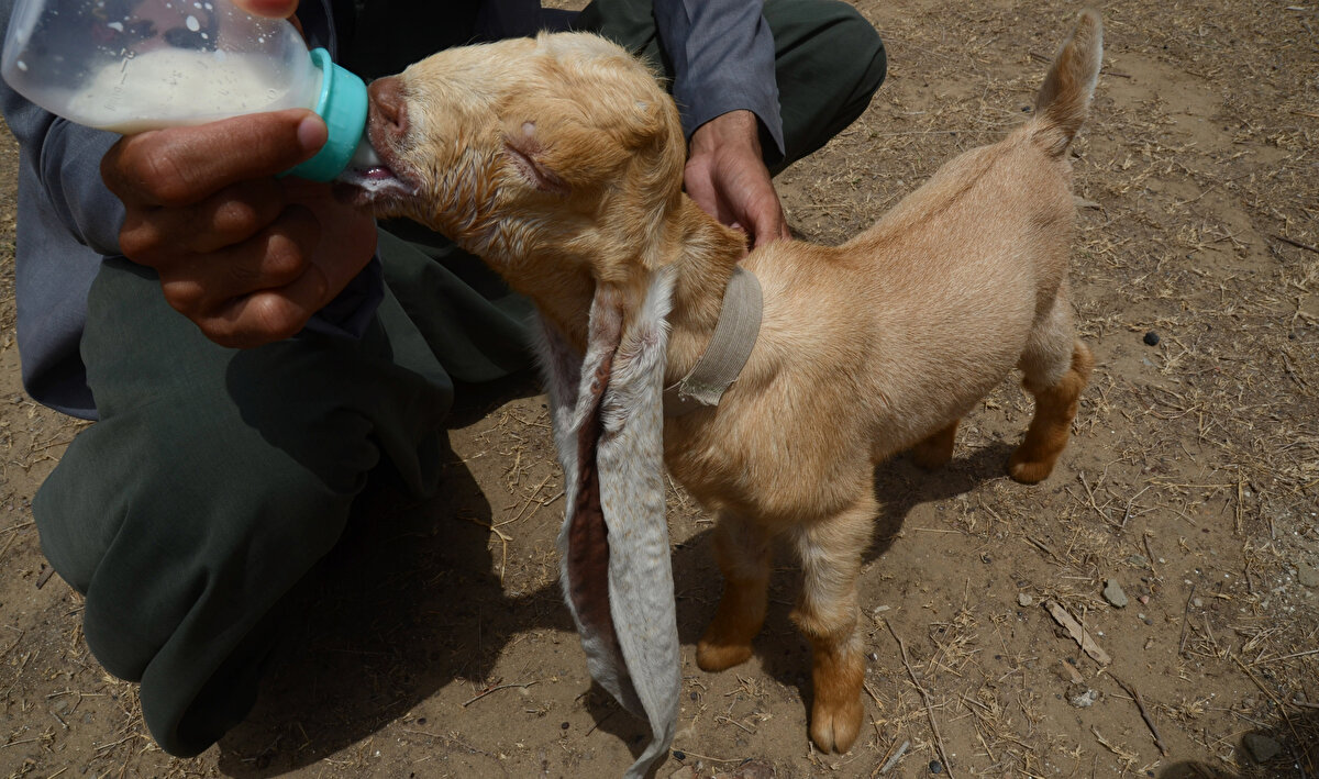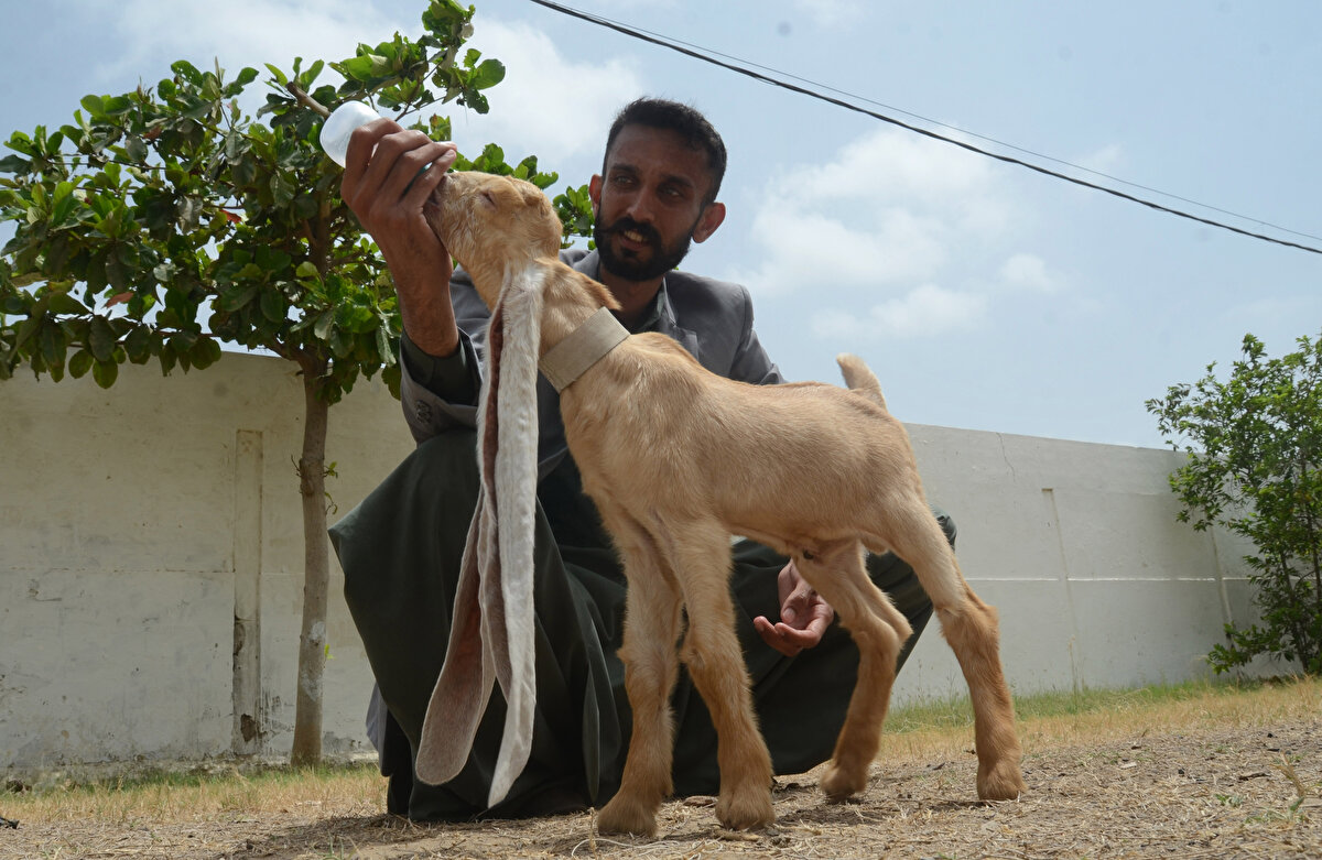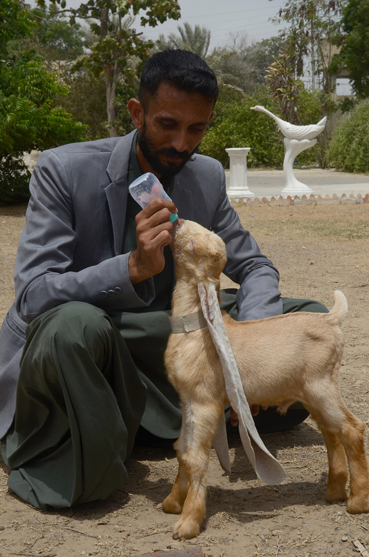 Simba`nın sahibi Muhammad Hassan Narejo, sevimli keçiyi biberonla besliyor.