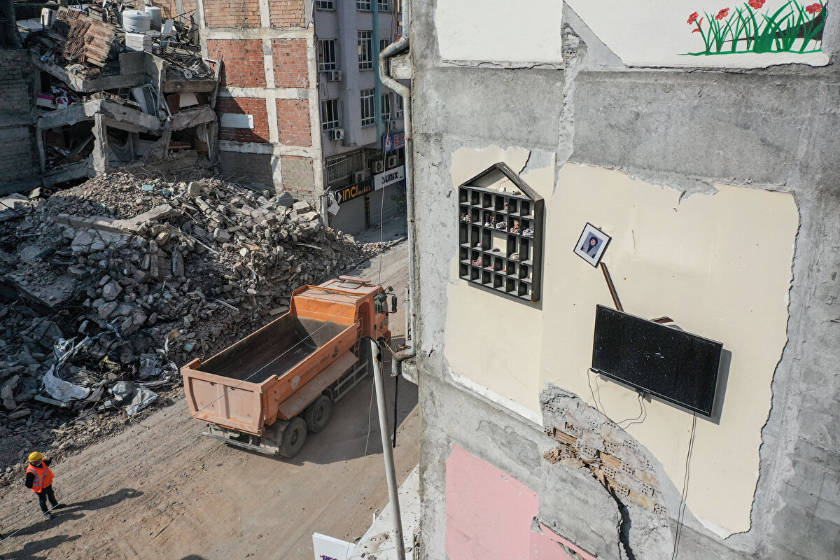Kahramanmaraş'ın Pazarcık ve Elbistan ilçeleri merkezli 11 ili etkileyen 7,7 ve 7,6 büyüklüğündeki depremlerden en fazla etkilenen kentlerden Hatay'ın Antakya ilçesinde, afetten önceki en işlek merkezlerden Ulucami Mahallesi Kemalpaşa Caddesi'nde bulunan 5 katlı apartman enkaza döndü. Sakinlerine mezar olan binanın iç duvarının örülmediği, iç duvar olarak bitişikteki apartmanın yan duvarının kullanıldığı, depremin ardından yaşanan yıkımla anlaşıldı.