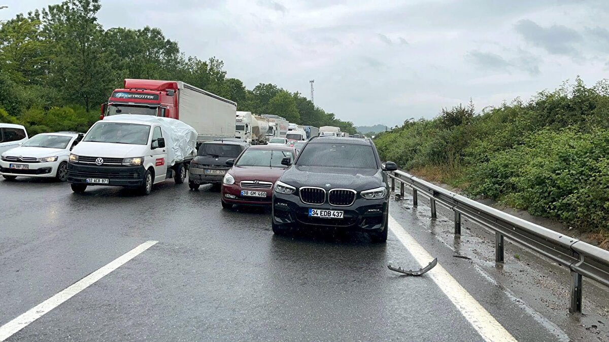 Düzce'de Anadolu Otoyolu'nda bir yolcu otobüsü, bir TIR ve 8 otomobilin karıştığı zincirleme trafik kazasında ilk belirlemelere göre 4 kişi yaralandı. Kaza nedeniyle yolun Ankara istikametine ulaşım tek şeritten sağlanırken, uzun araç kuyrukları oluştu.