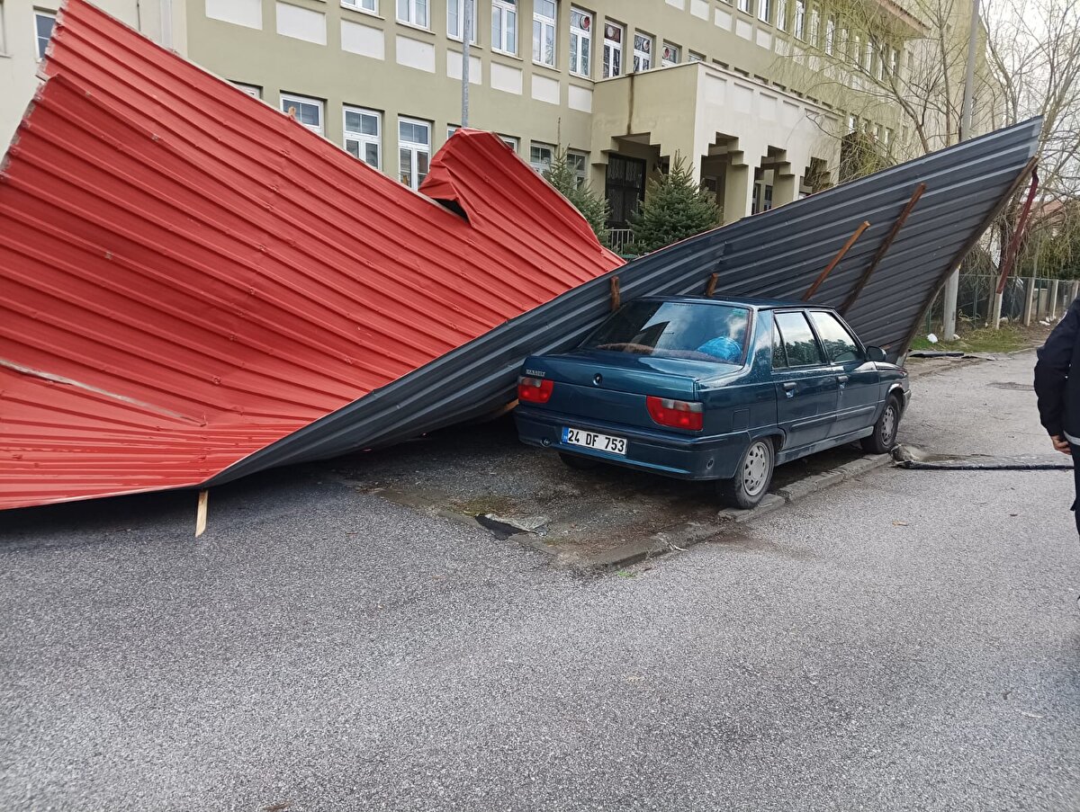 Erzincan Ortaokulu'nun sac kaplama çatısı da bahçede park halindeki otomobilin üzerine düştü.