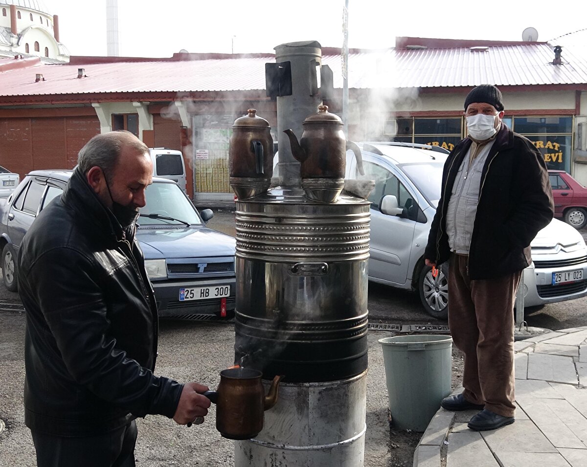 Kent merkezindeki cadde ve sokaklarda kurdukları semaverlerde çay demleyen işletmeciler hem pandemi kurallarına uyuyor hem de soğuk kış günlerinde kıtlama çayı seven Erzurumluları çaysız bırakmıyor. Maske, hijyen ve temizlik kurallarına uyarak 1 liradan sattıkları çayla evlerine ekmek götüren kahvehane işletmecilerinin tek isteği pandemi günlerinin sona ermesi.