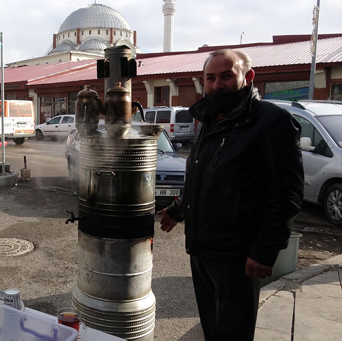 Merkez Yakutiye ilçesi Erzincankapı semtinde kurduğu semaverle vatandaşlara çay satan Nasır Dikilitaş, "Yasaklardan dolayı iş yerlerinin kapalı olması sebebiyle biz de semaveri dışarı atıp, sosyal mesafeyi koruyarak insanlara çay satıyoruz. Erzurum soğuk olduğu için talep iyi çok şükür evimize ekmek götürüyoruz" dedi.