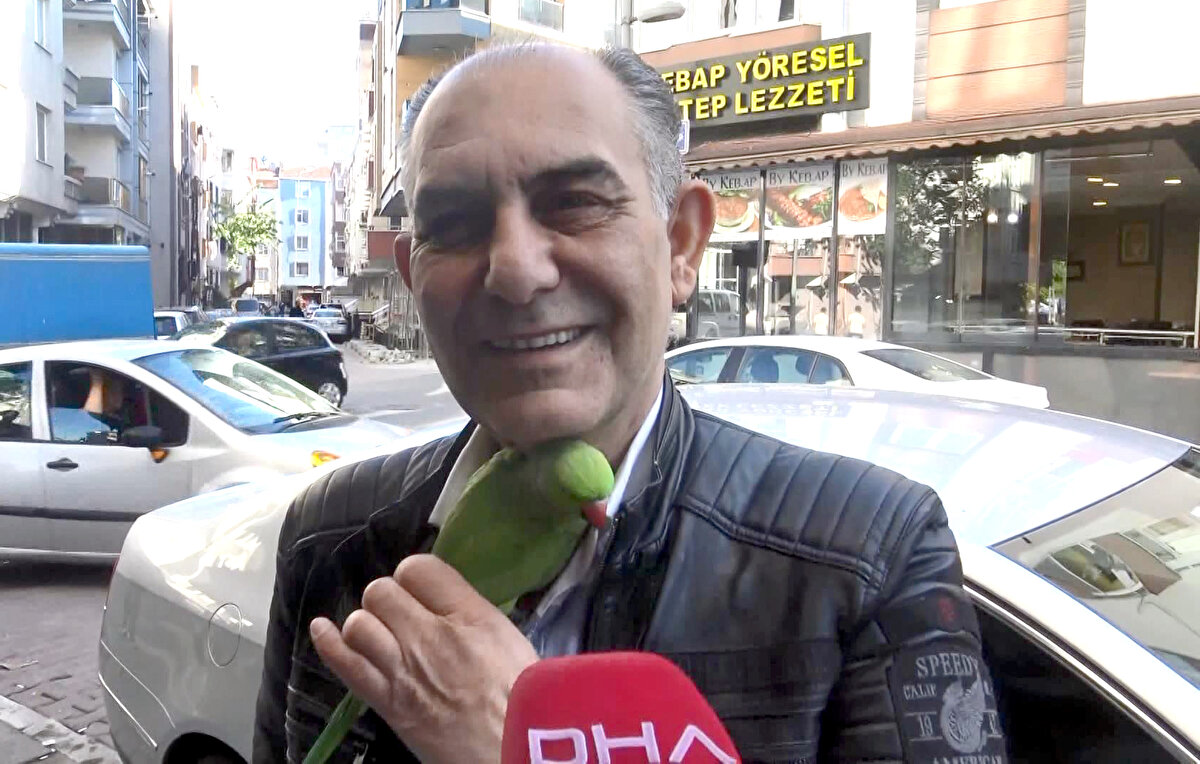 Avcılar'da oturan Recep Gökçe (58), 1 yıldan bu yana baktığı papağanını omuz ve yakasında taşıyarak gezdiriyor.