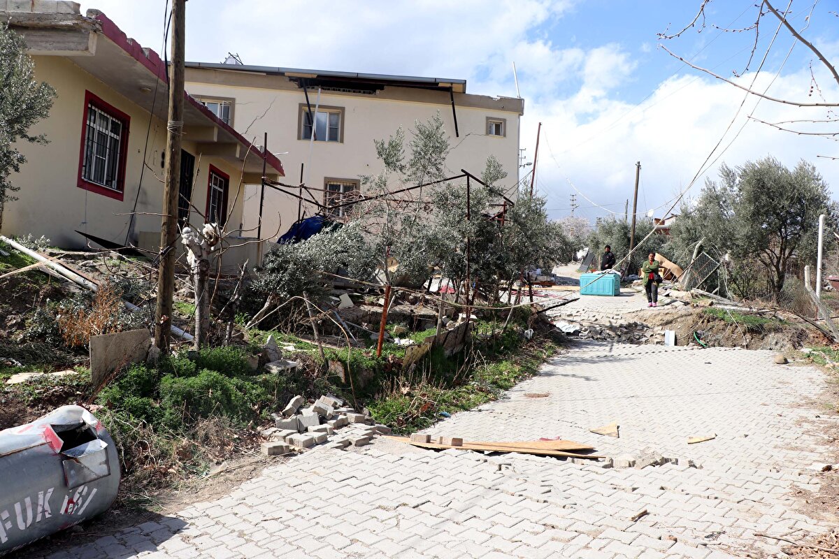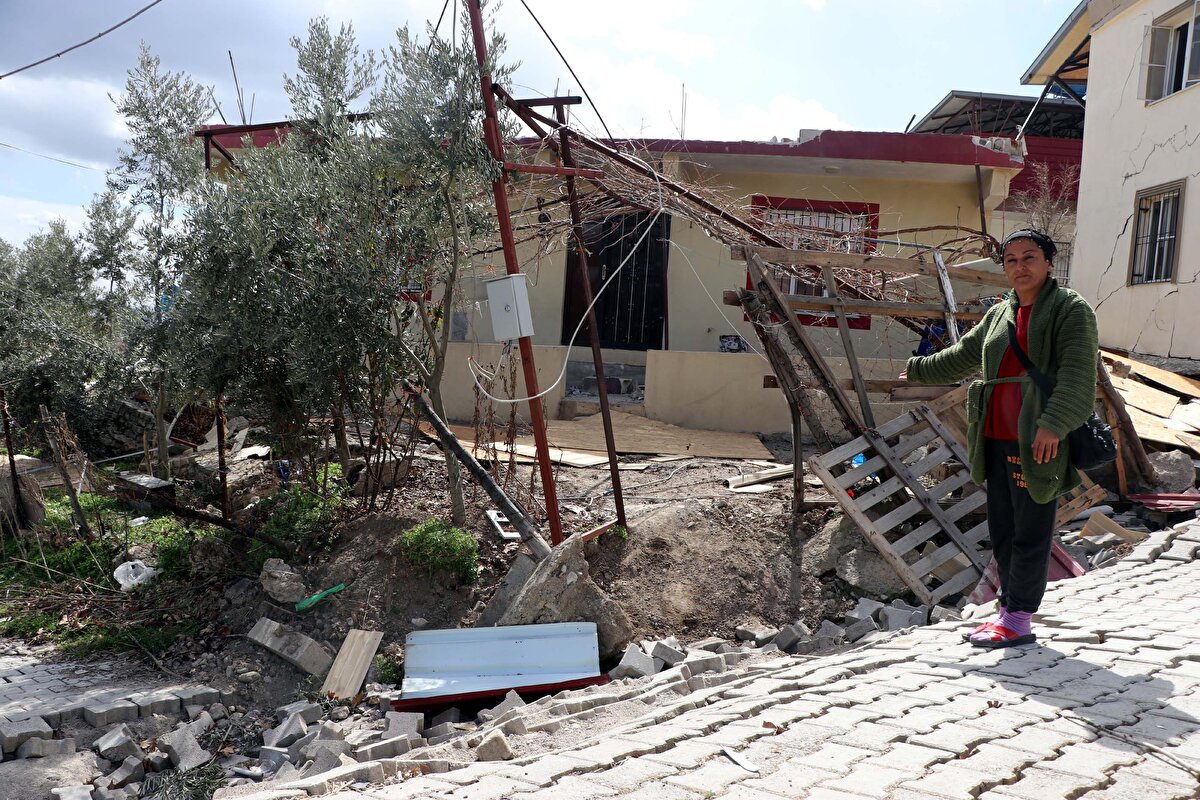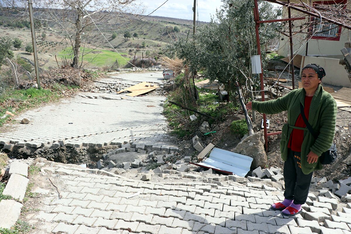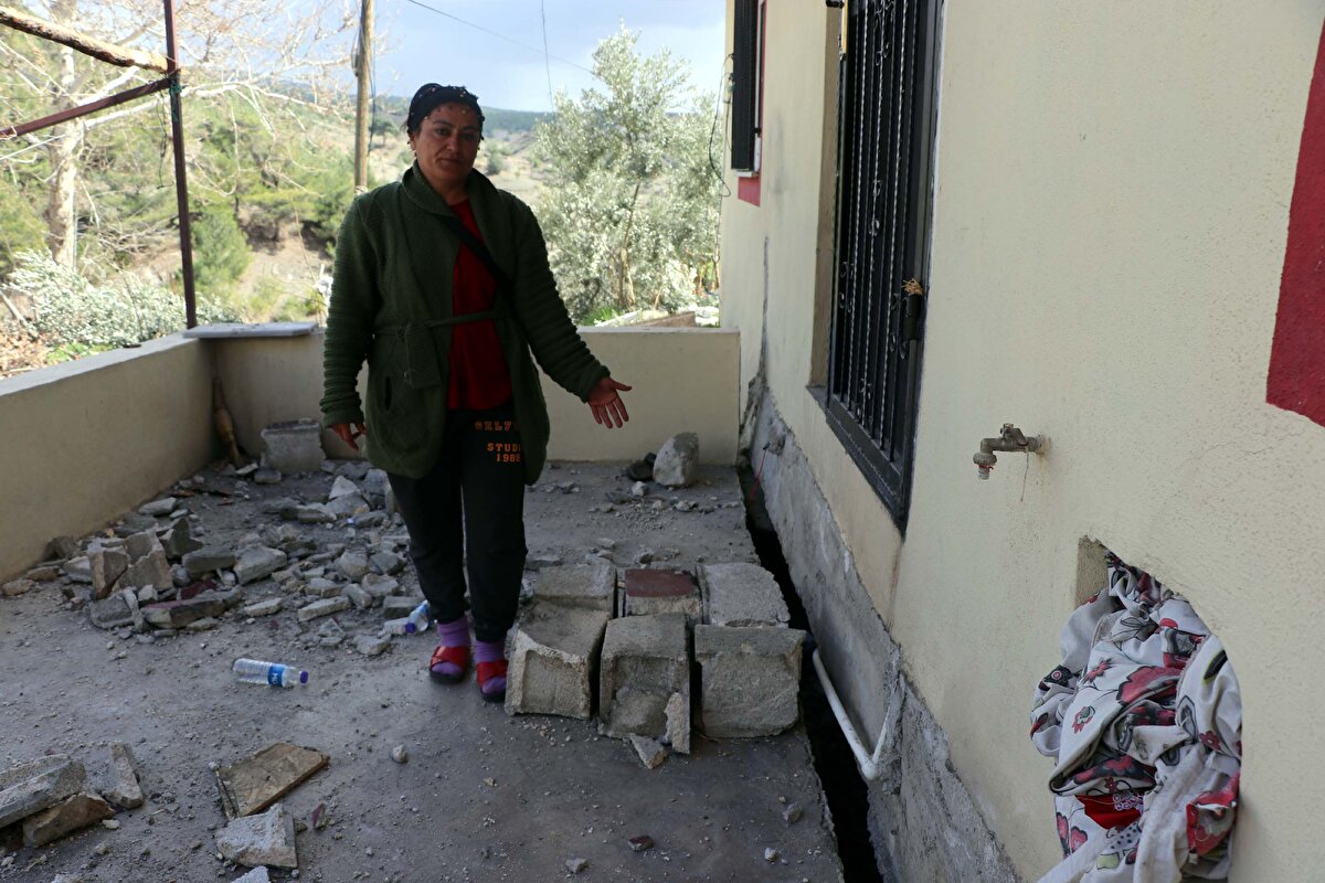 Evin zemininde de boşluklar meydana geldi. Depremde yaşadıklarını anlatan Hatice Renkliöz, "Deprem günü bir kıyametti. Ben buna 'deprem' diyemem. Çok kötüydü. Elektrikler gitti. Biz çarşıda oturuyorduk. 6 ay önce taşınmıştık. Yaşadığımız evin enkazından çıktık. Kapılar, pencereler açılmadı. Çok zor çıktık. Sonrasında buraya geldik. Burada 30 kaybımız var. Köy resmen enkaz altında. Fay hattı benim evimden geçmiş. Kayınım ve kaynanam diğer tarafta oturuyorlardı.