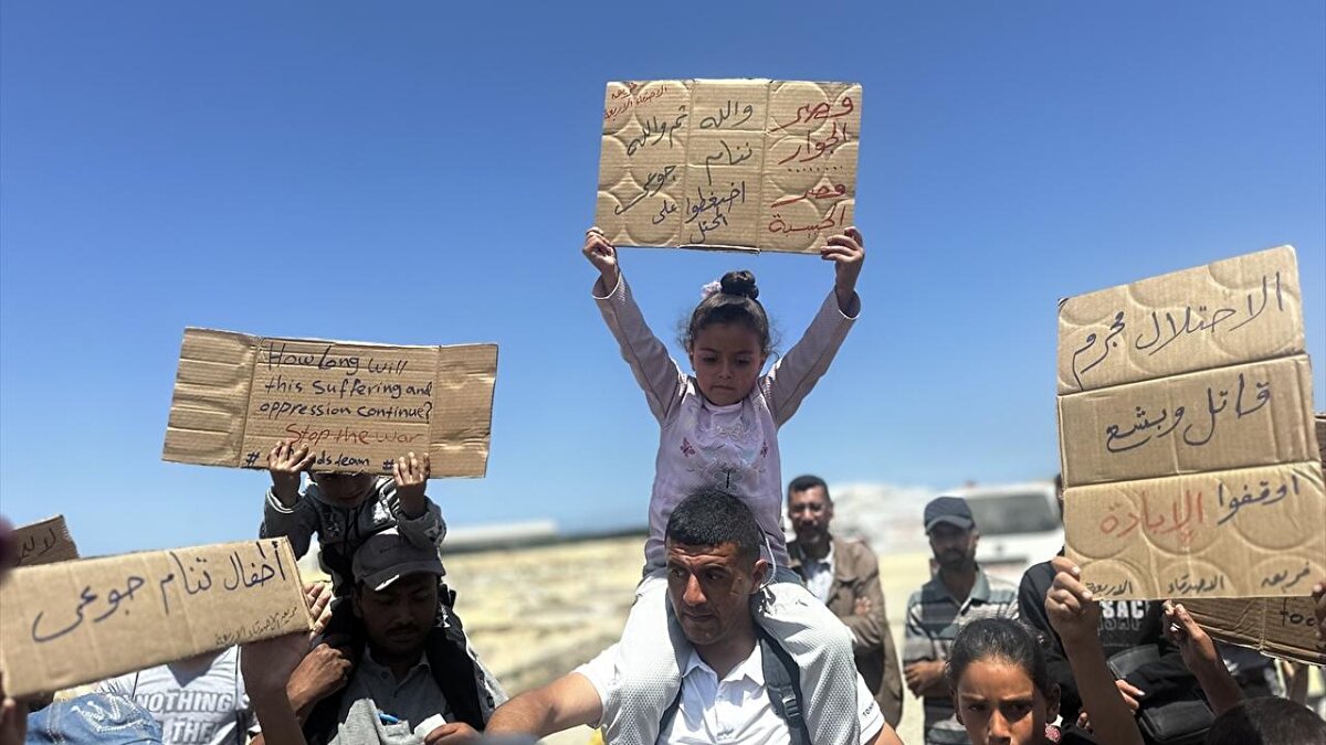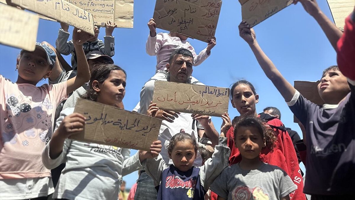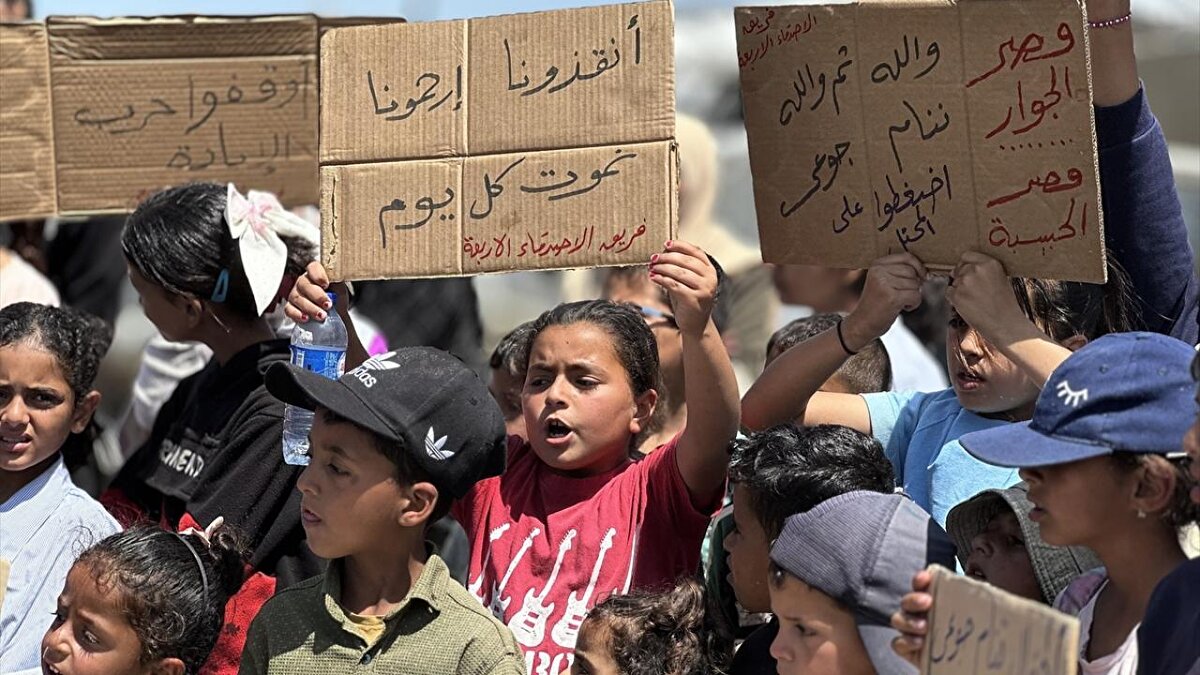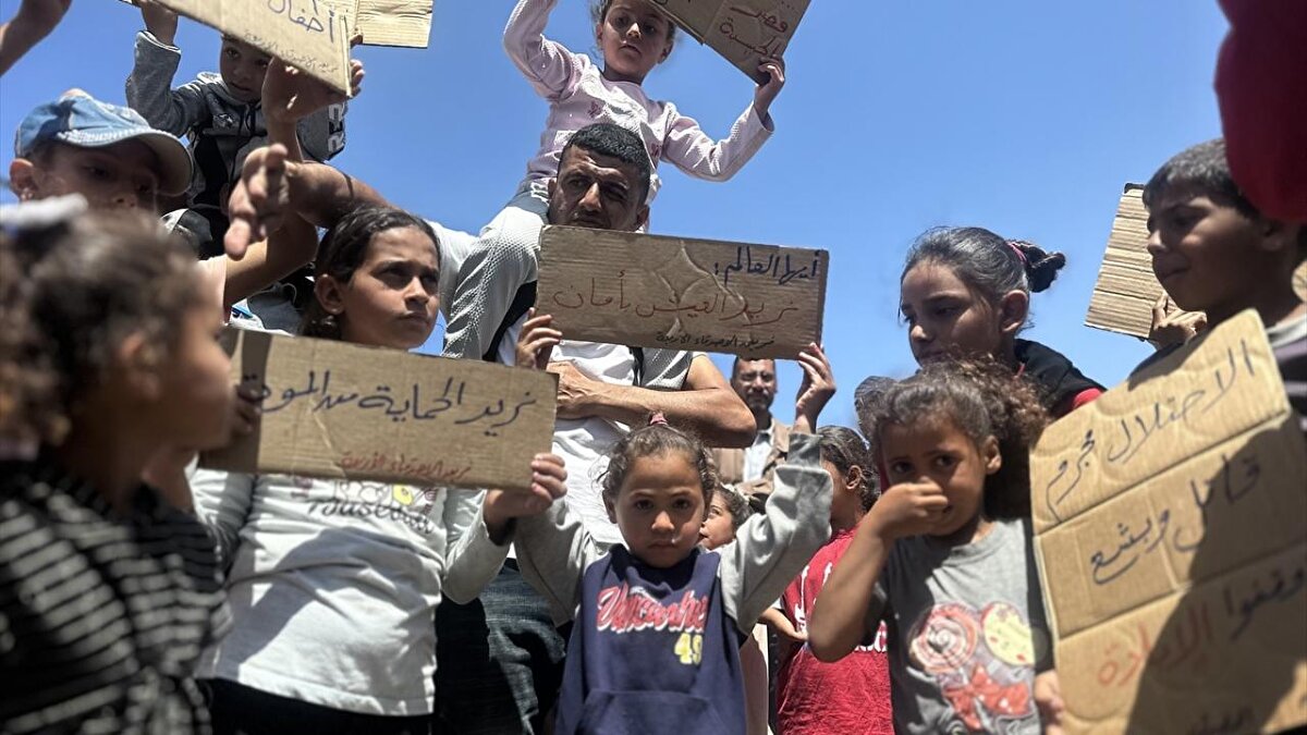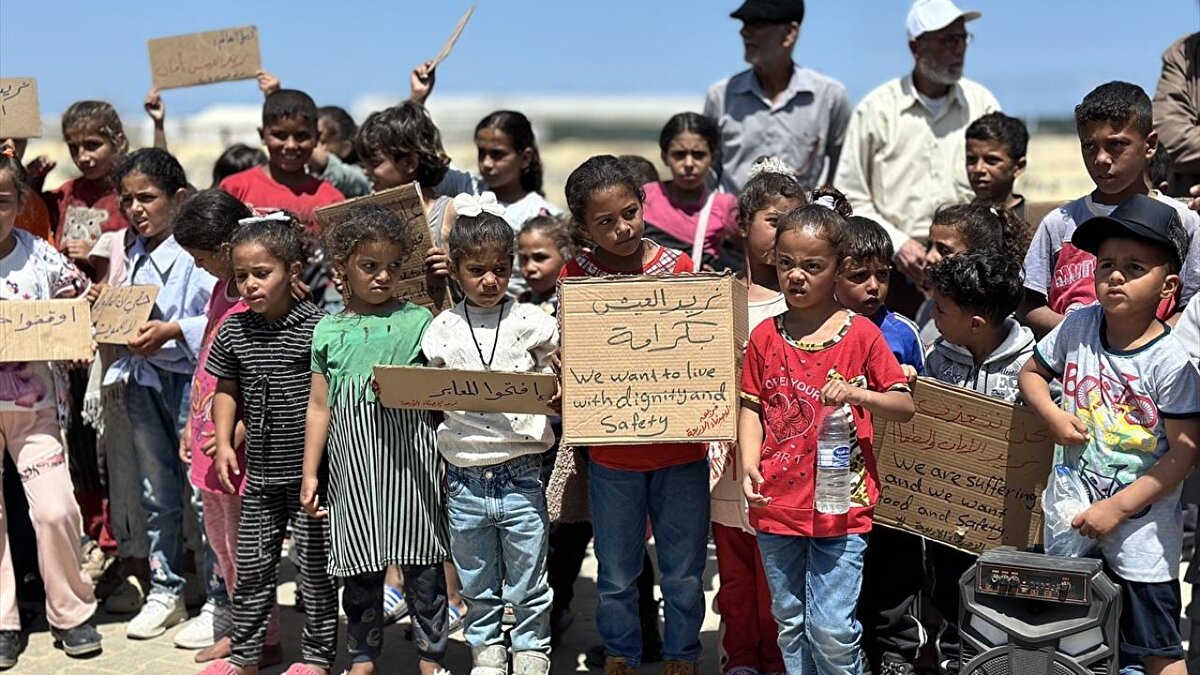 Gazze Şeridi'nin güneyindeki Han Yunus kentinde çocuklar, "soykırım savaşını ve işgal zulmünü durdurun" sloganıyla düzenlenen etkinlikte savaşın sona ermesi çağrısında bulundu.