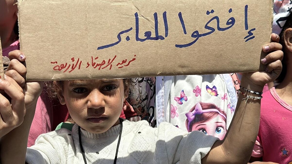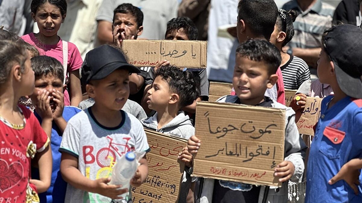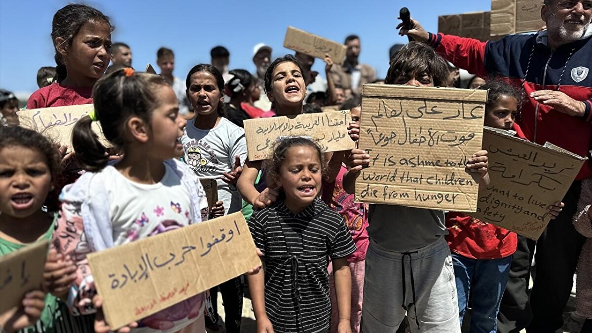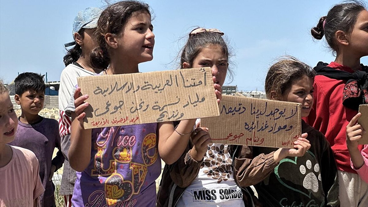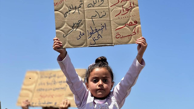 "Ölüme hayır, açlığa hayır" pankartları taşıyan çocuklar, uluslararası topluma seslenerek, "Bombardımanla, hastalıkla, açlıkla ve susuzlukla ölüyoruz; dünya ise sessiz kalıyor" mesajı verdi.
