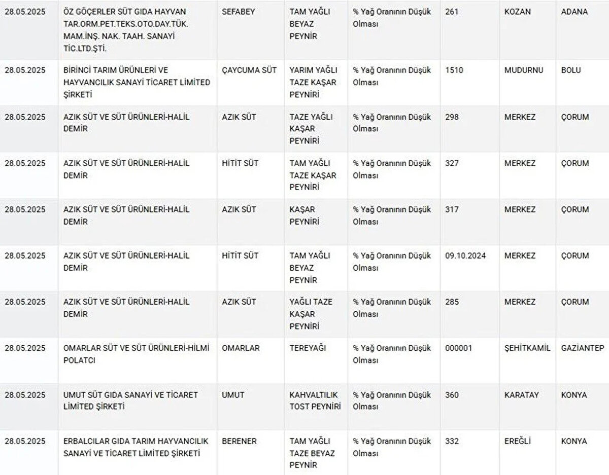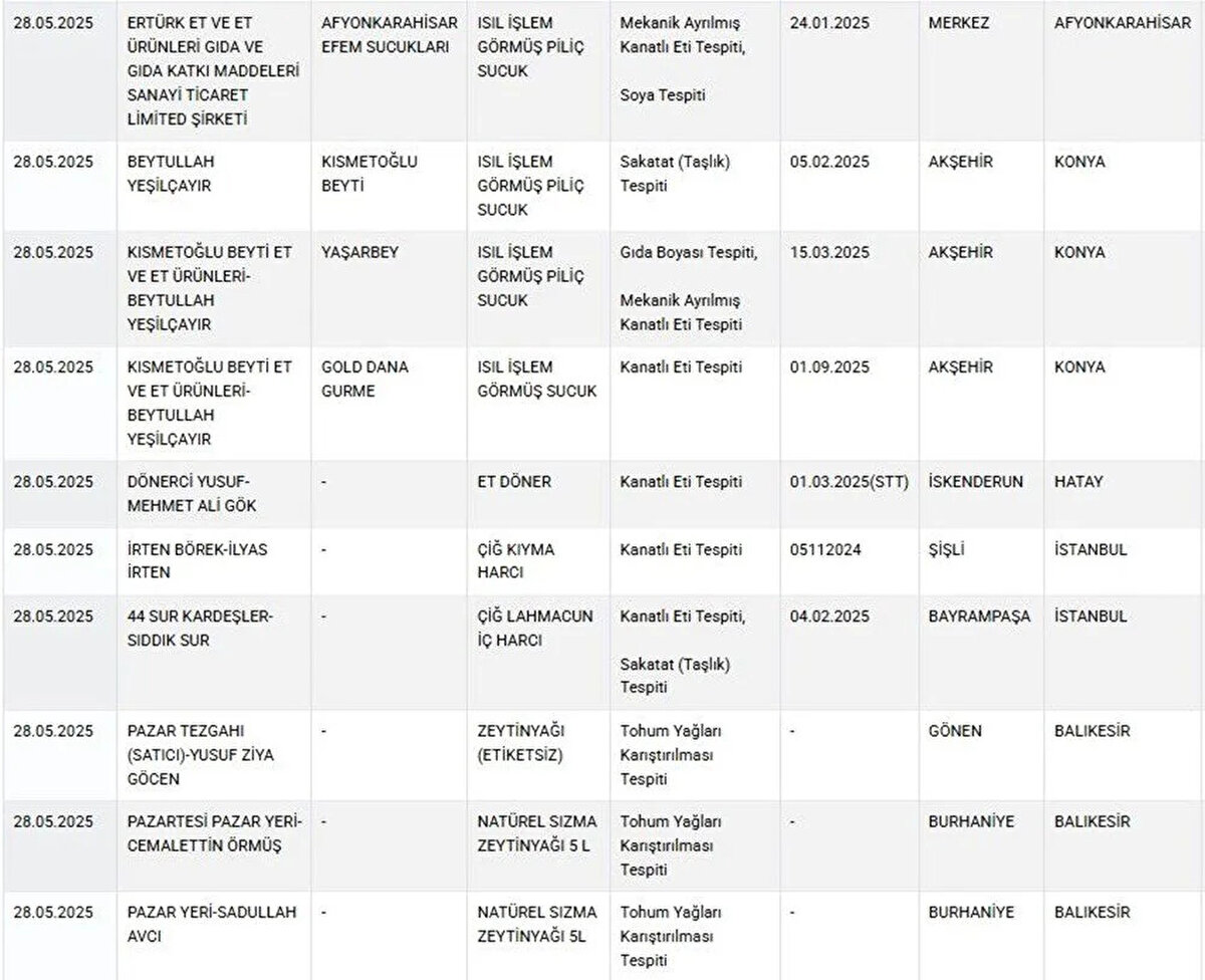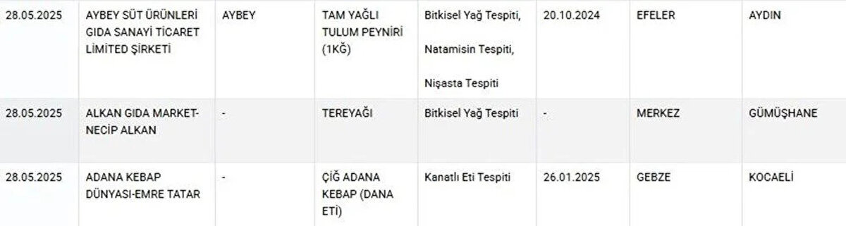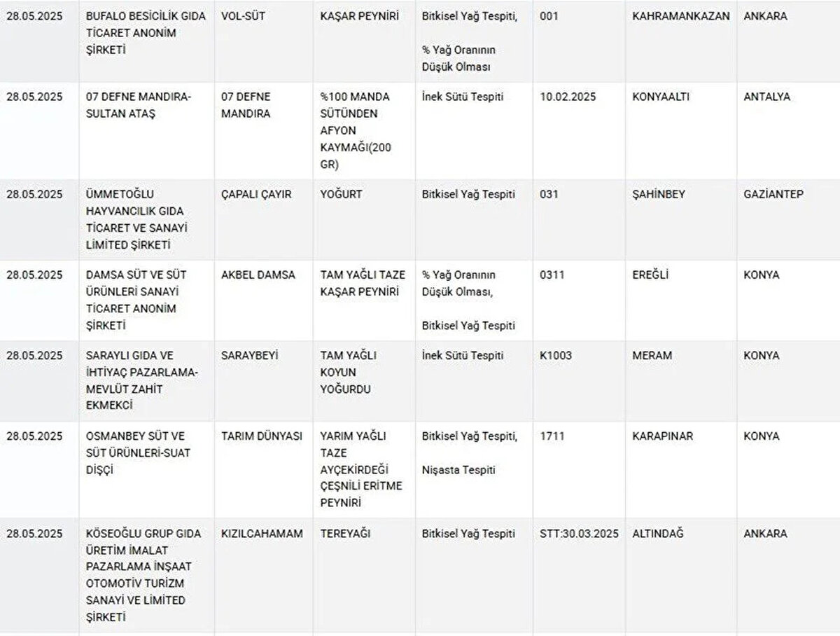 Son listeye göre bazı lahmacunlarda dana eti yerine kanatlı et kullanıldığı, yoğurt ve peynir gibi süt ürünlerinde ise süt yağı yerine bitkisel yağ eklendiği tespit edildi. Böreklerde, içeriği belirsiz karışımlar yer alırken, bazı zeytinyağı ürünlerinde boya ve farklı yağlarla tağşiş yapıldığı belirlendi.