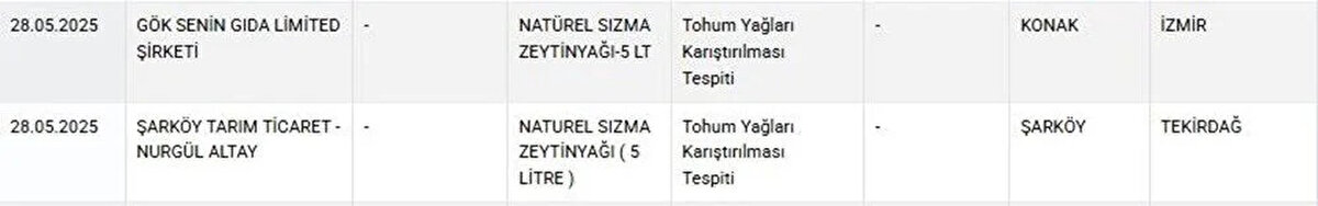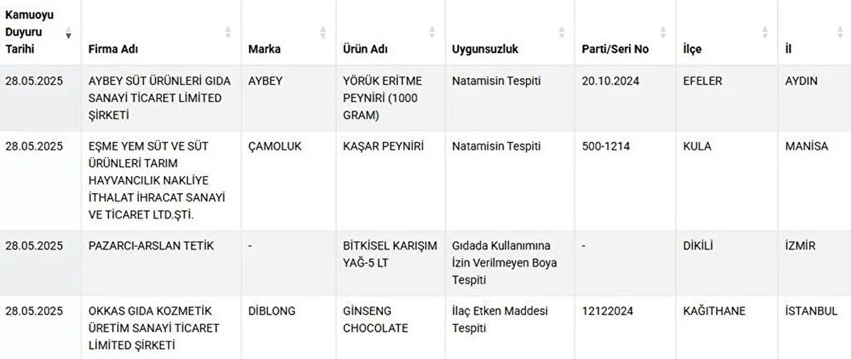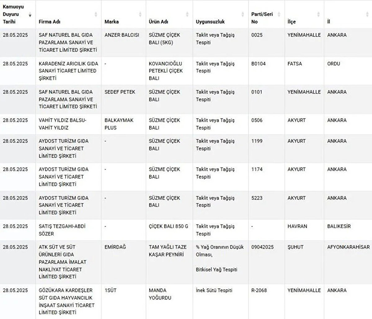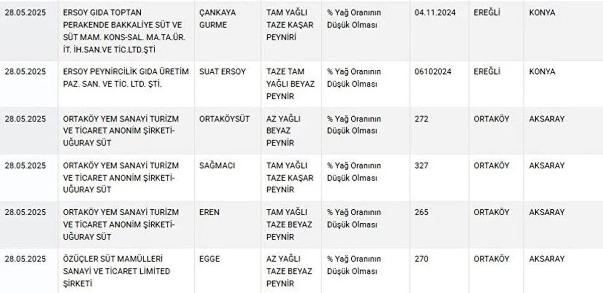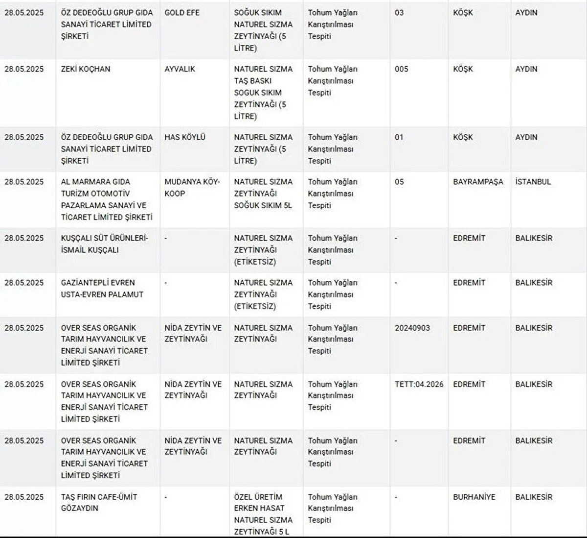 Son listeye göre bazı lahmacunlarda dana eti yerine kanatlı et kullanıldığı, yoğurt ve peynir gibi süt ürünlerinde ise süt yağı yerine bitkisel yağ eklendiği tespit edildi. Böreklerde, içeriği belirsiz karışımlar yer alırken, bazı zeytinyağı ürünlerinde boya ve farklı yağlarla tağşiş yapıldığı belirlendi.