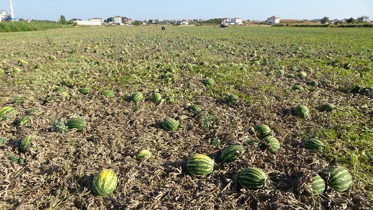 Antalya'da mevsim normallerinin üzerinde seyreden ve gölgede 40 dereceyi bulan hava sıcaklığı nedeniyle tarlada toplanmayı bekleyen karpuz yanarak sarardı.