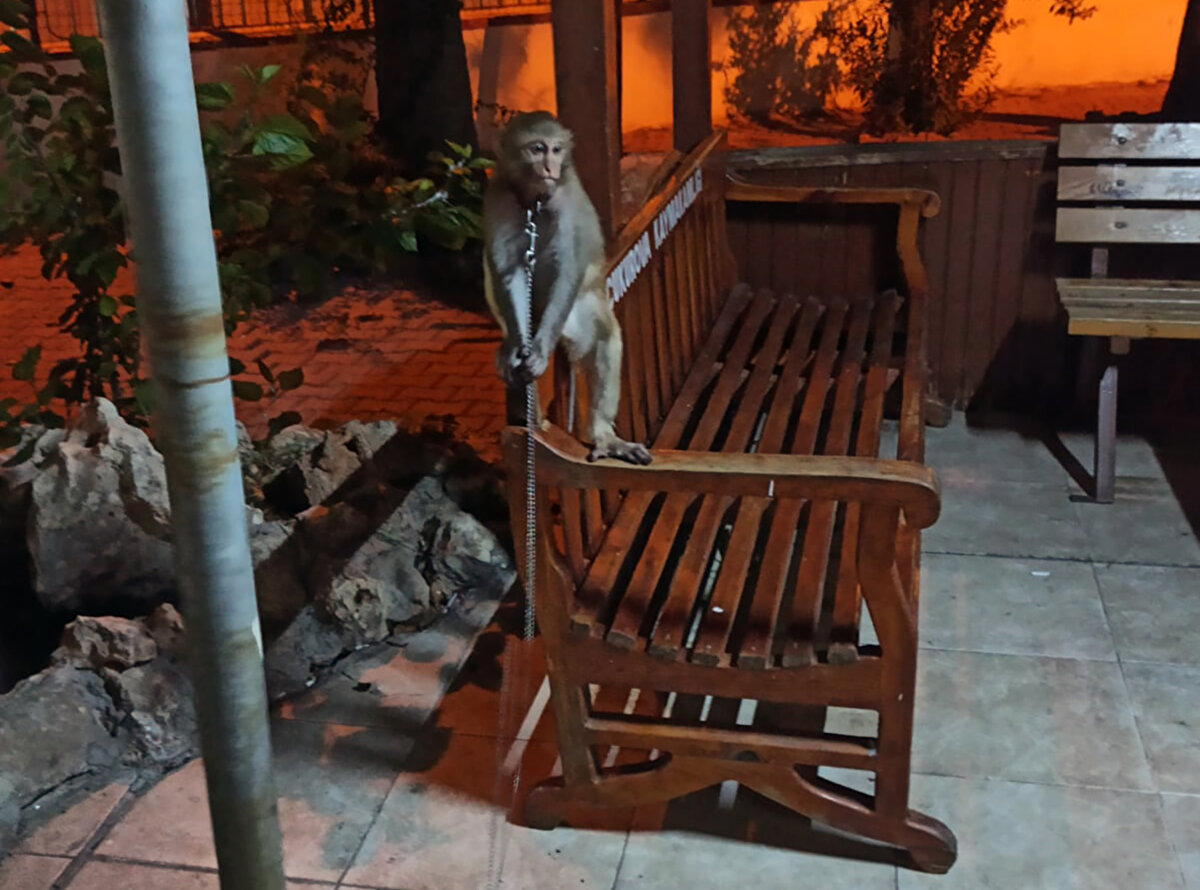 Çukurova ilçesi Karslılar Mahallesi'ndeki piknik ve mesire alanında yürüyüş yapanlar, bankların üzerinde yatan tasmalı bir makak maymunu gördü.