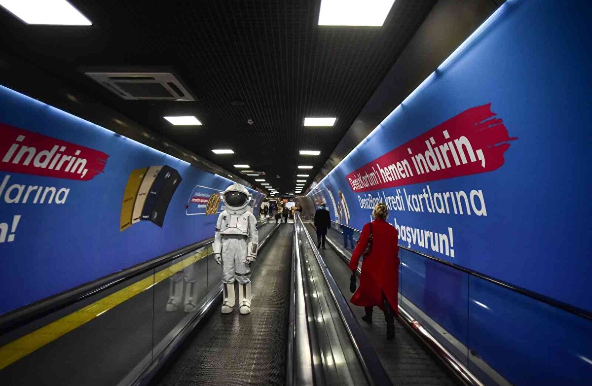 Astronot kıyafetiyle rutin bir İstanbullu gibi akbil basarak metroya giden vatandaş, yolcuların ilgisiyle karşılaştı.
