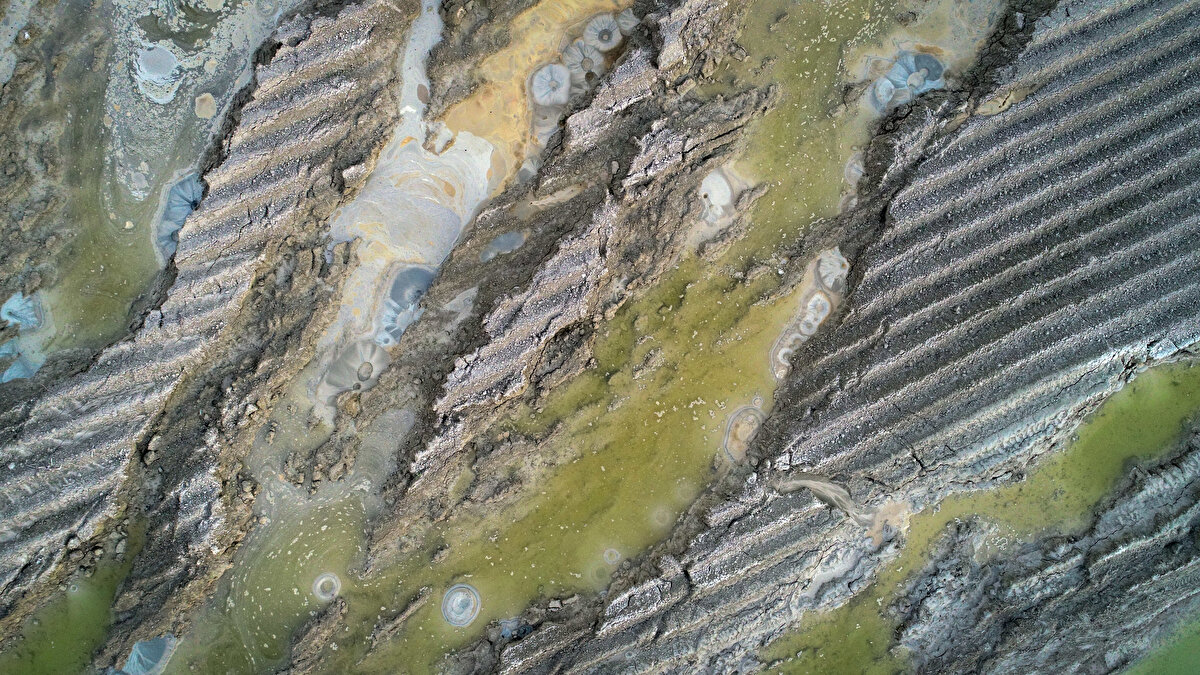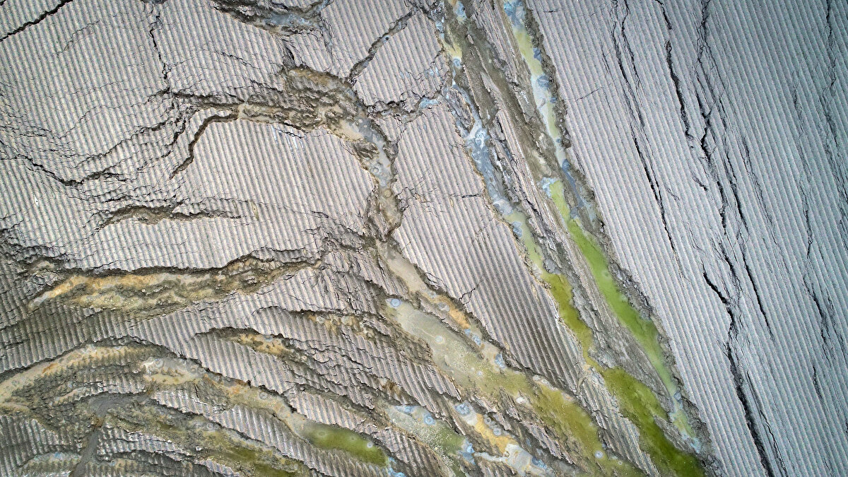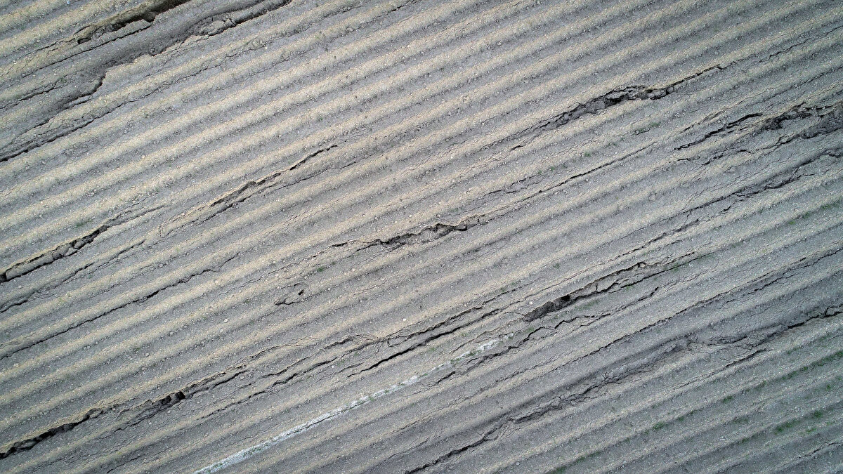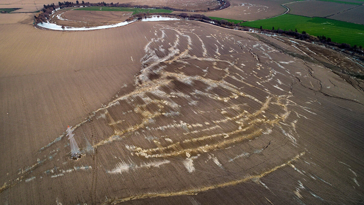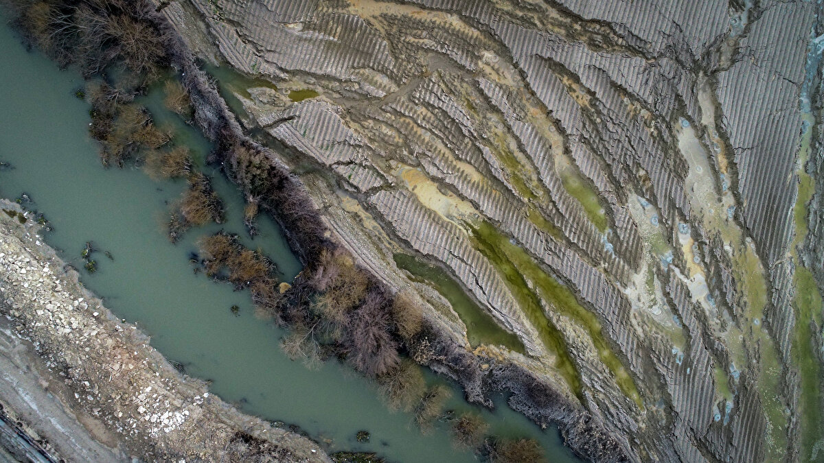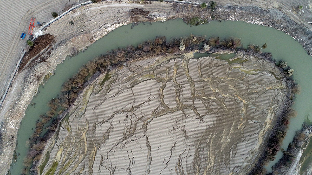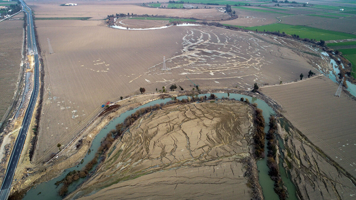 Asi Nehri`nin kıyılarındaki tarım arazilerinde oluşan şekiller ve yollardaki hasar, dronla görüntülendi.