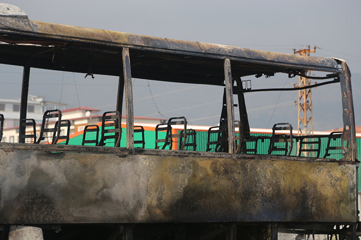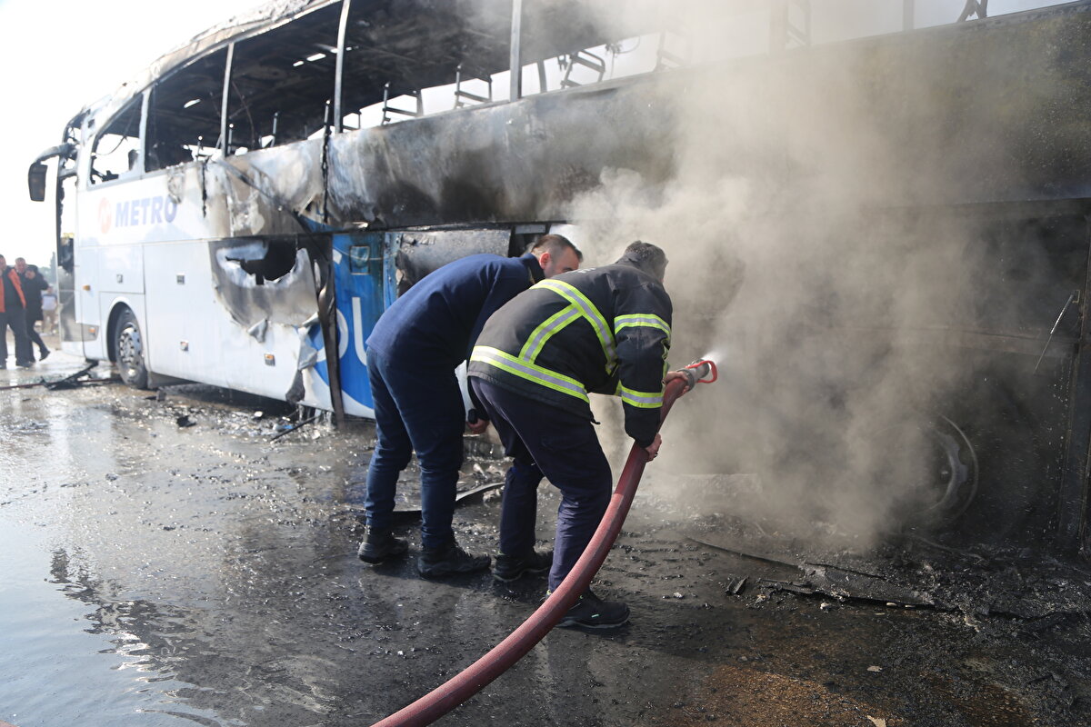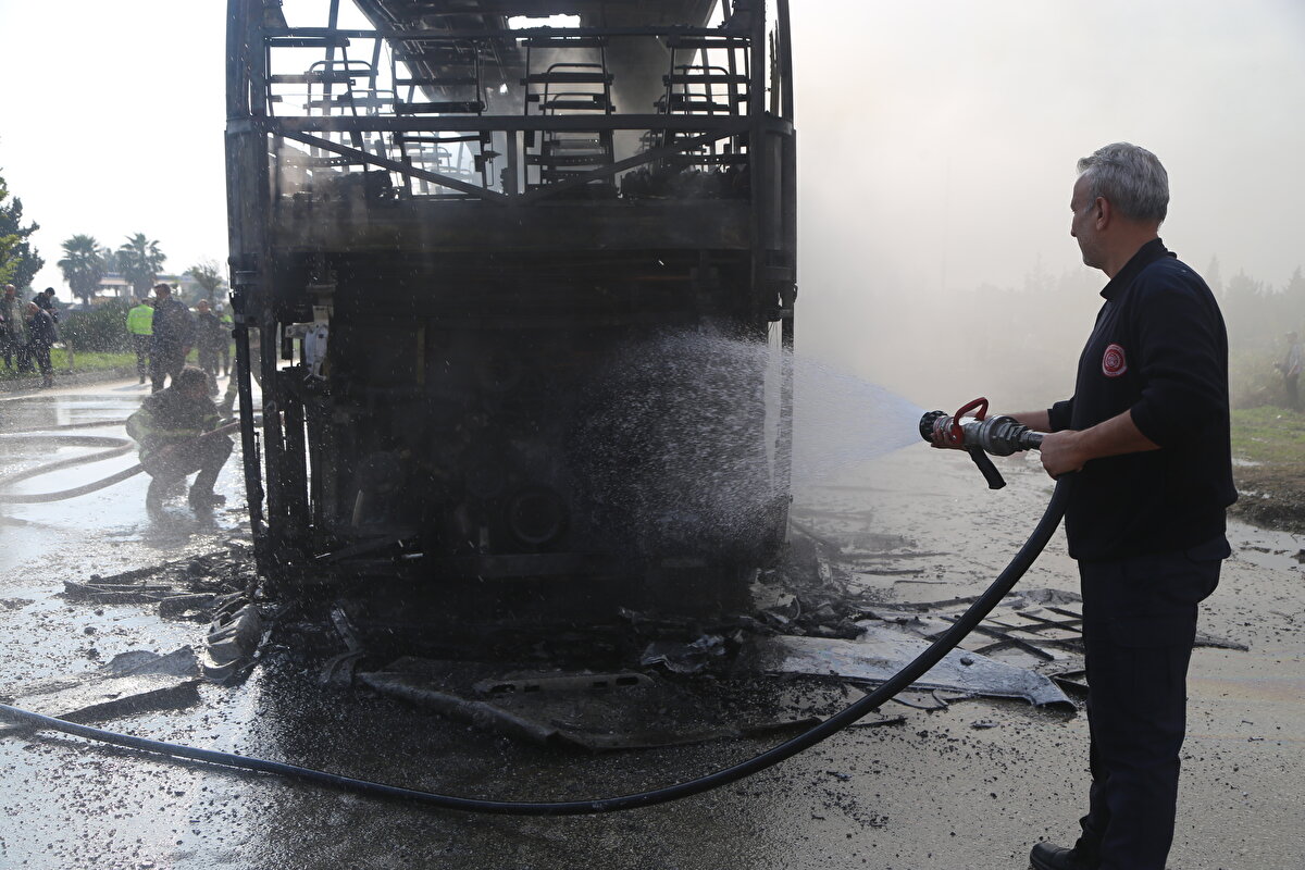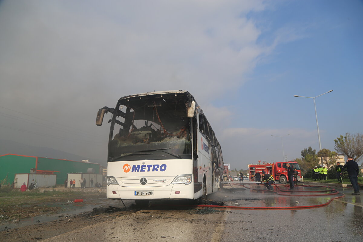 İstanbul'dan Hatay'a giden ve sürücüsü öğrenilemeyen, 34 DH 2090 plakalı otobüs, Antakya-İskenderun kara yolunun Serinyol mevkisinde seyir halindeyken alev aldı.