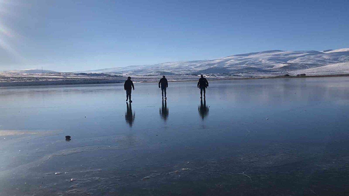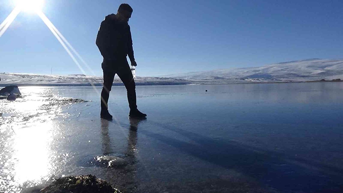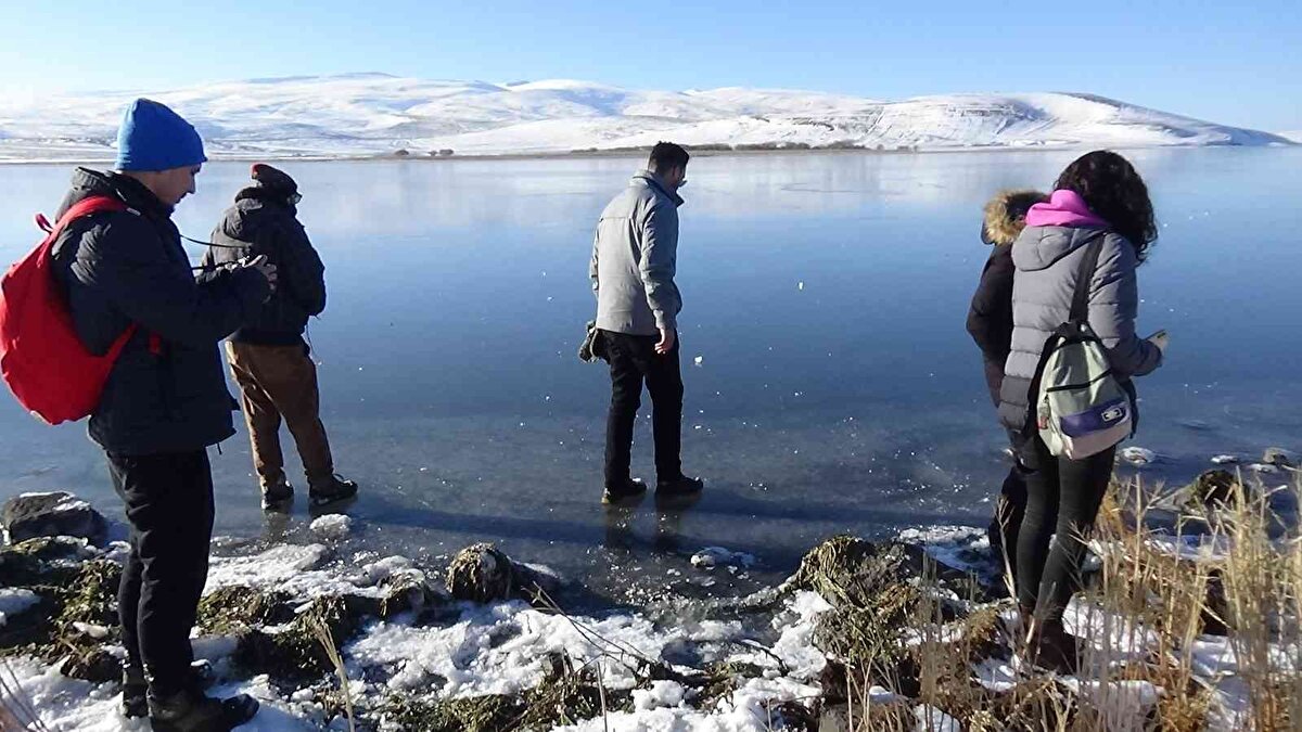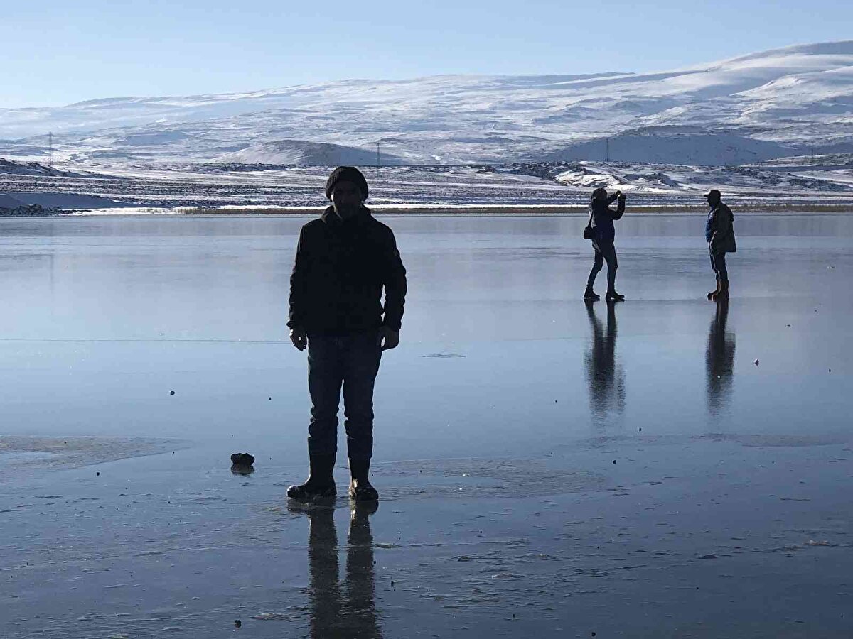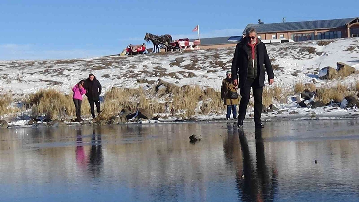 Kentte dışardan gelen vatandaşlar Çıldır Gölü’ne gelerek burada ince tabaka buzun üzerine çıktı.