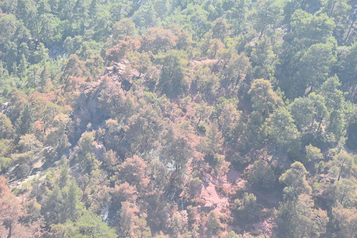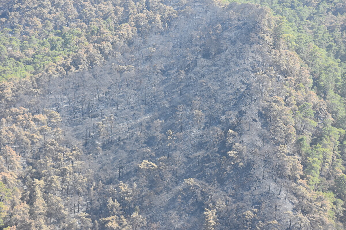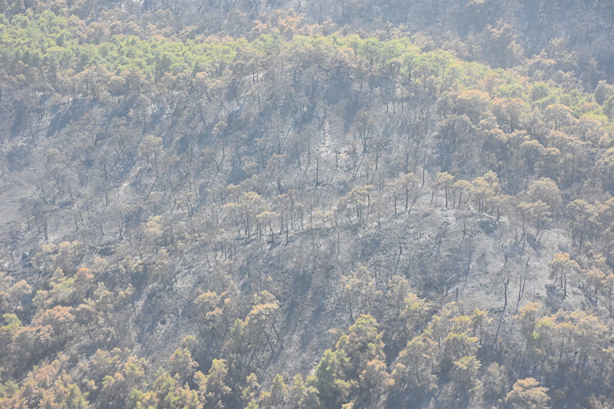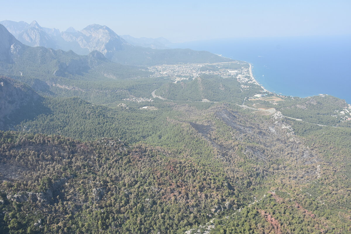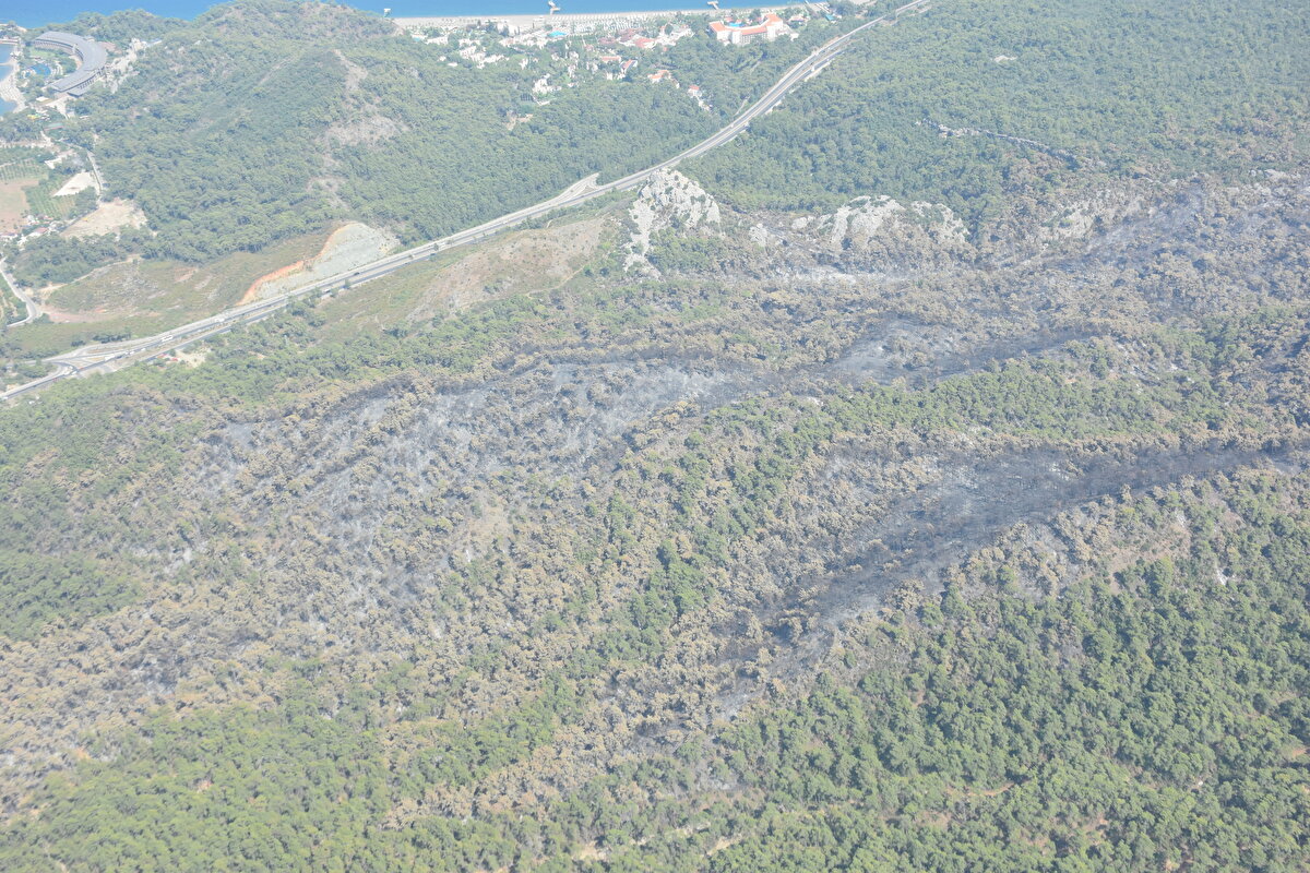 Antalya'nın Kemer ilçesindeki ormanlık alanda yaklaşık 5 gündür devam eden ve bugün kontrol altına alınabilen yangında zarar gören alanlar, helikopterle görüntülendi.