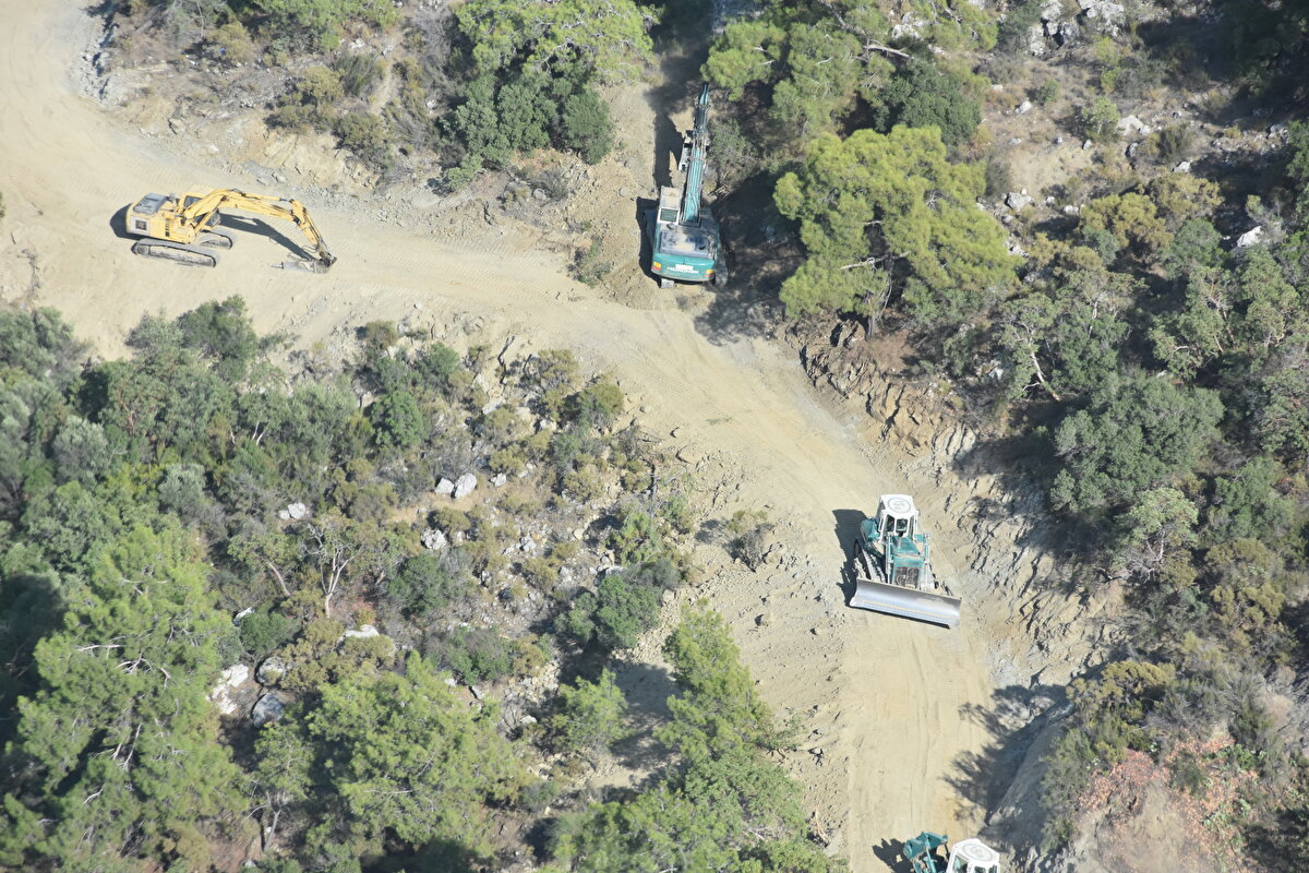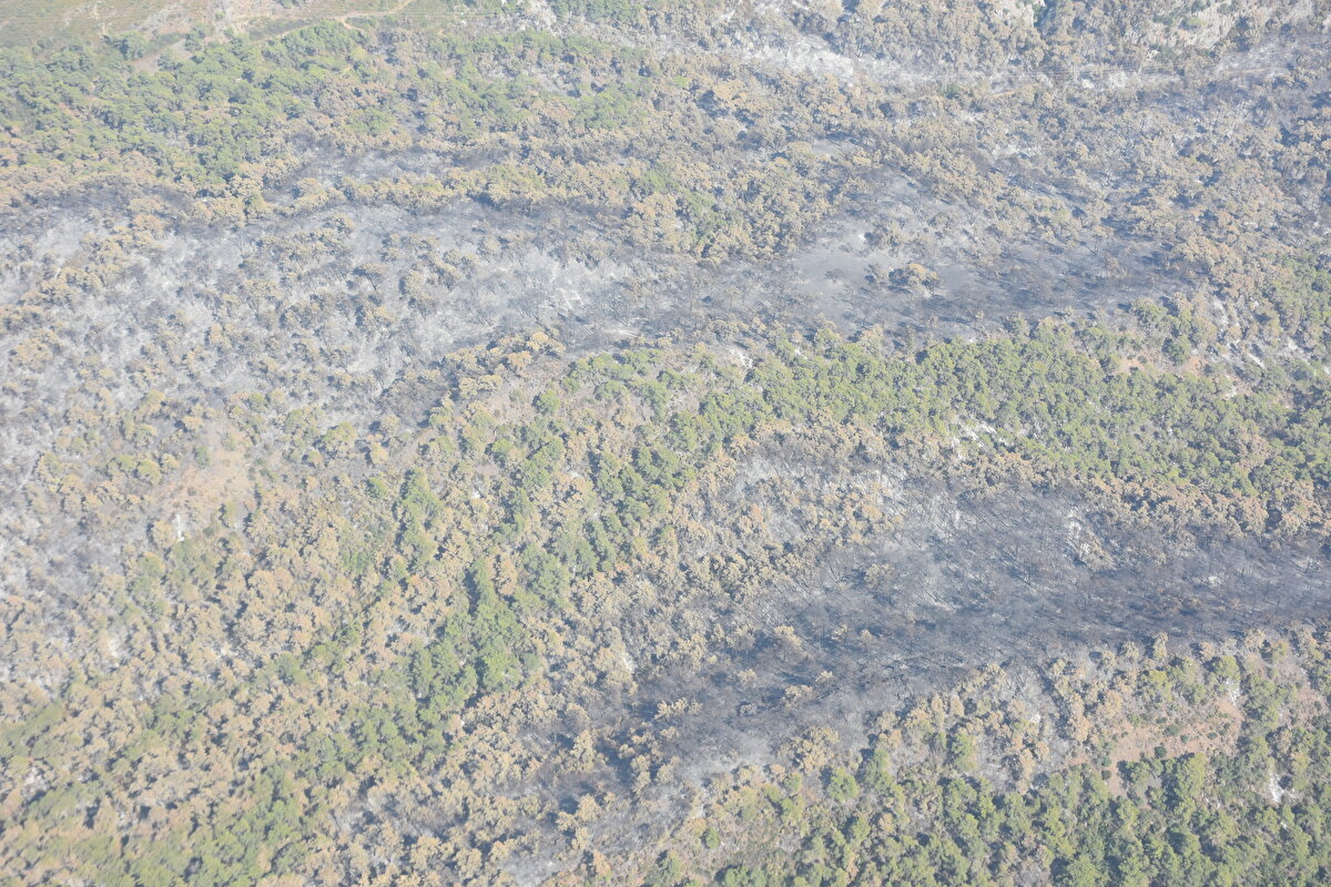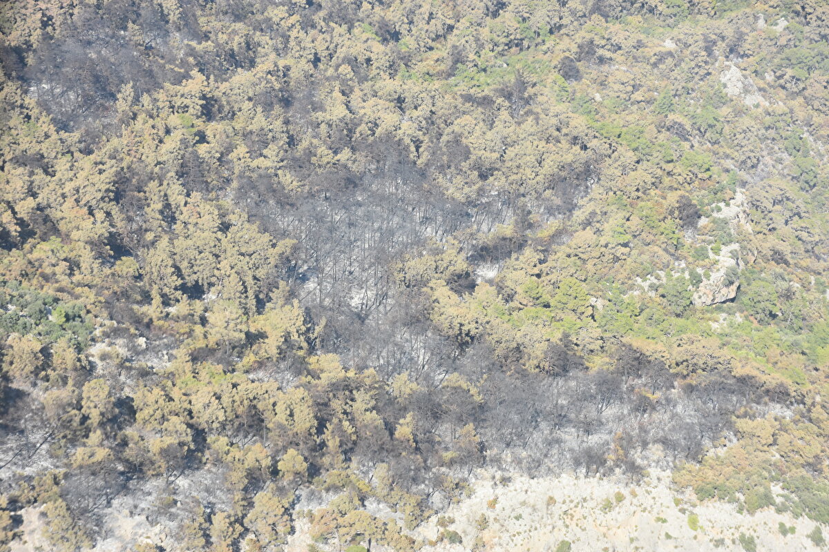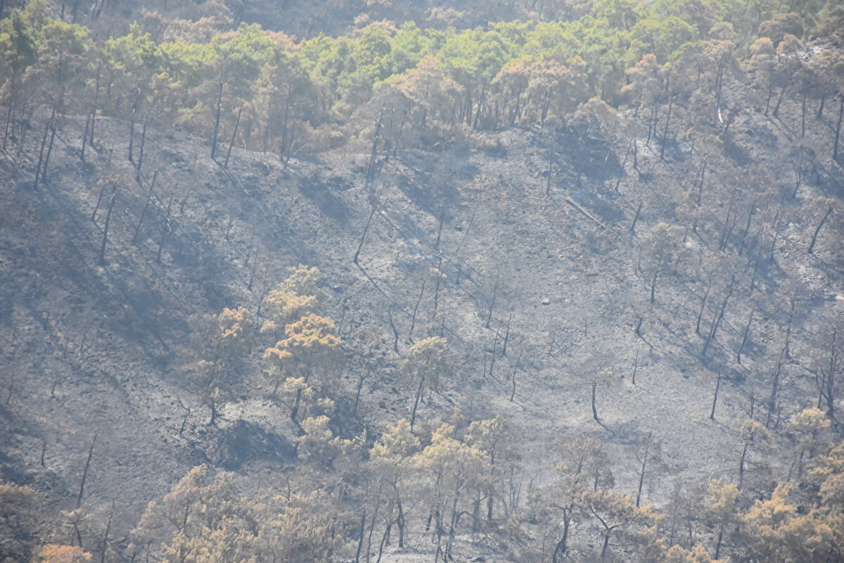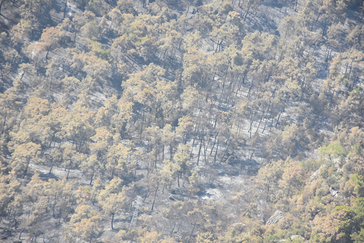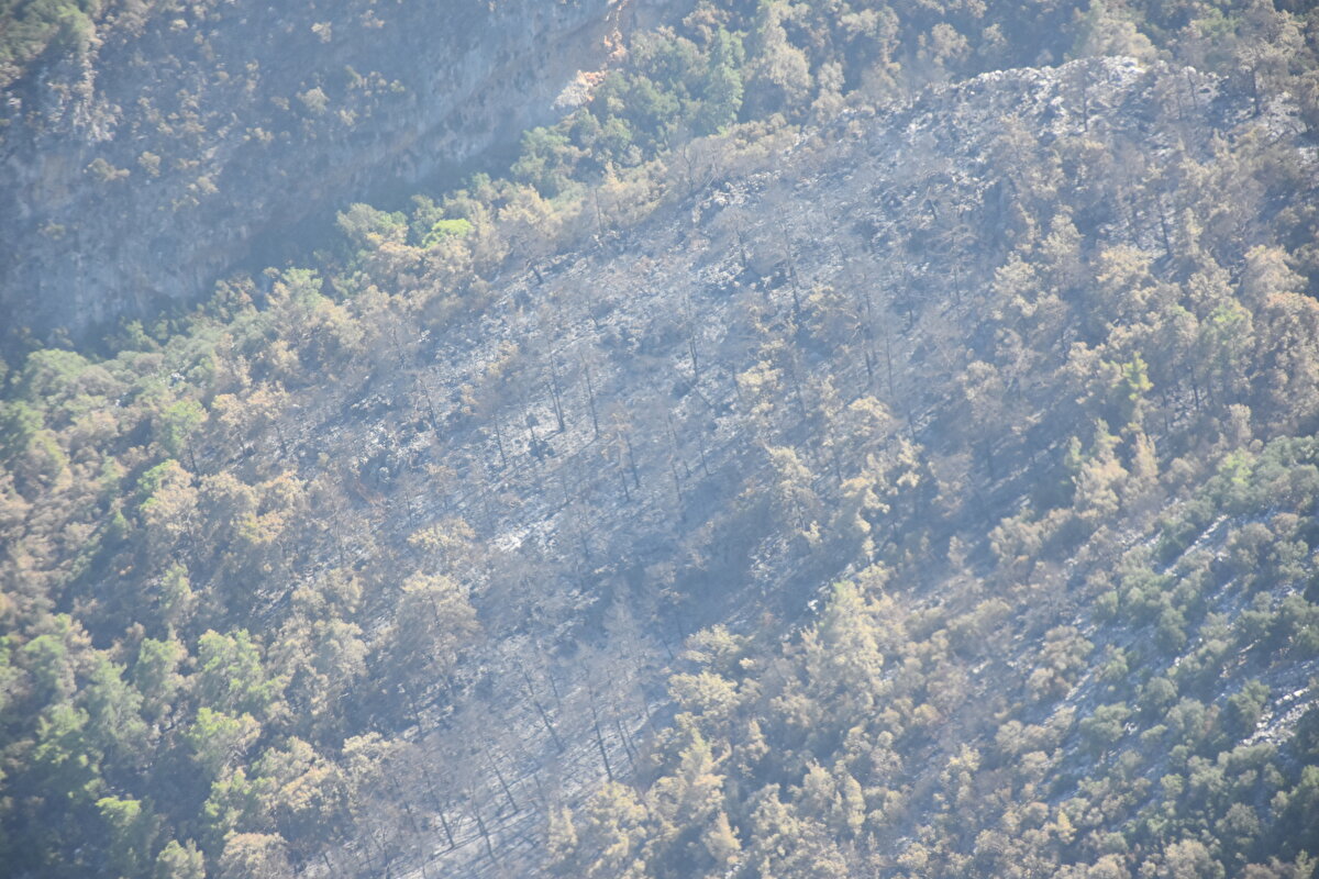 Antalya'nın Kemer ilçesindeki ormanlık alanda yaklaşık 5 gündür devam eden ve bugün kontrol altına alınabilen yangında zarar gören alanlar, helikopterle görüntülendi.
