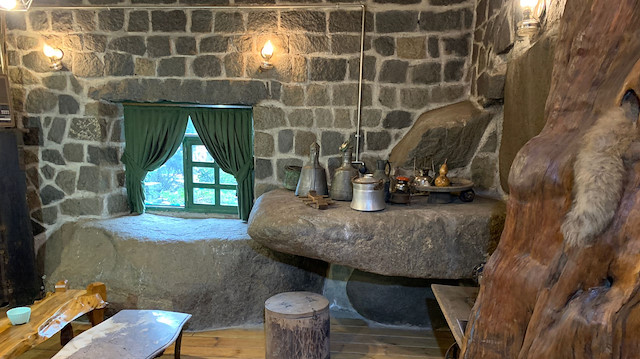 Ofis içine kadar uzanan kayayı masa olarak kullanan Eksilmez, üzerine antika eşyalar da koydu. Taş yapının iç ve dış kısmındaki kaya bloklarının elips çıkıntıları ise dikkat çekiyor.