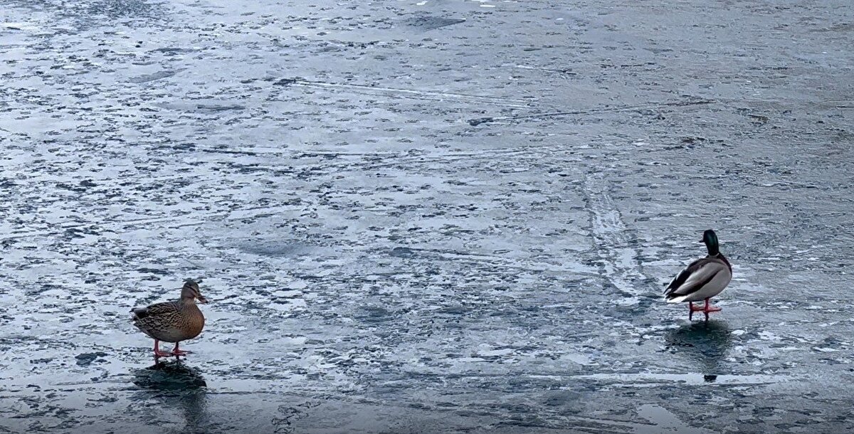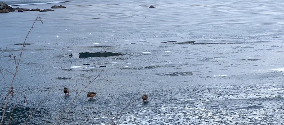 Göl çevresinde yürüyüş yapan tatilciler, attıkları taşlarla buzun kalınlığını ölçerek eğlenceli bir gün geçirdi.