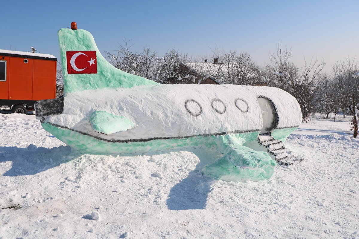 Geçen yıllarda arkadaşlarıyla birlikte kardan dev bir yılan ve gemi yapan İbrahim Kurt, koronavirüs salgını nedeniyle tek başına başladığı uçağı 4 günde tamamladı.