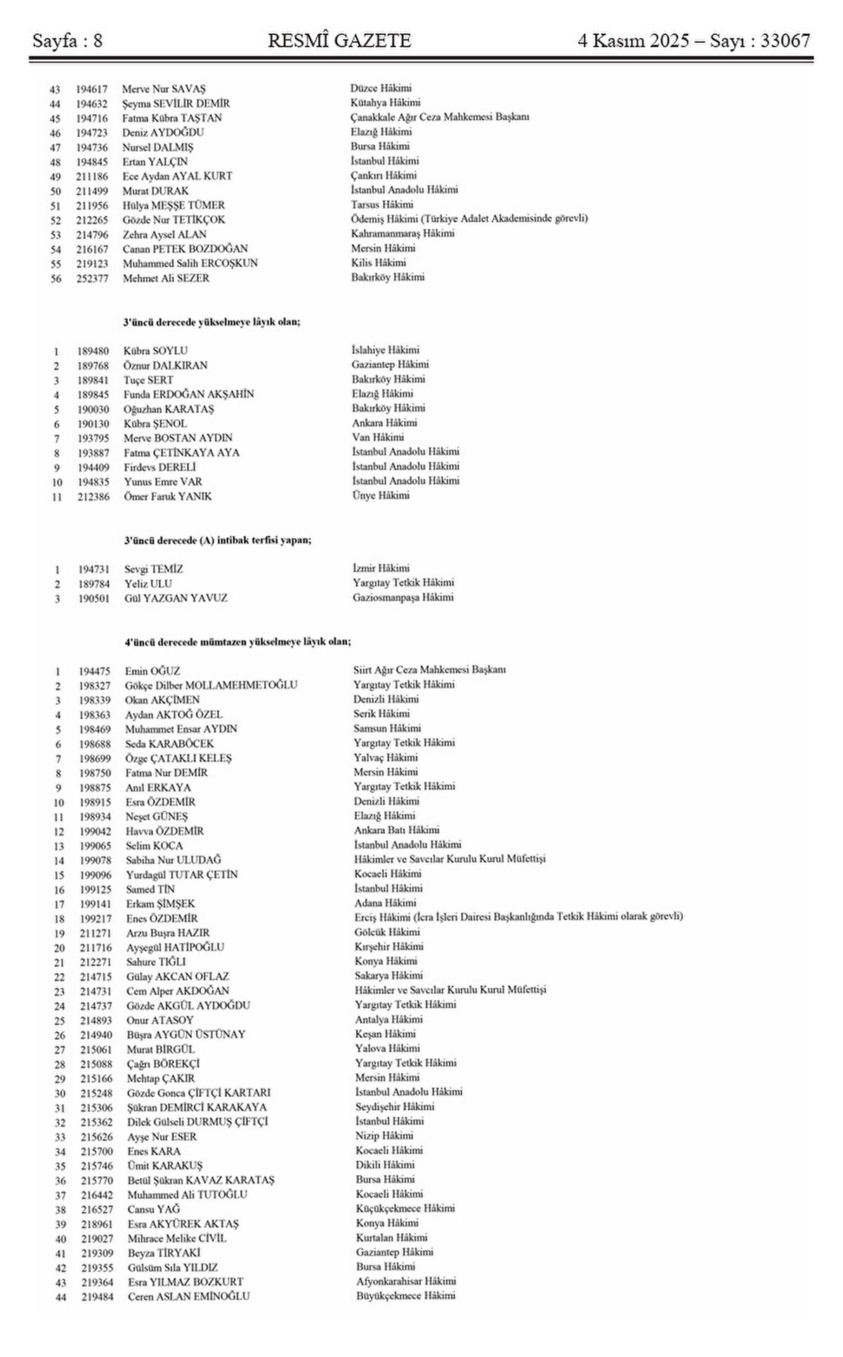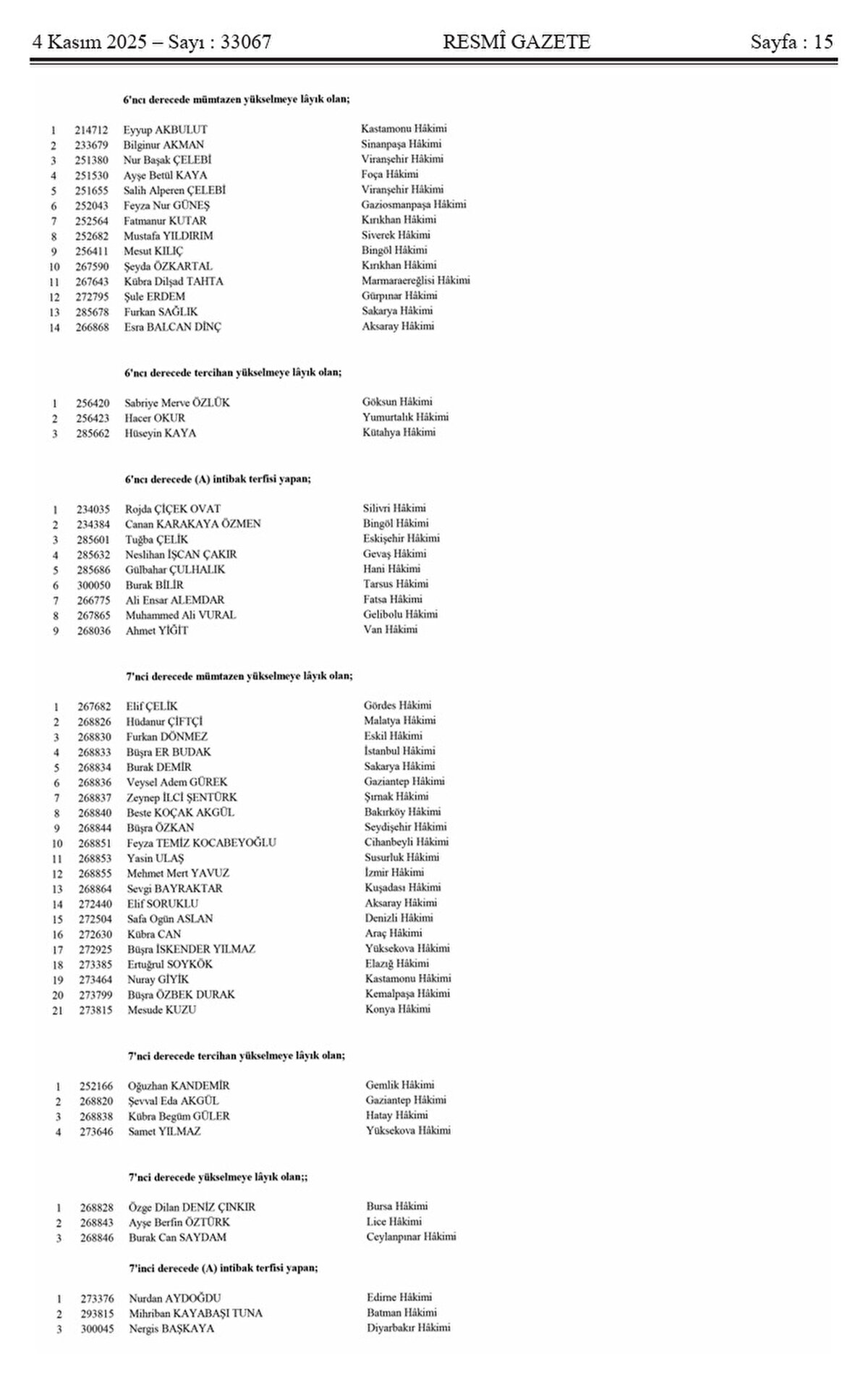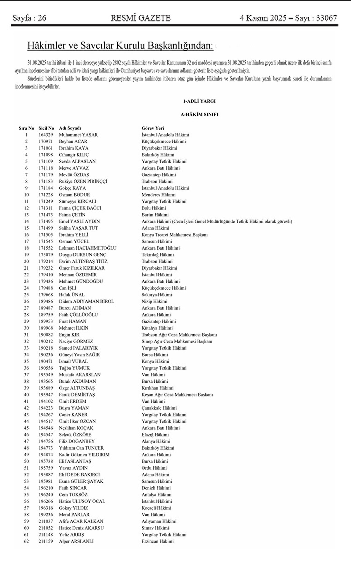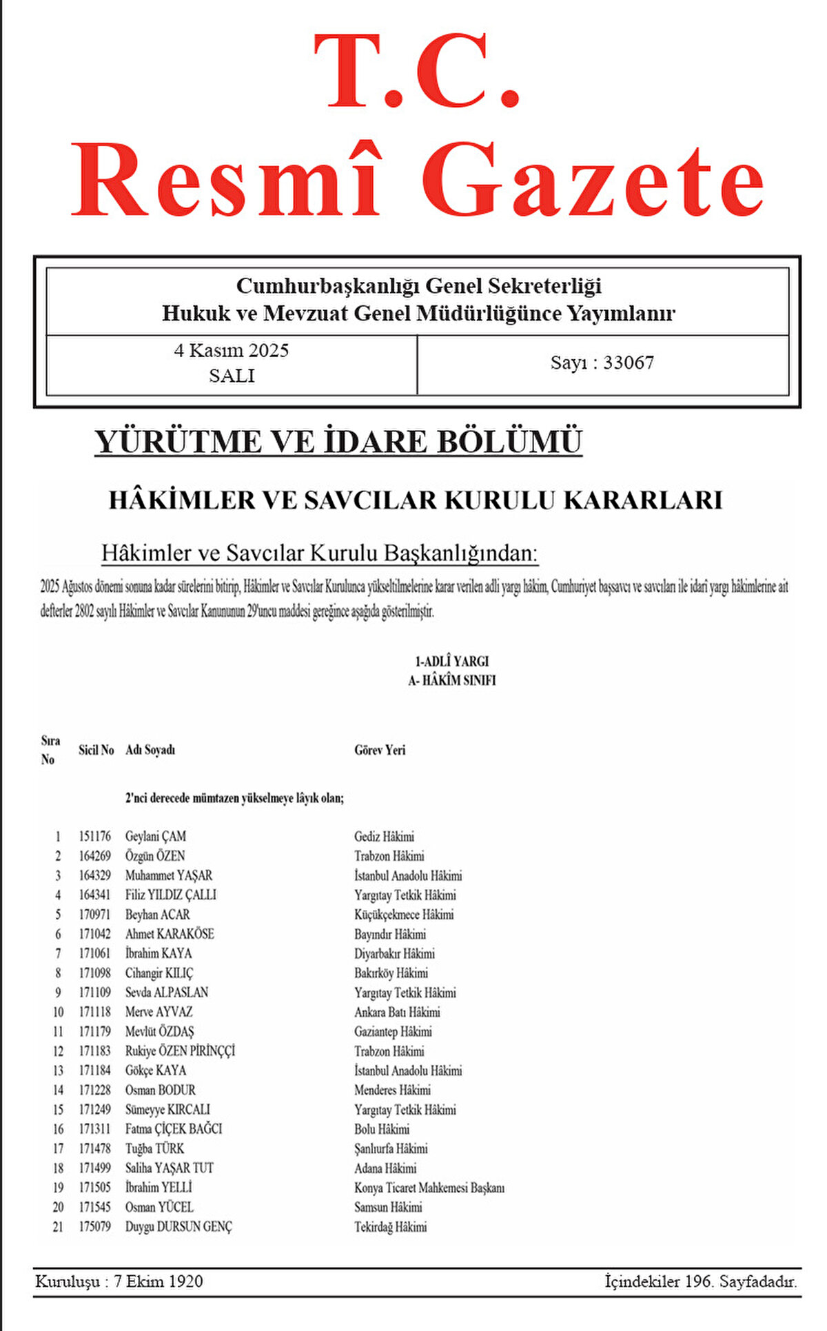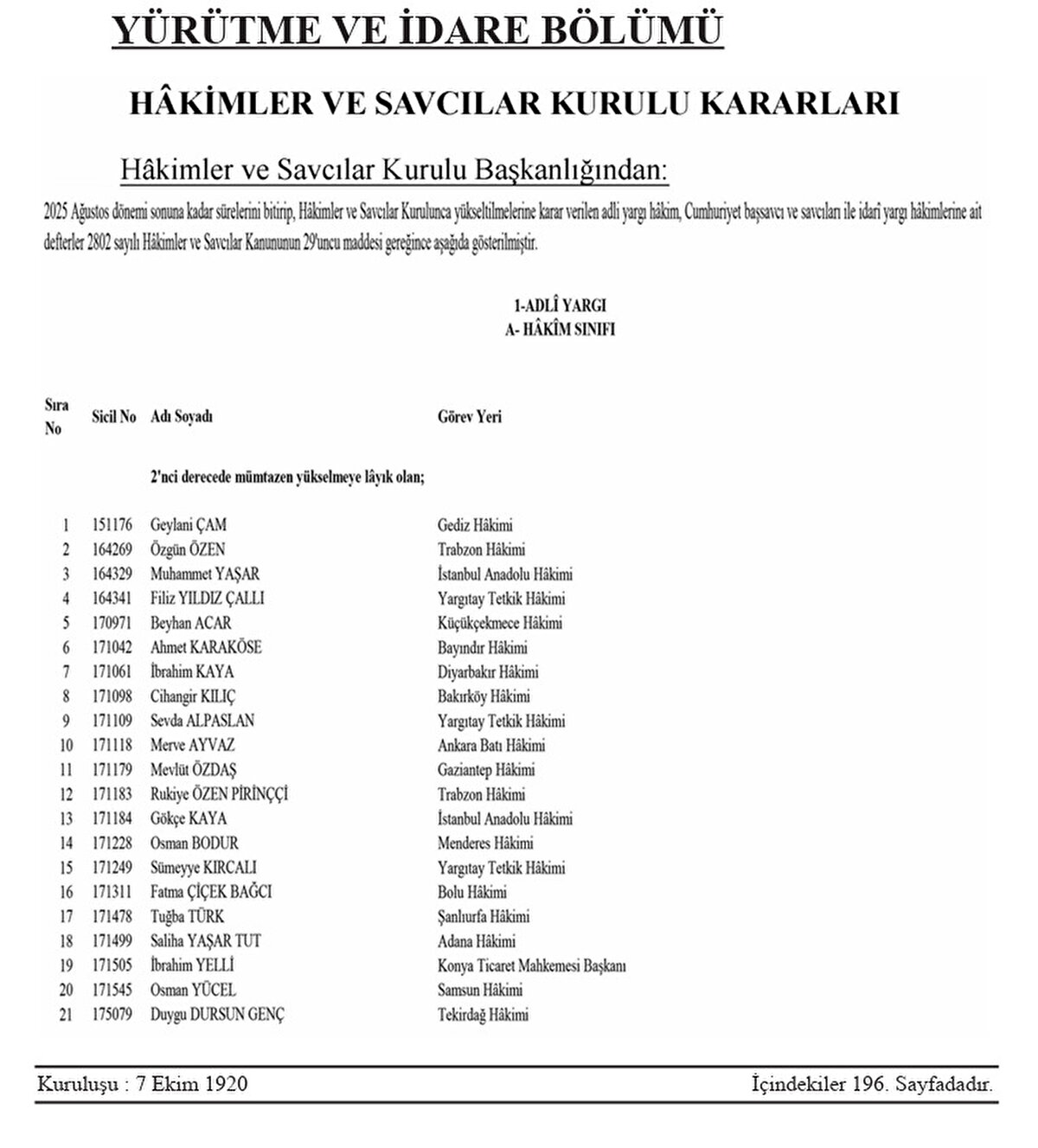 Hakimler ve Savcılar Kurulu'nun (HSK) 2025 Ağustos dönemi kararları Resmi Gazete'de yayımlandı. Karara göre, görev sürelerini tamamlayan 21 adli yargı hakimi, ikinci derecede mümtazen yükselmeye layık görüldü.