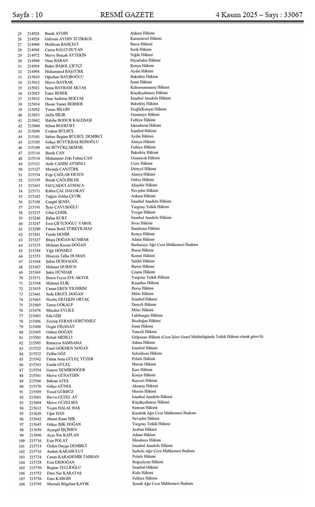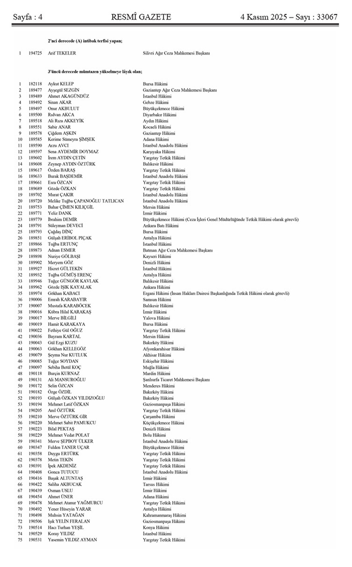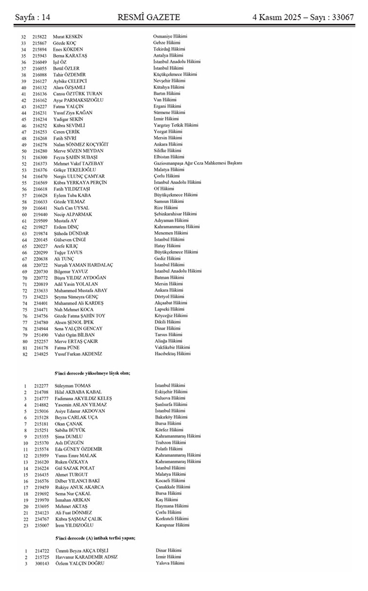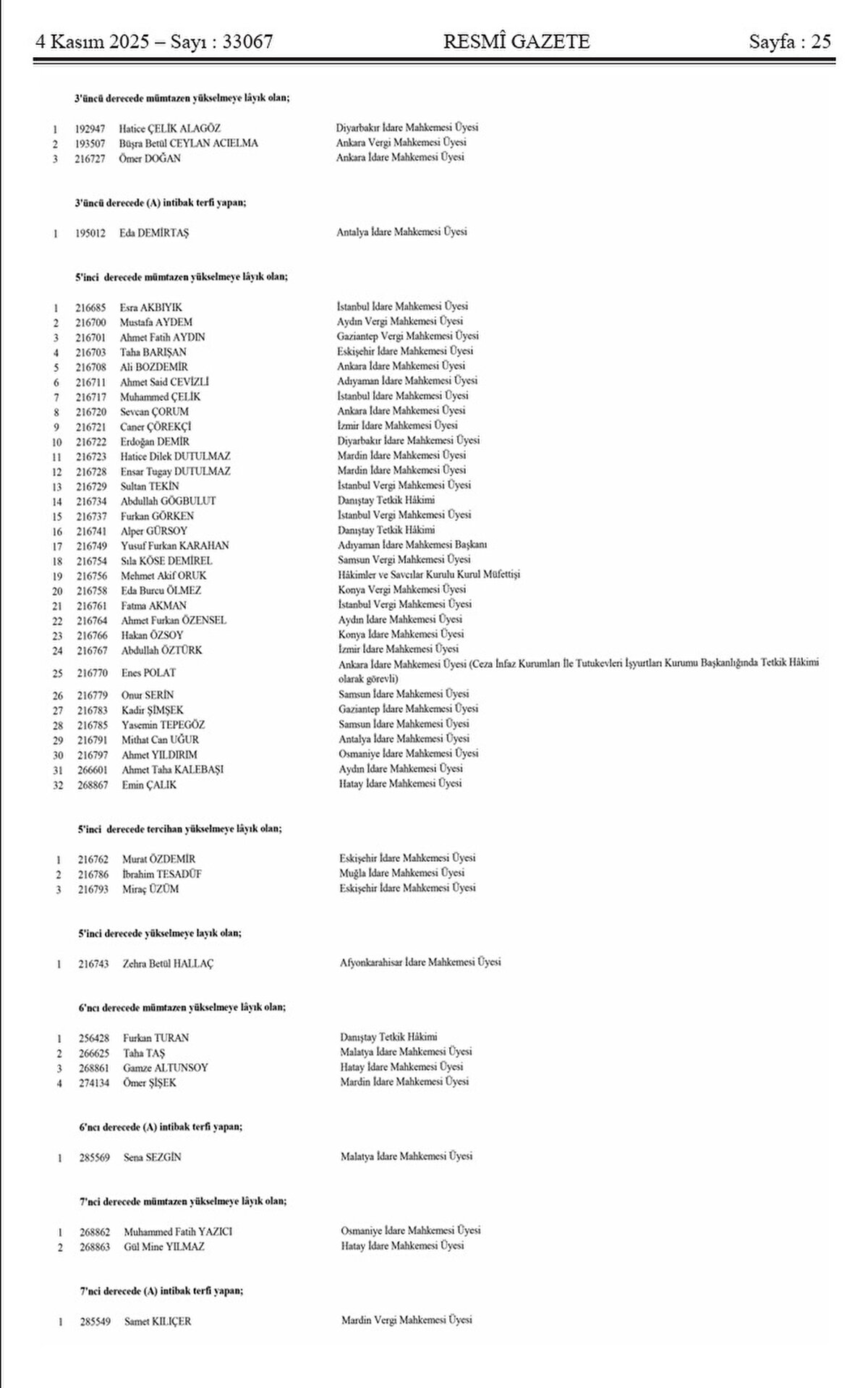 Hakimler ve Savcılar Kurulu'nun (HSK) 2025 Ağustos dönemi kararları Resmi Gazete'de yayımlandı. Karara göre, görev sürelerini tamamlayan 21 adli yargı hakimi, ikinci derecede mümtazen yükselmeye layık görüldü.