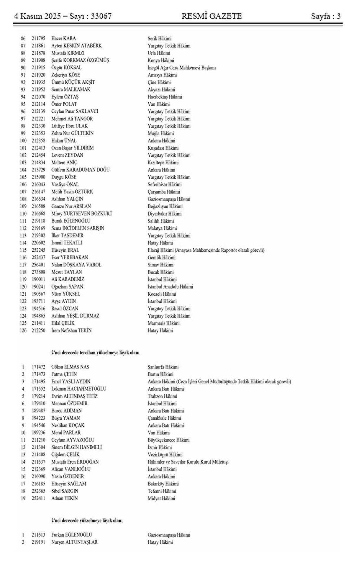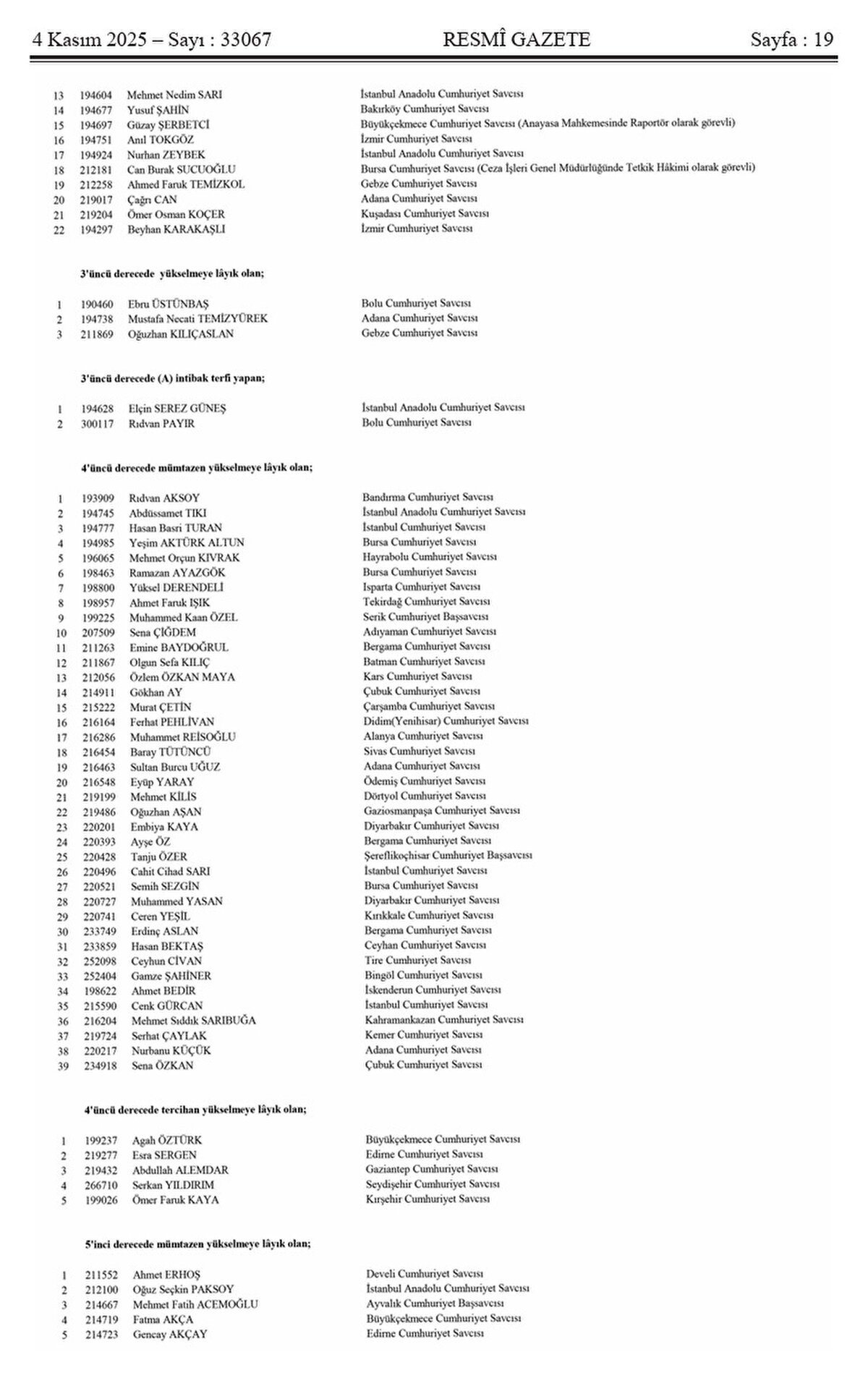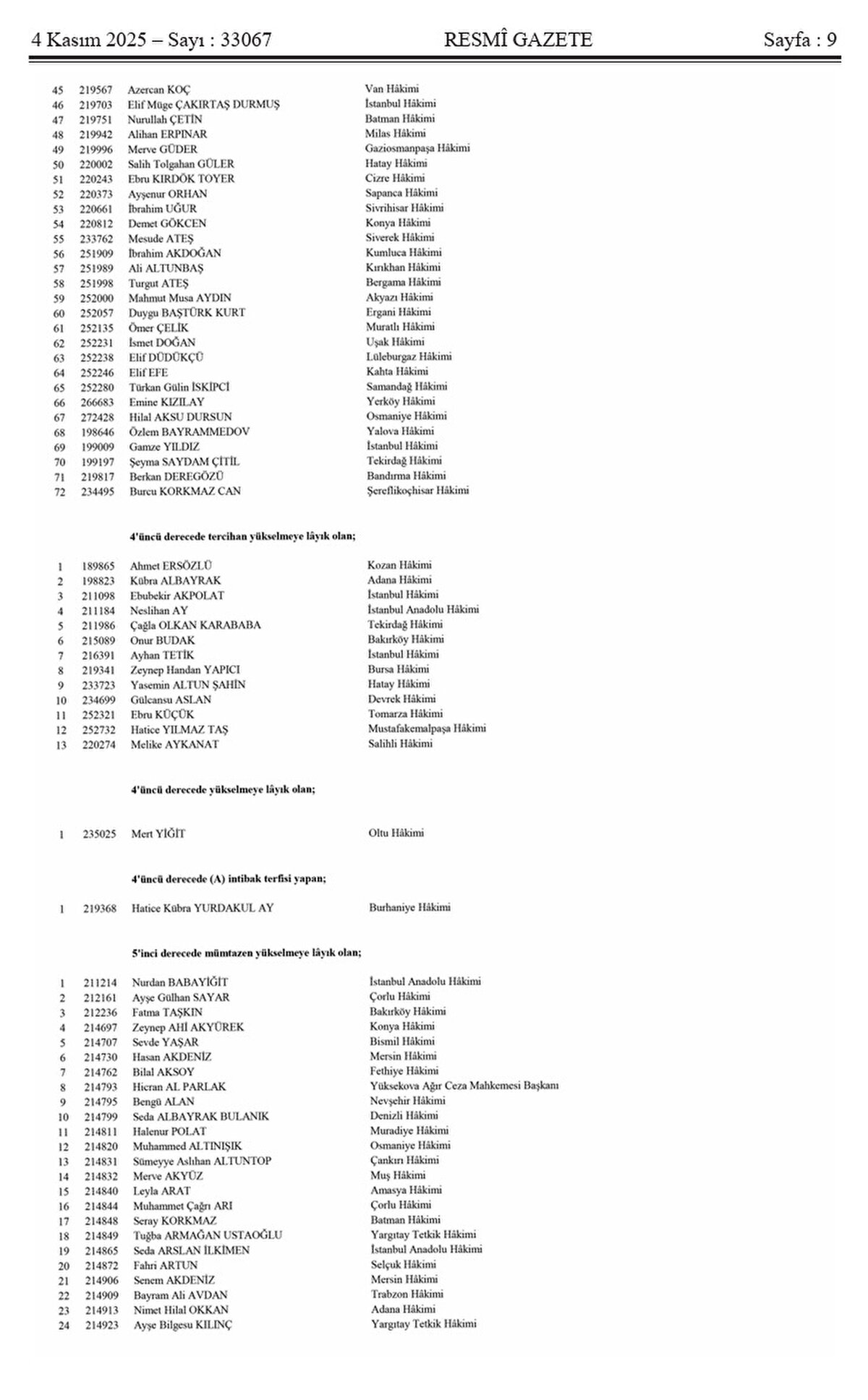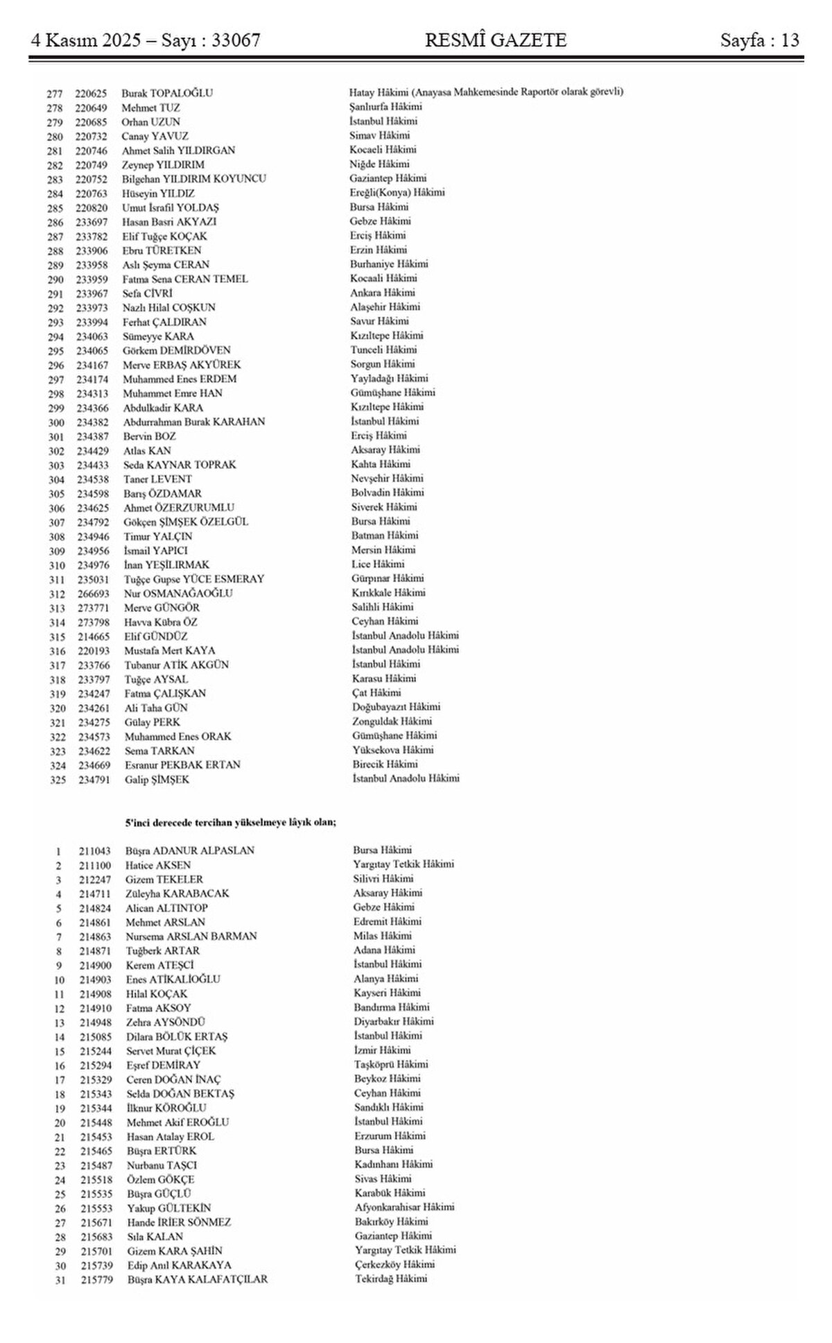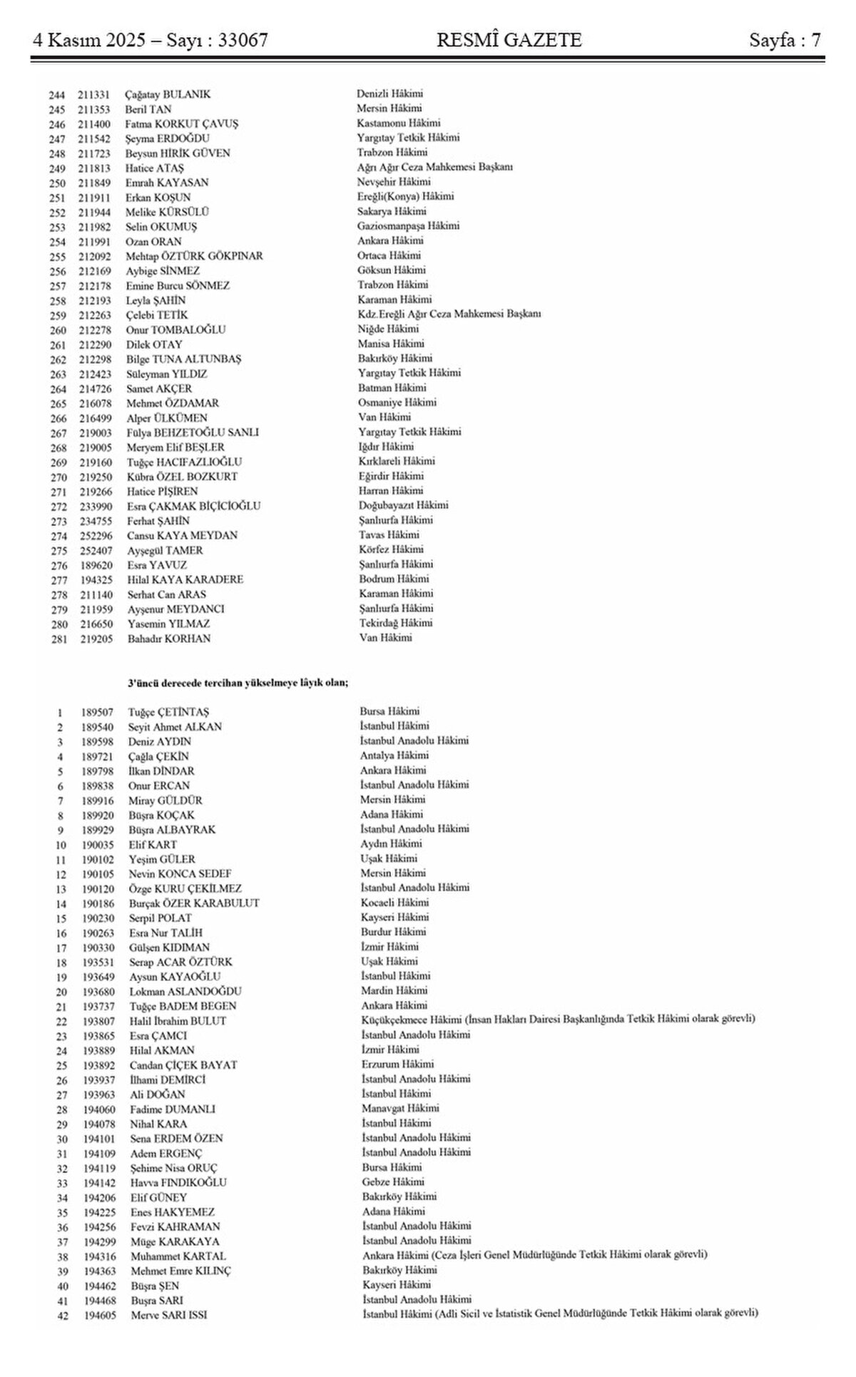 Hakimler ve Savcılar Kurulu'nun (HSK) 2025 Ağustos dönemi kararları Resmi Gazete'de yayımlandı. Karara göre, görev sürelerini tamamlayan 21 adli yargı hakimi, ikinci derecede mümtazen yükselmeye layık görüldü.