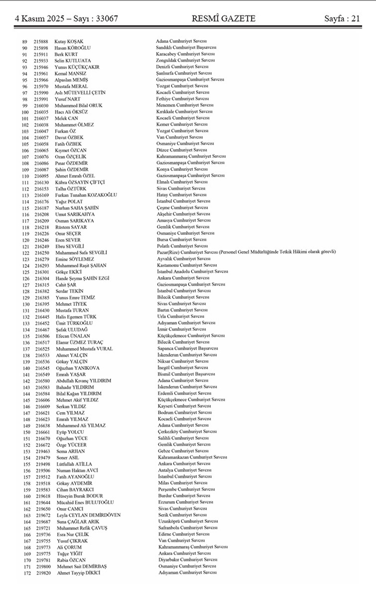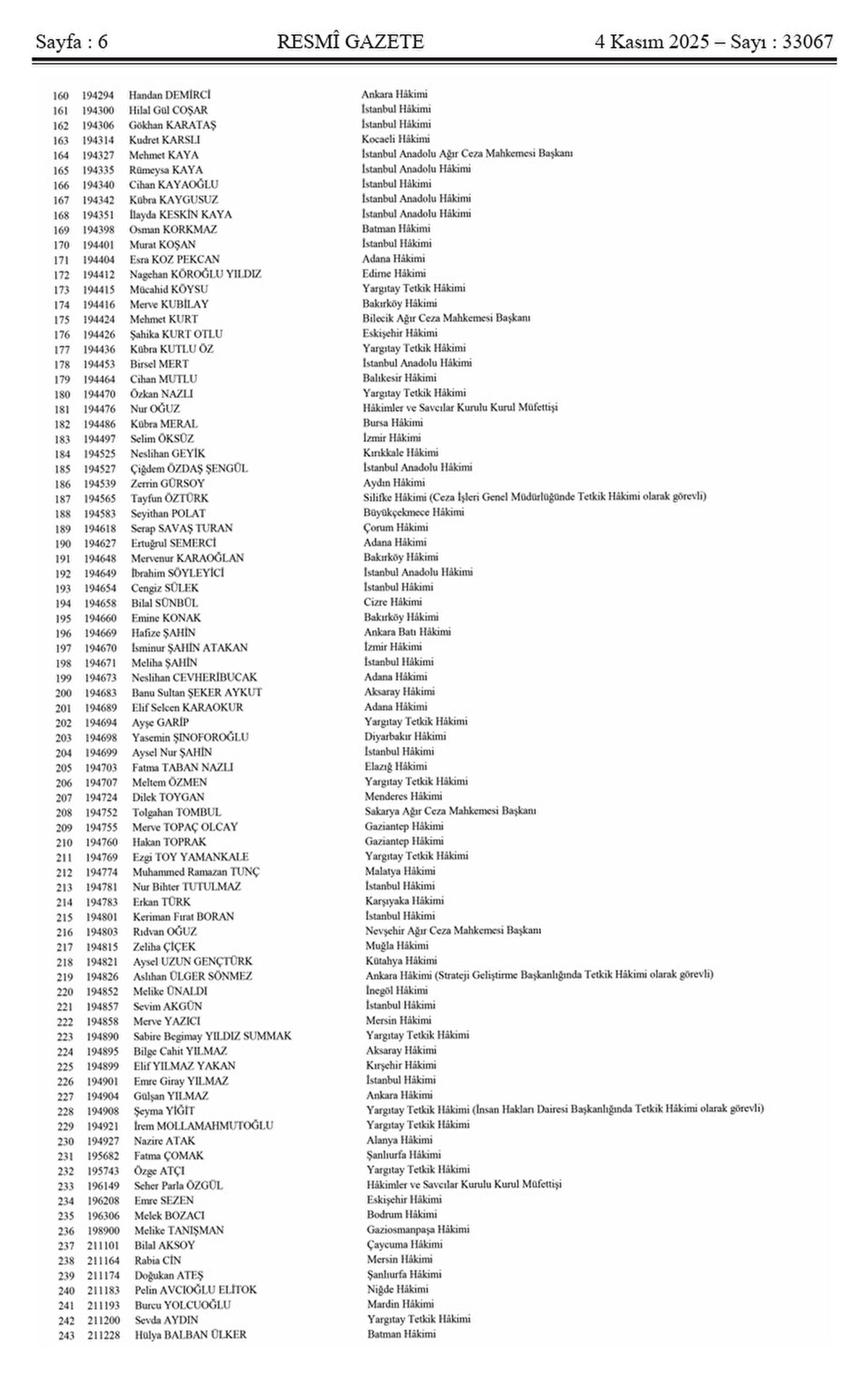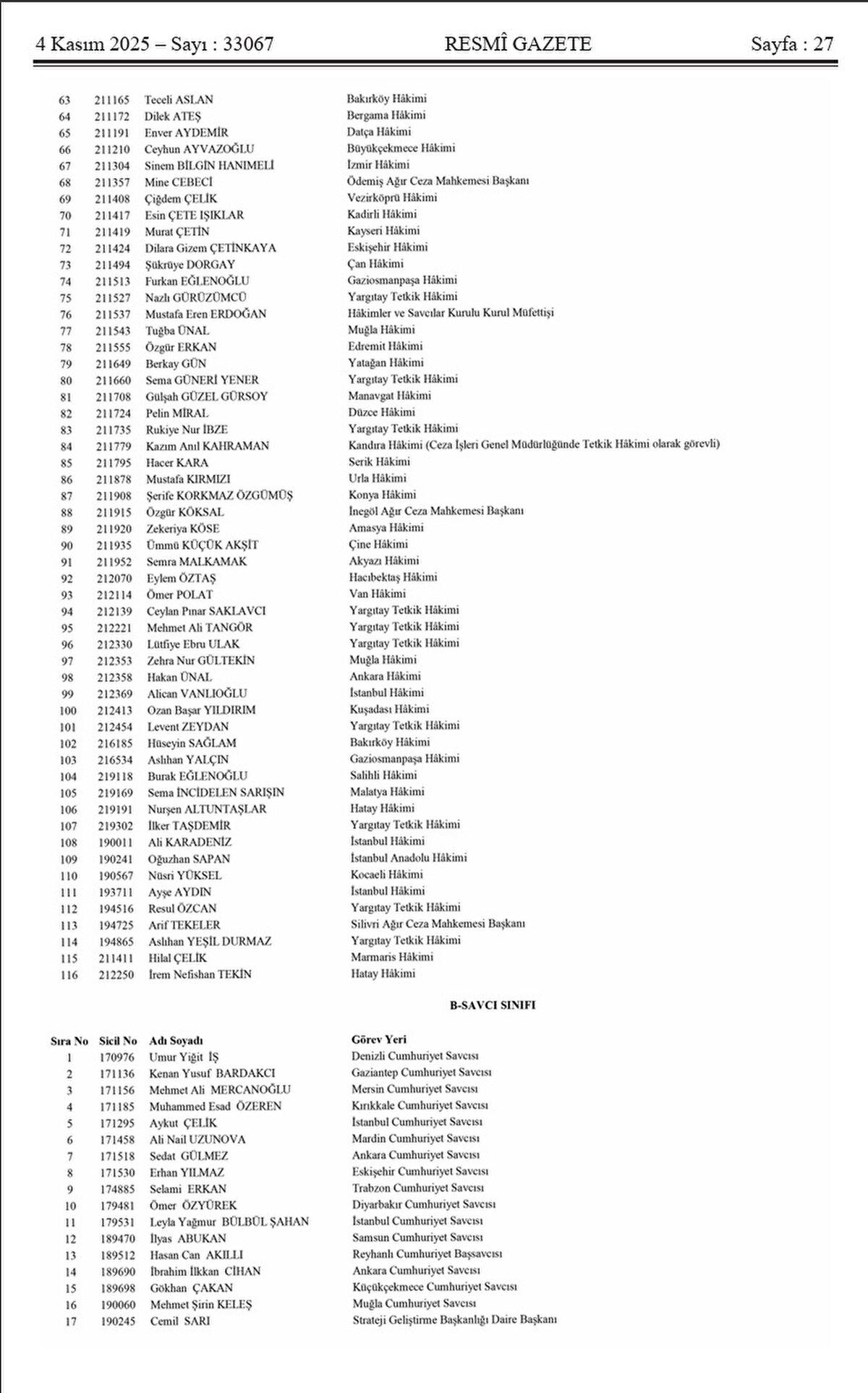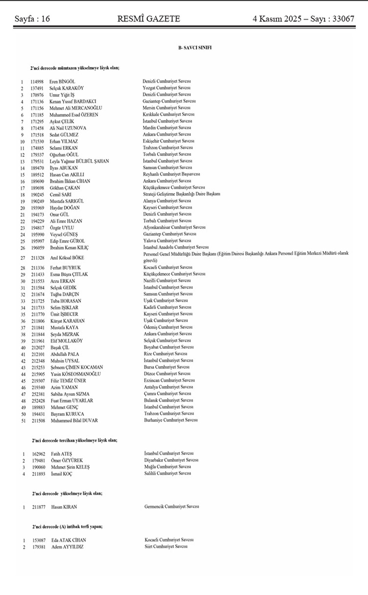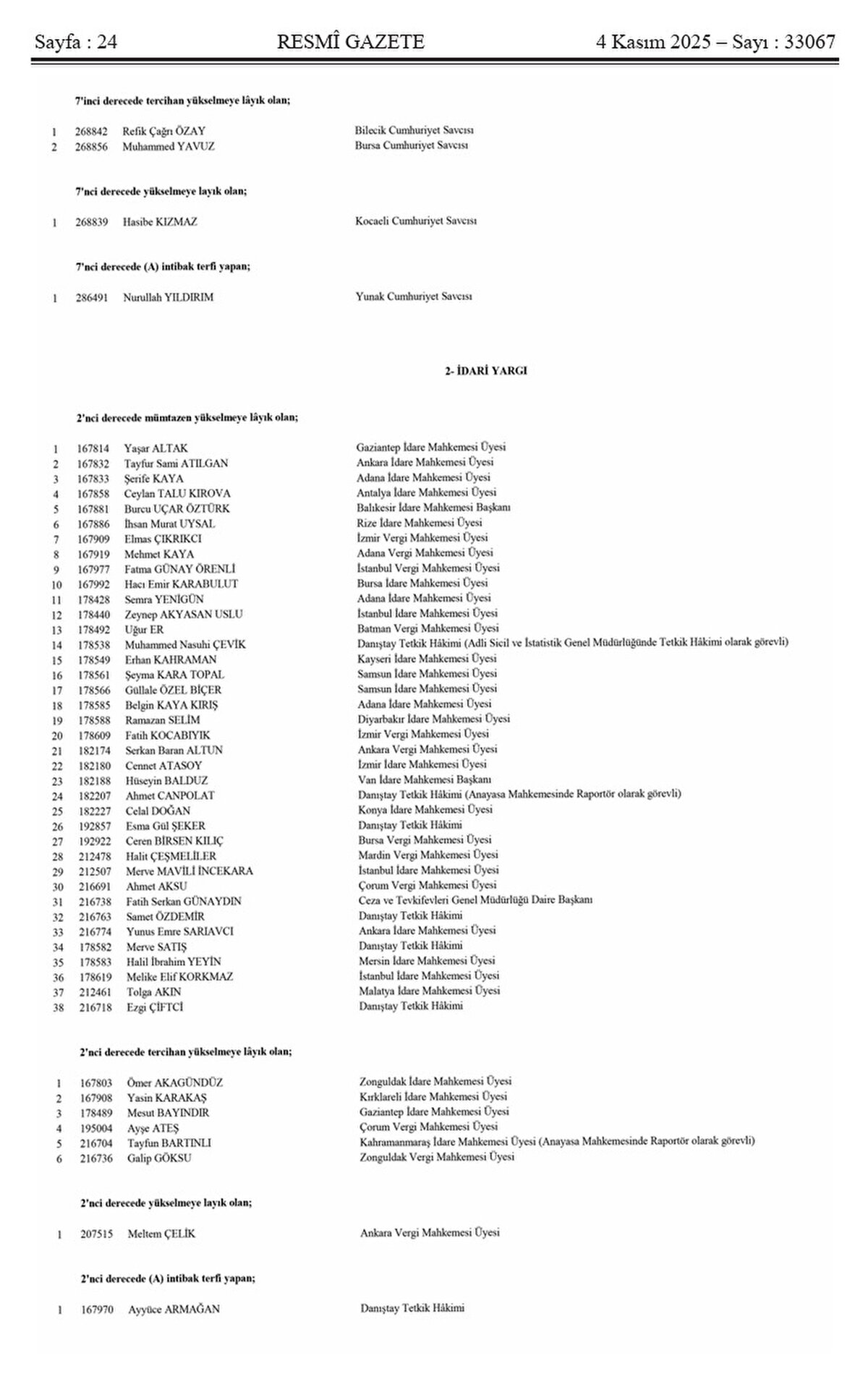 Hakimler ve Savcılar Kurulu'nun (HSK) 2025 Ağustos dönemi kararları Resmi Gazete'de yayımlandı. Karara göre, görev sürelerini tamamlayan 21 adli yargı hakimi, ikinci derecede mümtazen yükselmeye layık görüldü.