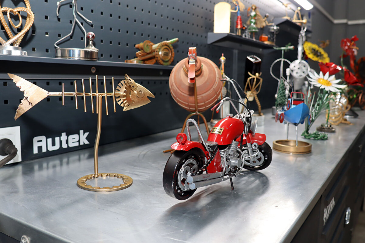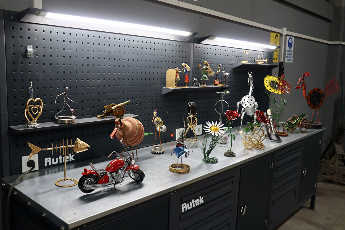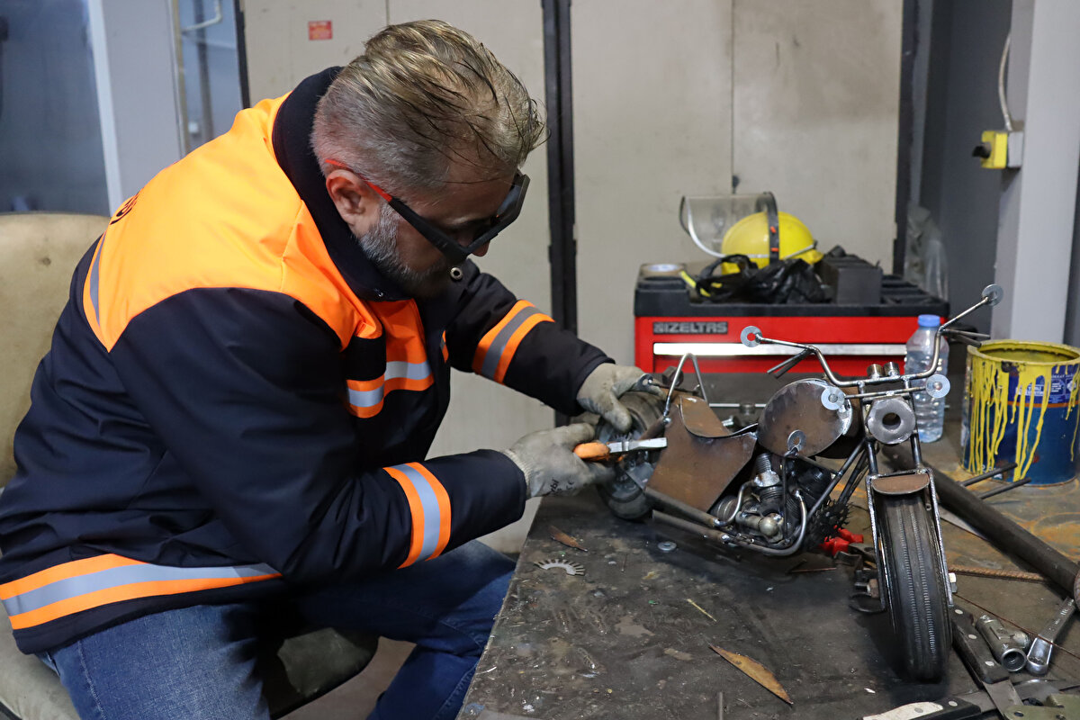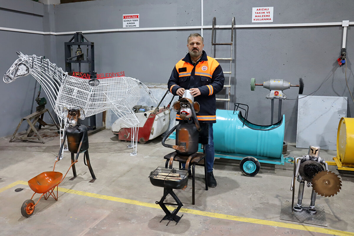 Keşan Belediyesi Destek Hizmetleri Müdürlüğü’nde görevli olan ve araç tamiri yapan Mustafa Özdemir, işinden arda kalan zamanlarda atık malzemeleri işleyerek ve hurda metallere şekil vererek minyatür eserlere dönüştürüyor.
