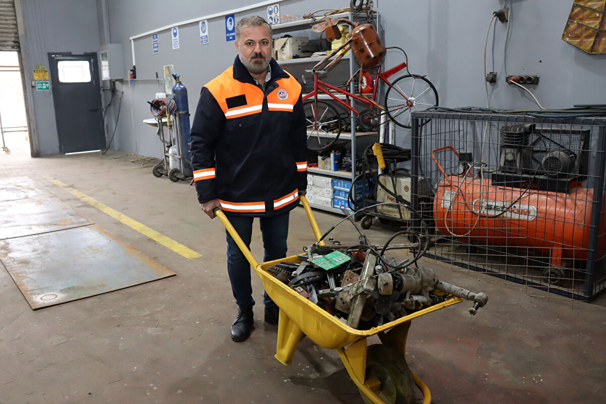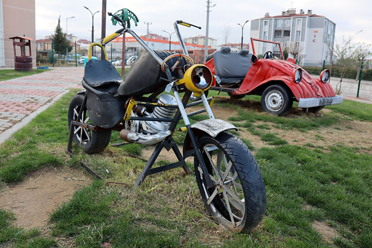 Malzeme olarak atık zincir, dişli, sac gibi parçalar kullandığını ifade eden Özdemir, "Boya haricinde tüm malzemeleri kendi atölyemizden temin ediyoruz. Daha önce lastik geri dönüşümü üzerine çalışıyordum.