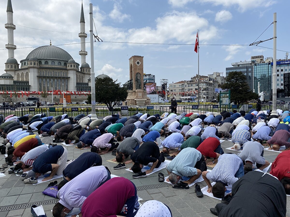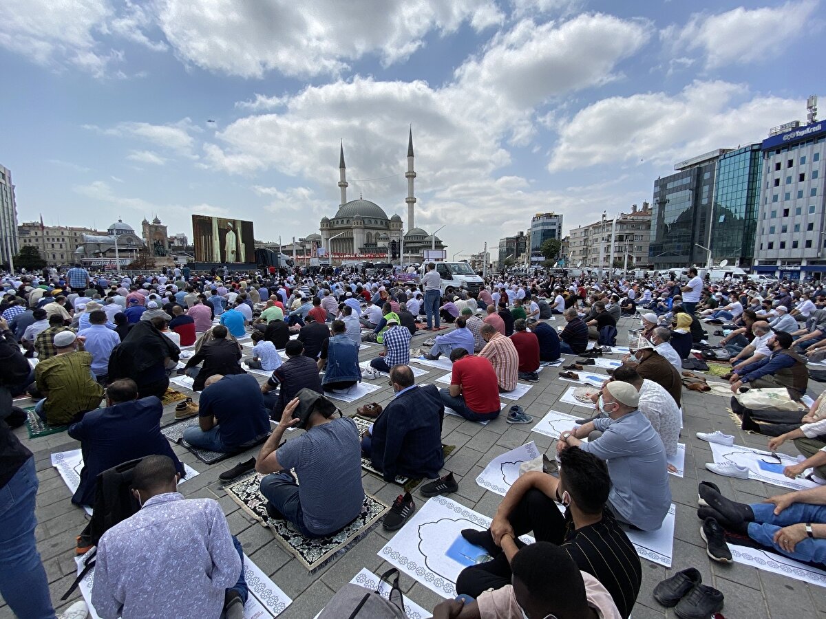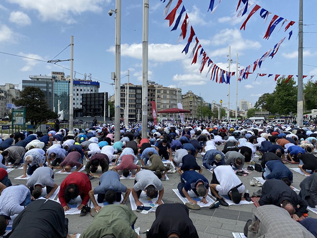 İlk namazı Taksim Camisi’nde kılmak isteyen vatandaşlar cami çevresini doldurdu. Diyanet İşleri Başkanı Ali Erbaş cuma hutbesi okudu. Ardından cuma namazını kıldırdı