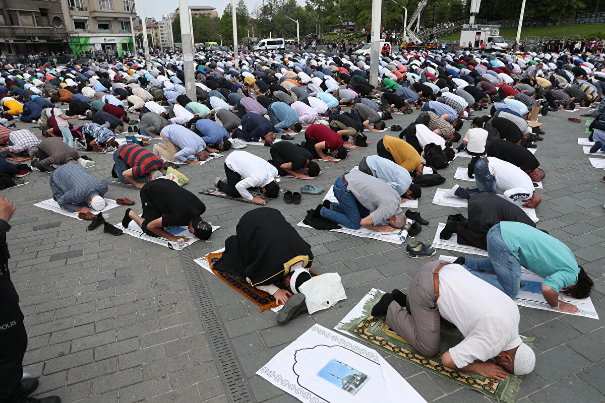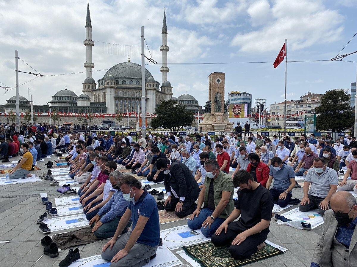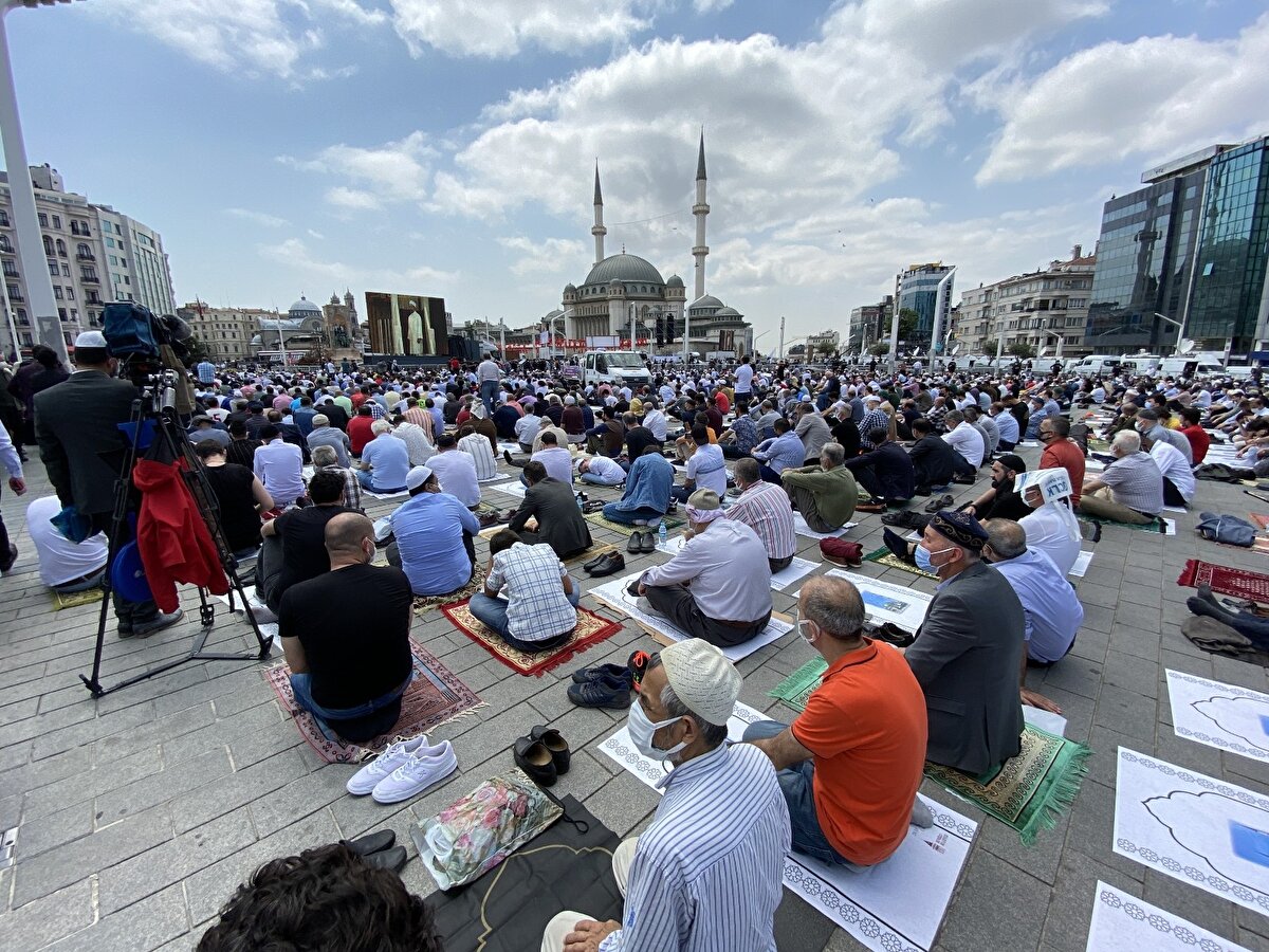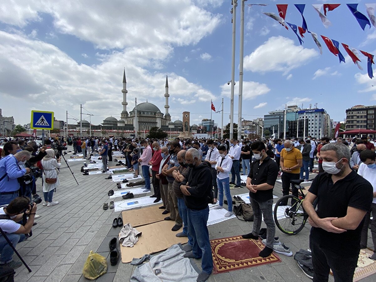 İlk namazı Taksim Camisi’nde kılmak isteyen vatandaşlar cami çevresini doldurdu. Diyanet İşleri Başkanı Ali Erbaş cuma hutbesi okudu. Ardından cuma namazını kıldırdı