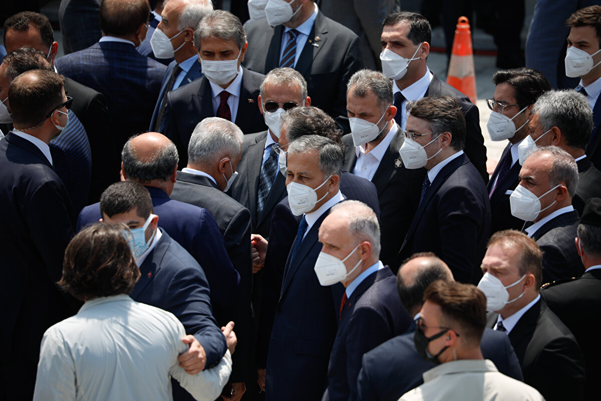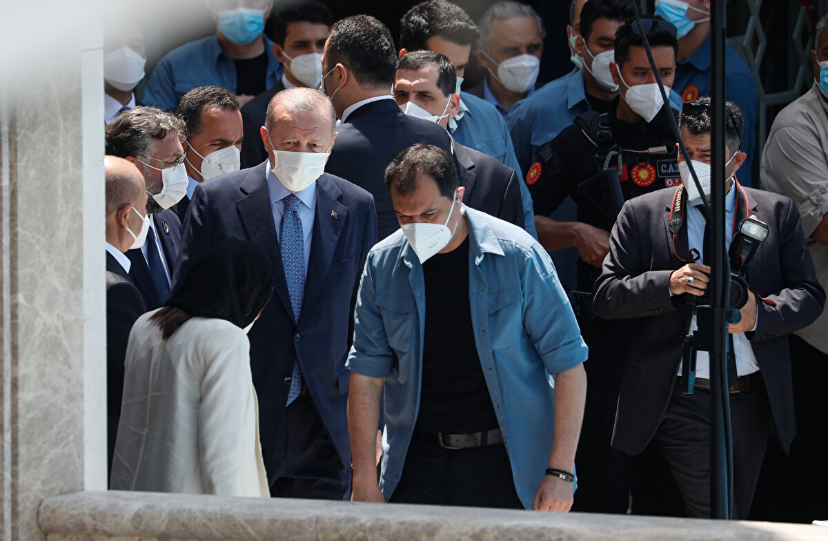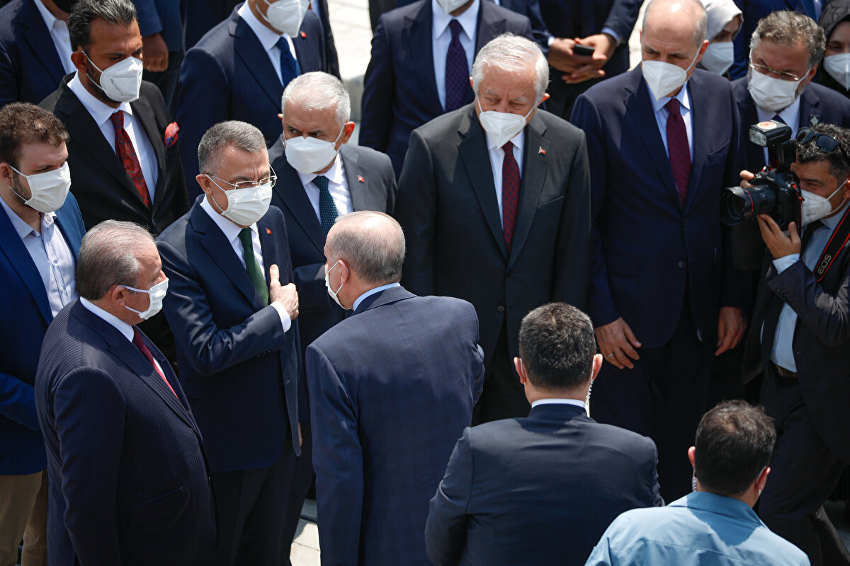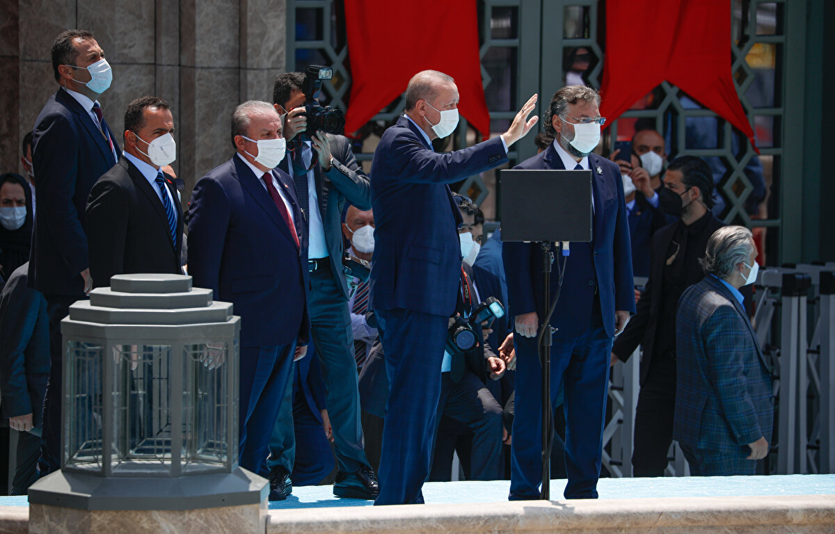 Erdoğan’ı cami girişinde, Cumhurbaşkanı Yardımcısı Fuat Oktay, Cumhurbaşkanlığı Sözcüsü İbrahim Kalın, Kültür ve Turizm Bakanı Mehmet Nuri Ersoy, AK Parti Genel Başkanvekili Binali Yıldırım ve çok sayıda protokol üyesi karşıladı.