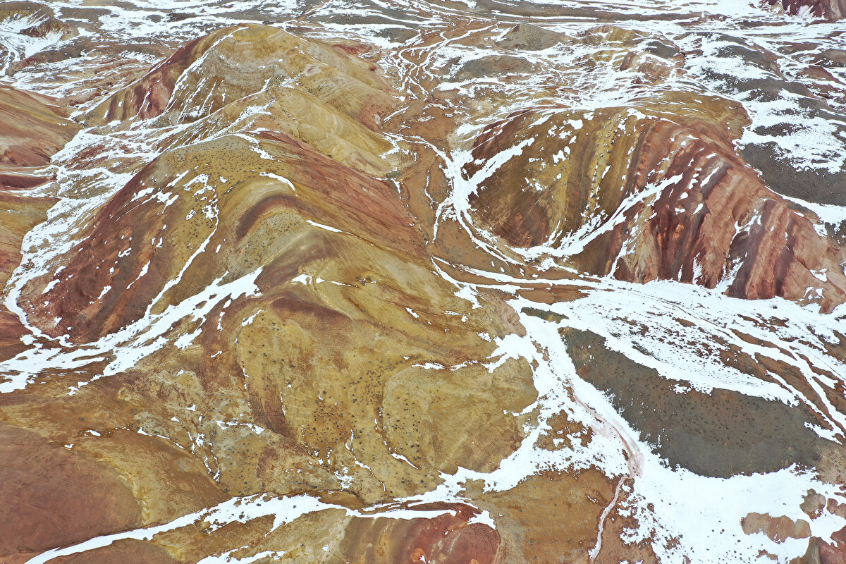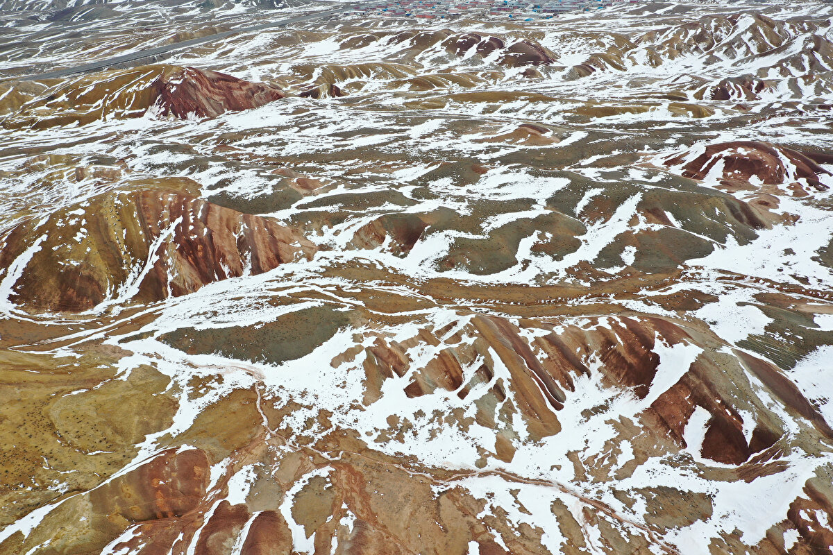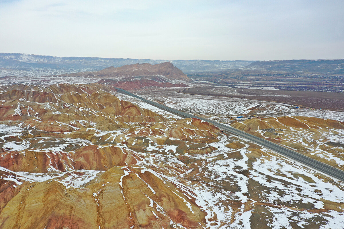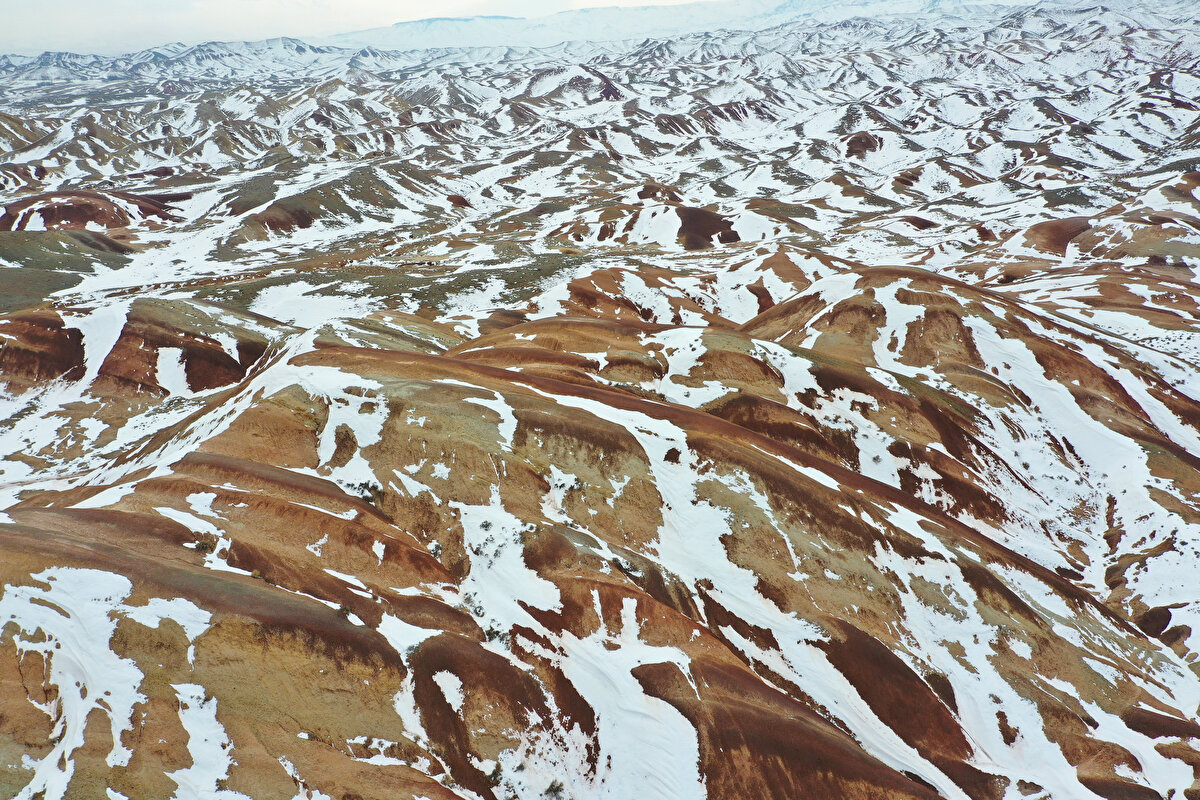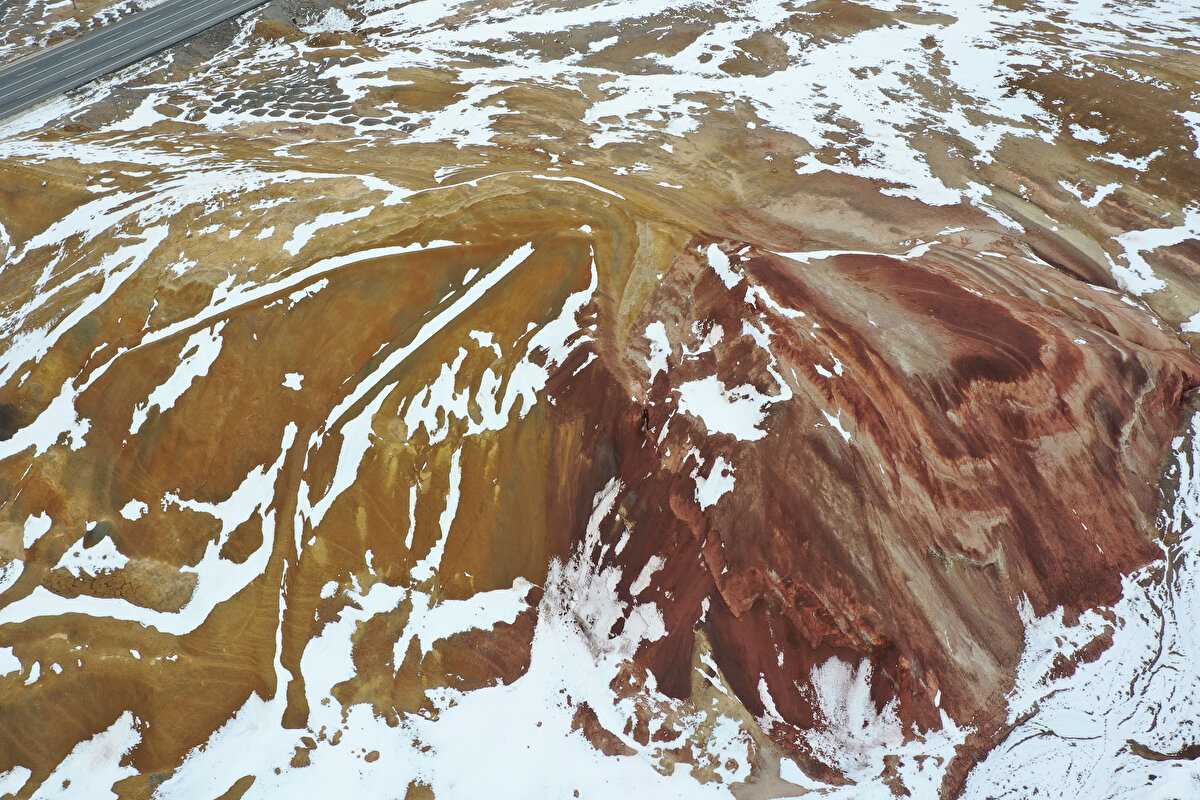Iğdır'da bulunan Gökkuşağı Tepeleri, yer yer karla kaplı görüntüsüyle adeta renk paletini andırıyor.