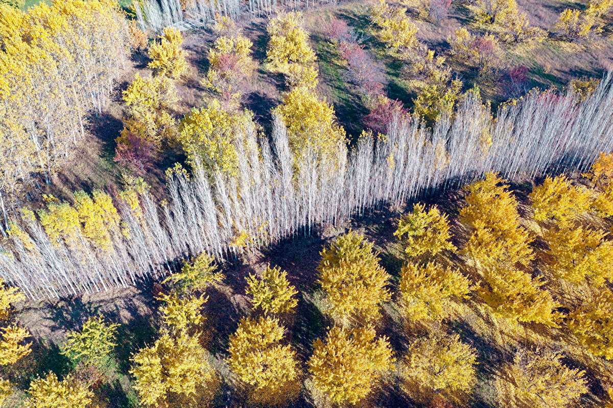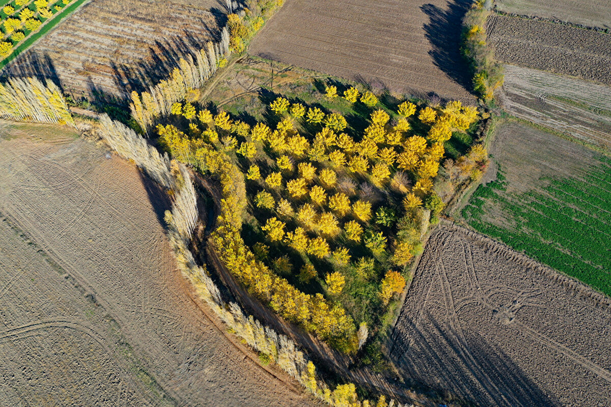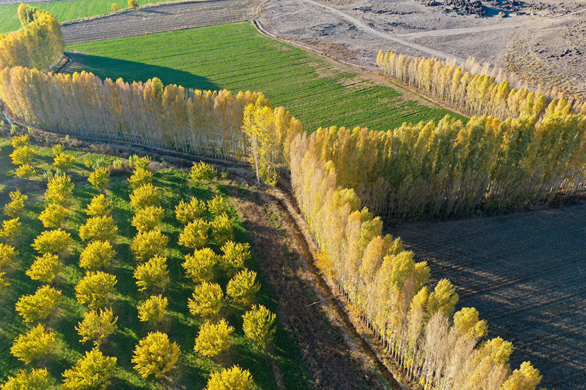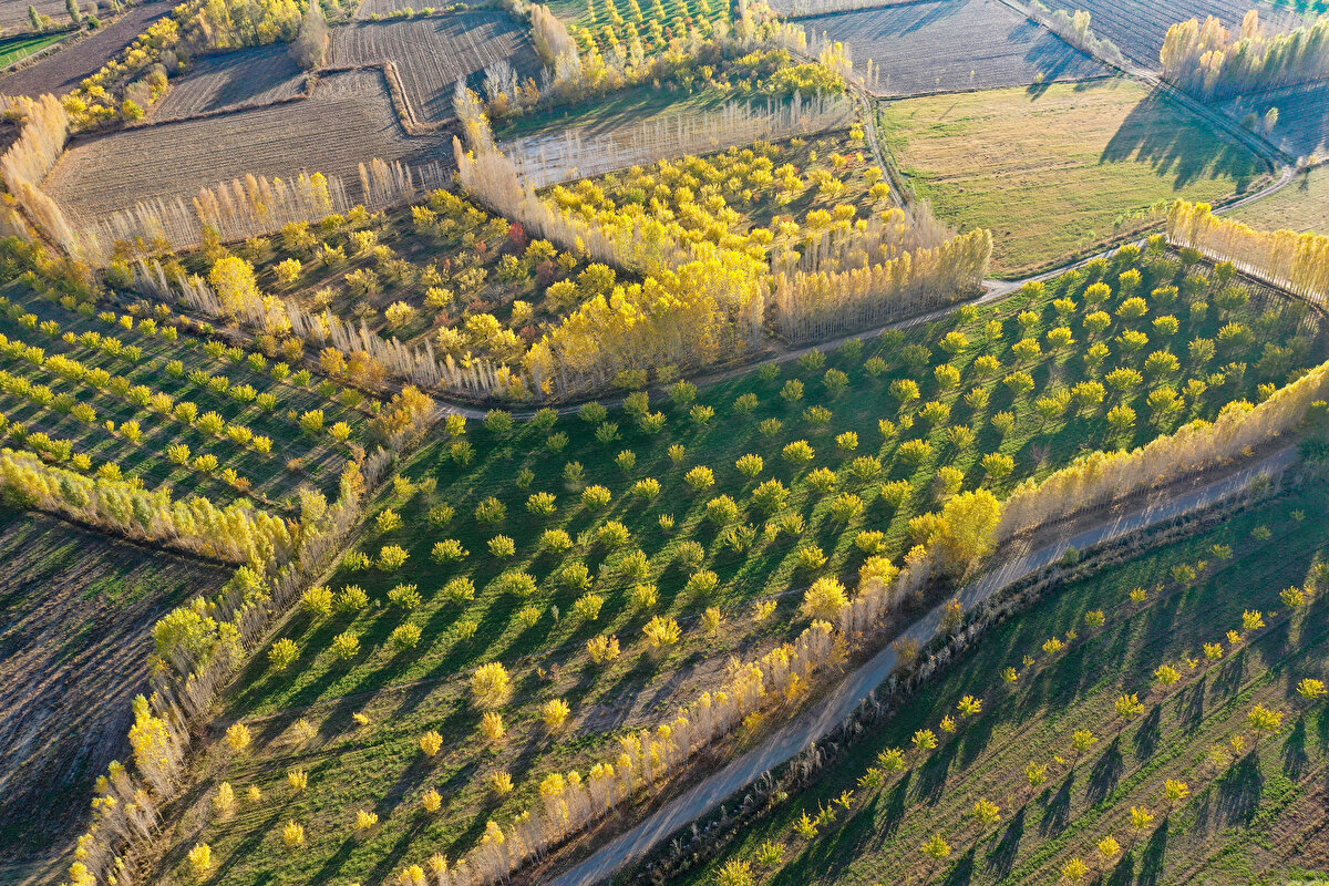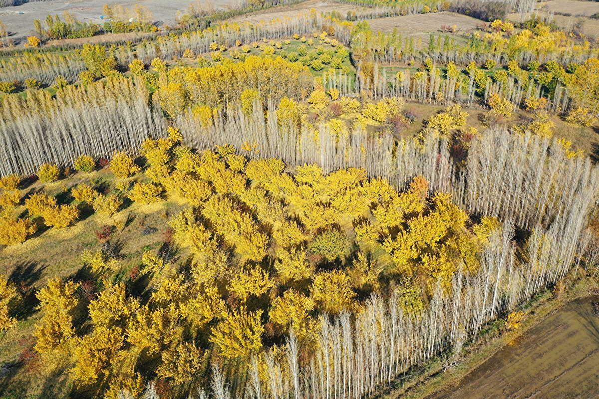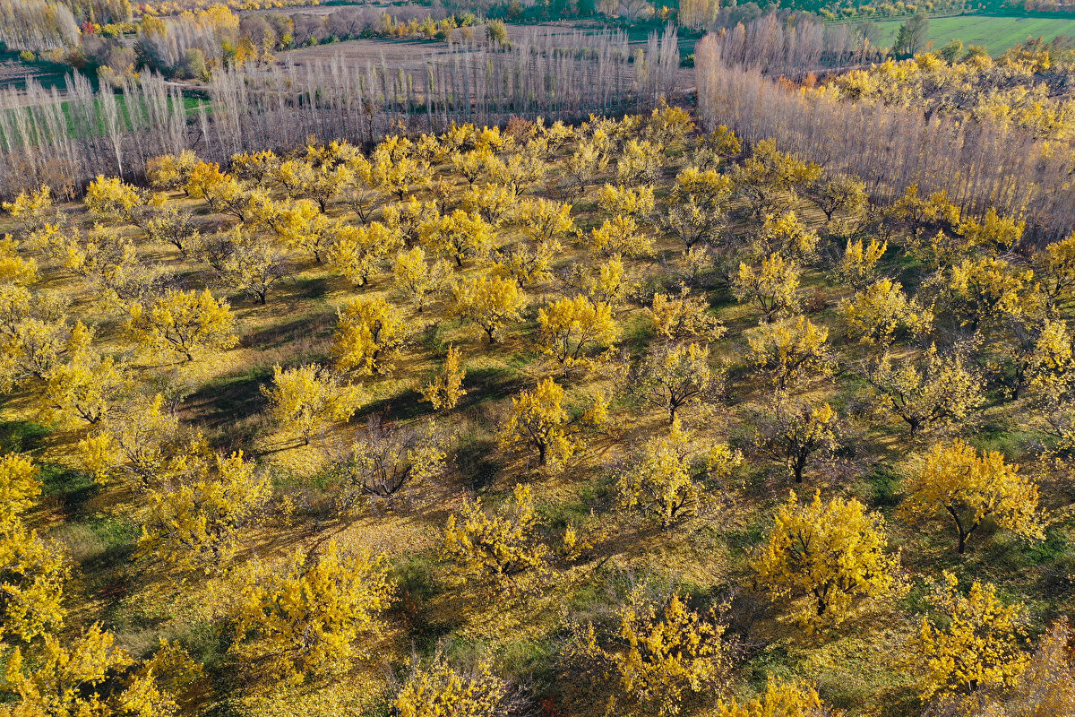 Sonbahar renklerine bürünen İrem Bağları, AA ekibince dronla görüntülendi.