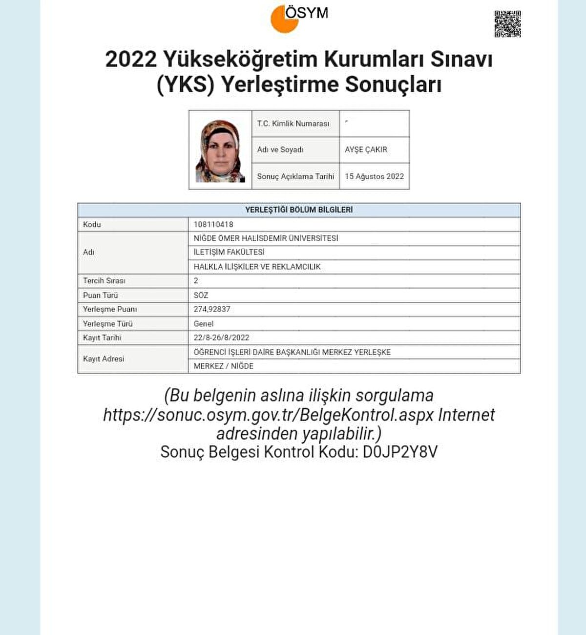Yıllardır özlemini çektikleri üniversite hayatını tatmak isteyen çift, yaptıkları hazırlık ardından Yükseköğretim Kurumları Sınavı'na (YKS) girdi. Ayşe Çakır, 274.92, Mahmut Çakır ise 267.65 puan aldı.